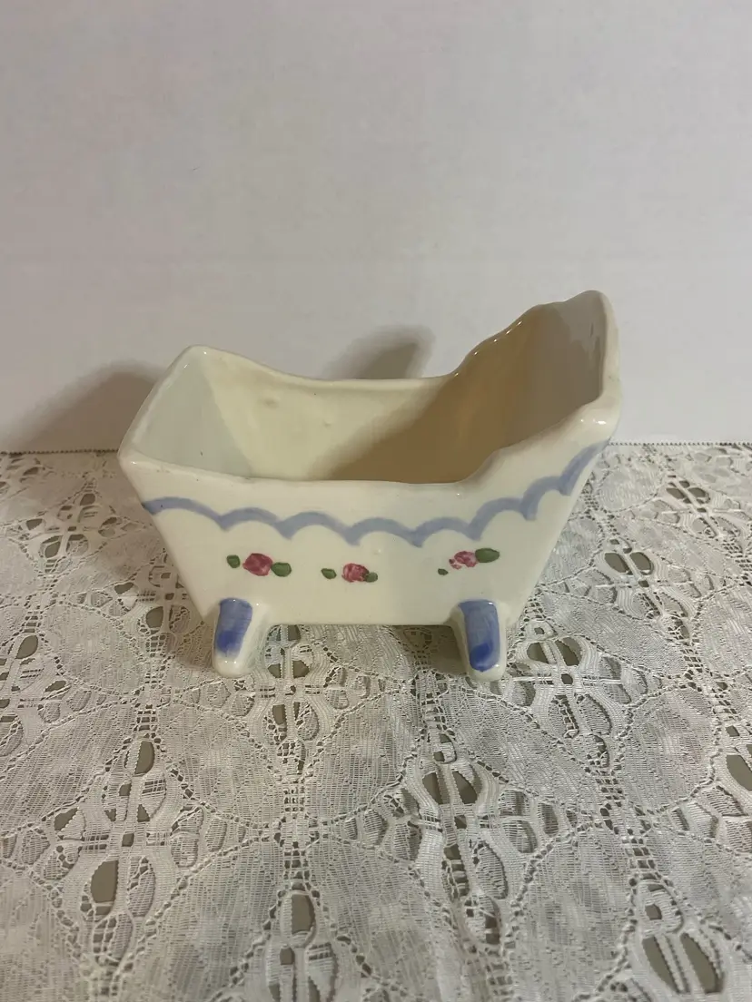 Adorable vintage ceramic planter shaped like a baby cradle, featuring delicate floral designs. Perfect for adding charm to your home or garden.