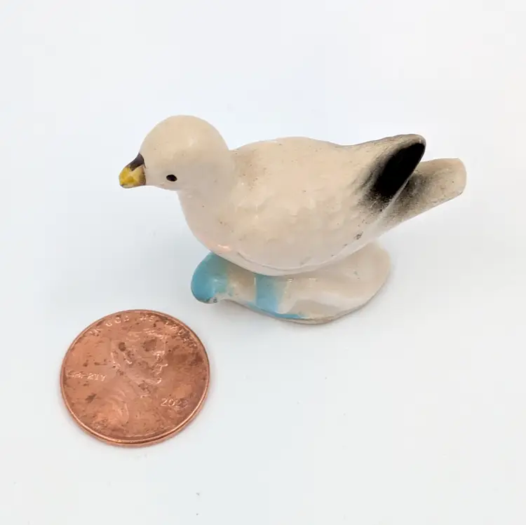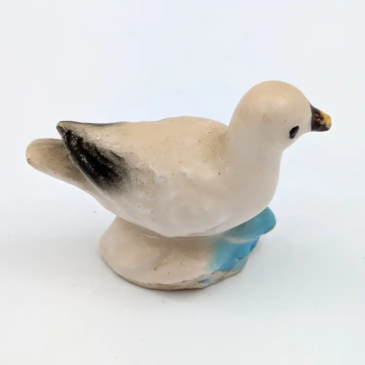 Charming vintage ceramic bird figurine with a subtle splash of blue and black accents. No chips or crack, paint is a bit worn.