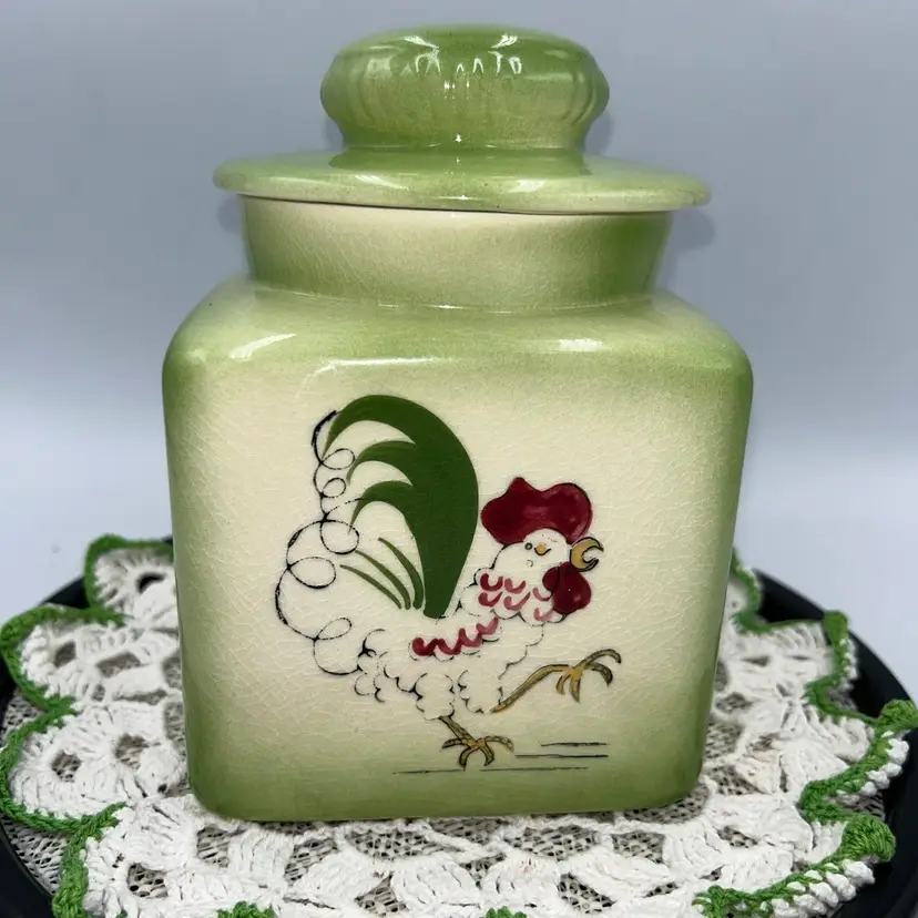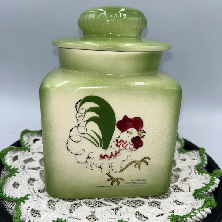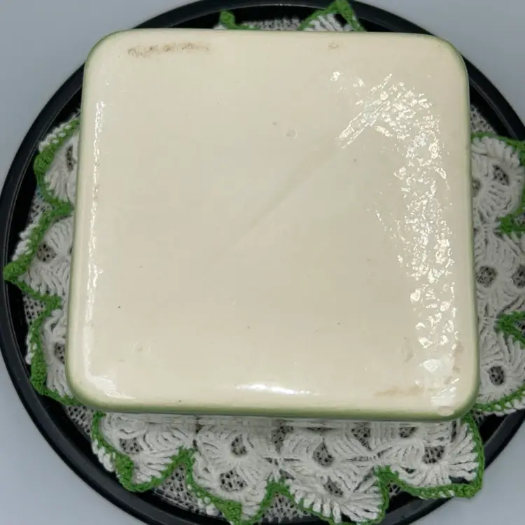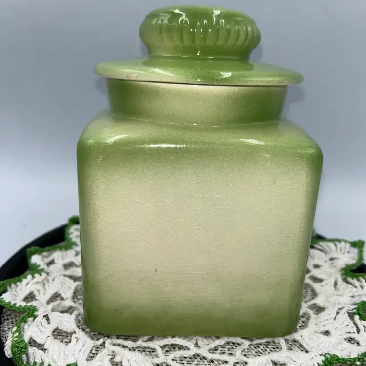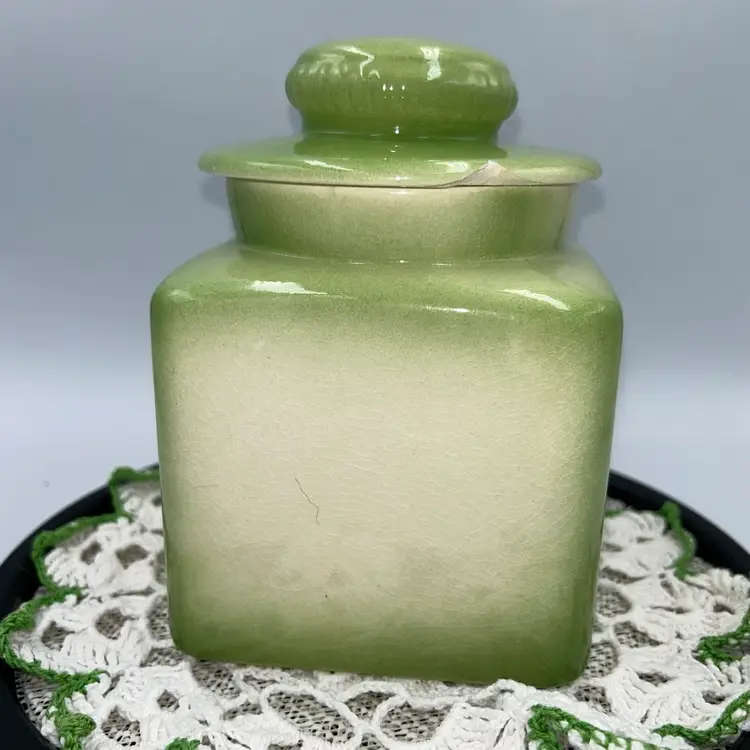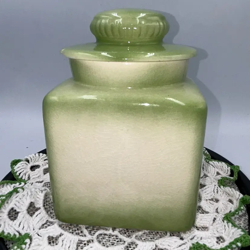 Square canister in a green fade to cream glaze. Round lid. Best used for dry goods. Chip on lid, see photo. Otherwise in great condition. 6.5” tall with lid, 6” tall without lid, square sides are 4” square, each. No markings.