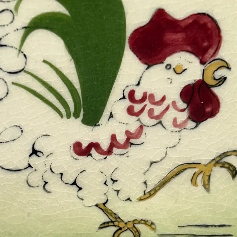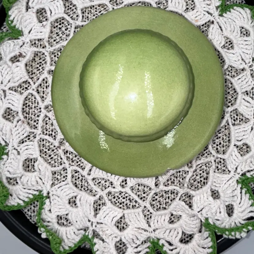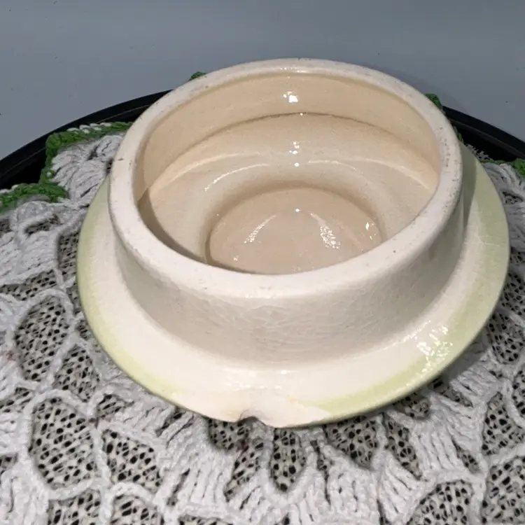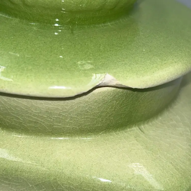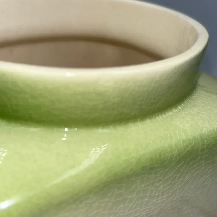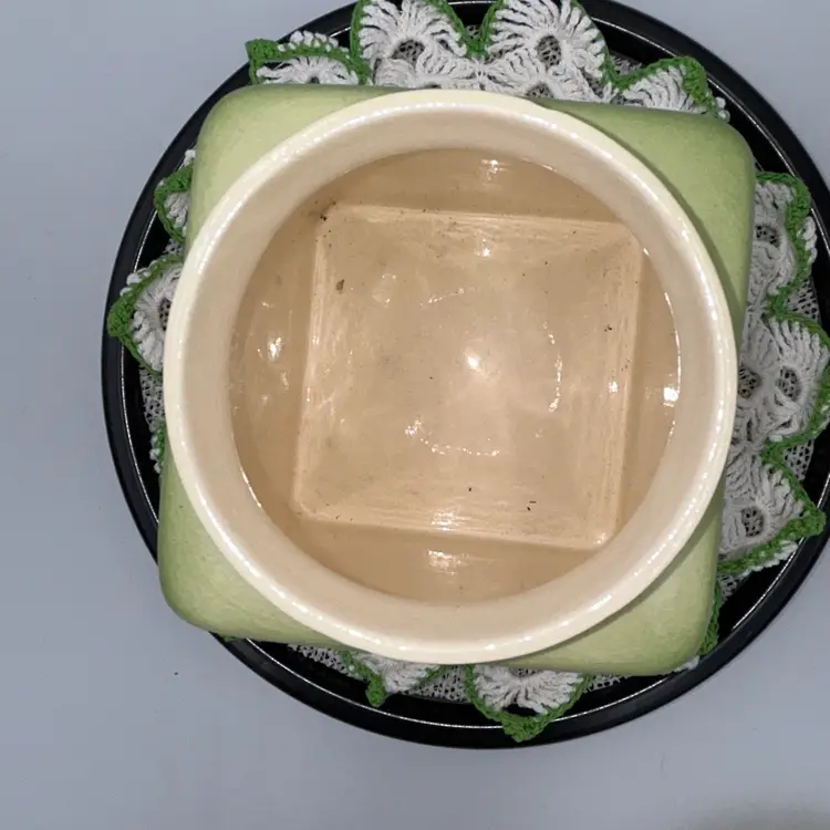 Square canister in a green fade to cream glaze. Round lid. Best used for dry goods. Chip on lid, see photo. Otherwise in great condition. 6.5” tall with lid, 6” tall without lid, square sides are 4” square, each. No markings.