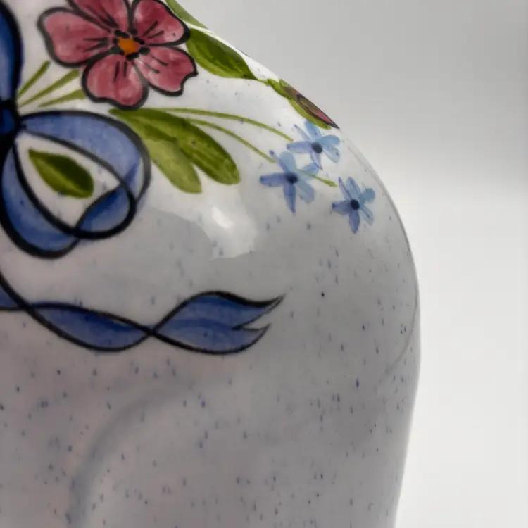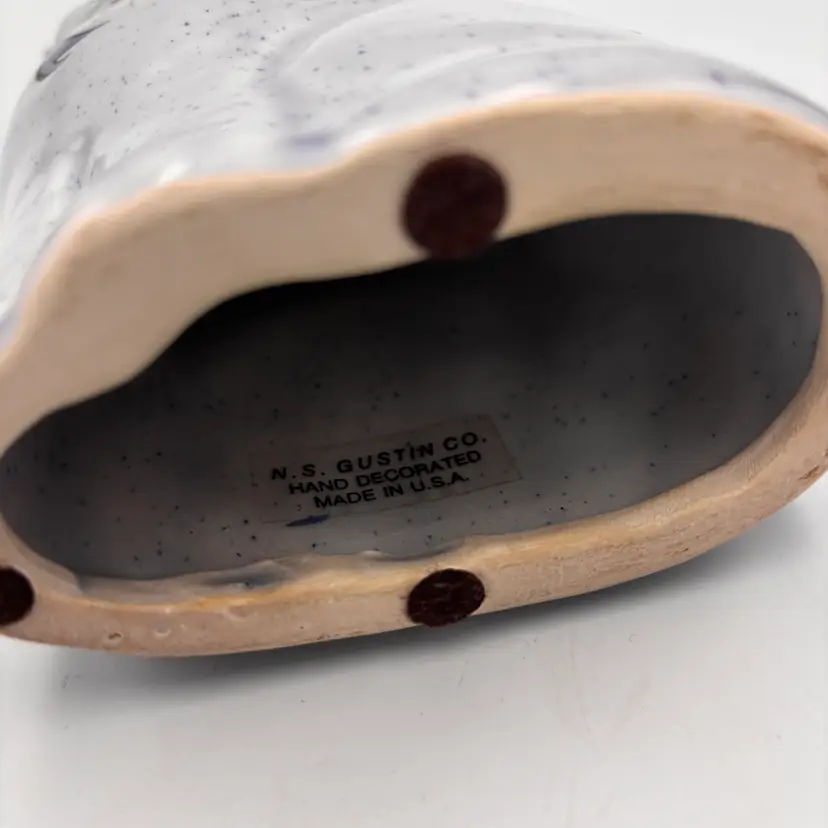 Features: it is handpainted with flowers in a red bough. The underside has the sticker "N.S. Gustin Co Hand Decorated Made in USA" The overall color is white with specks of blue.