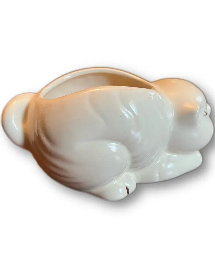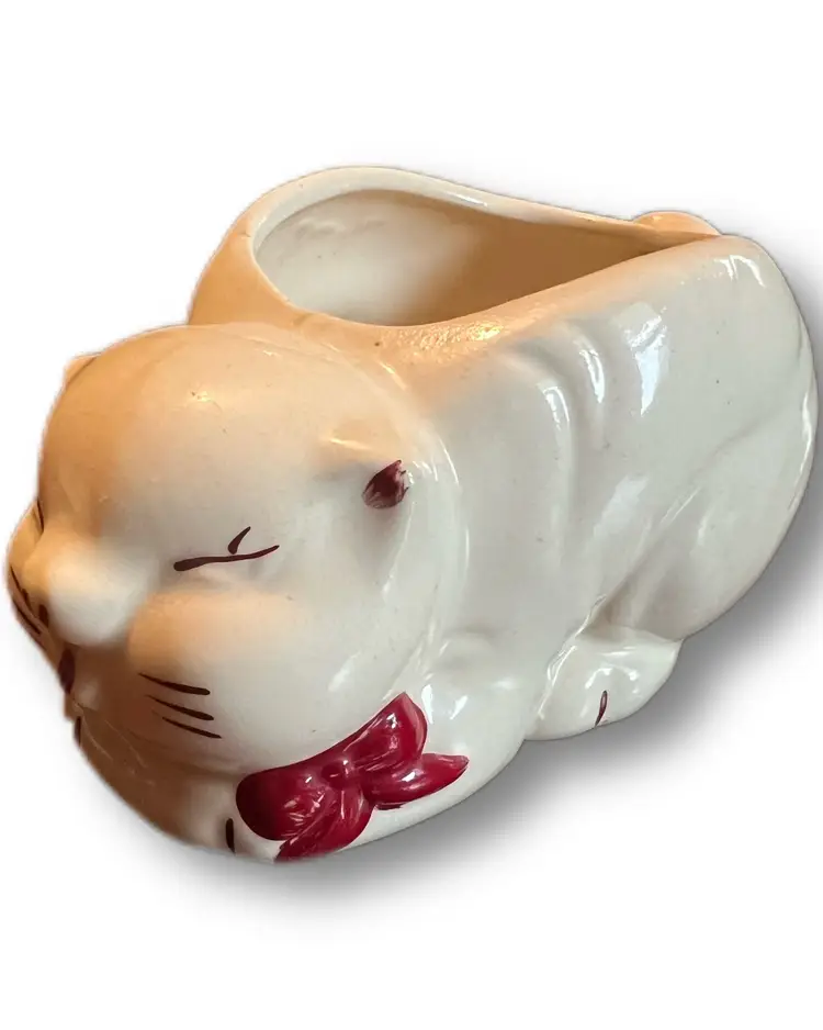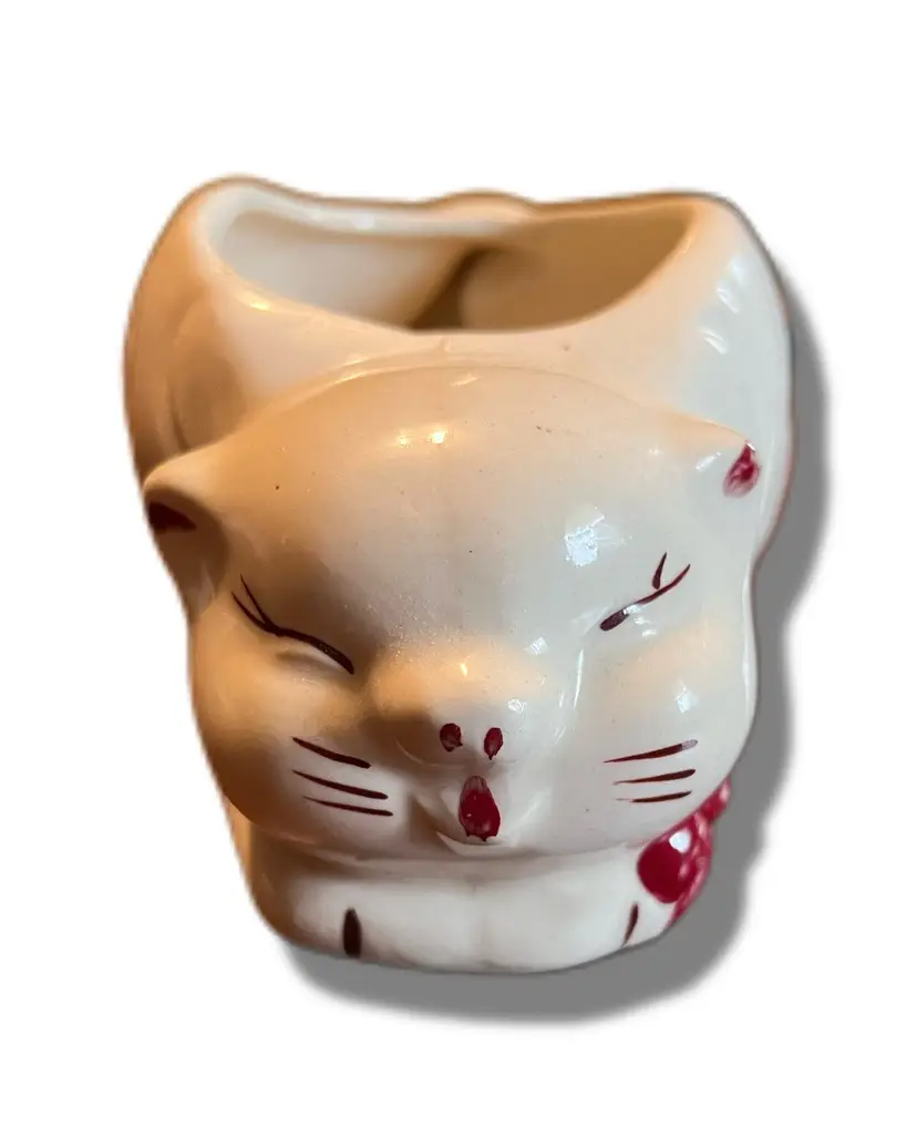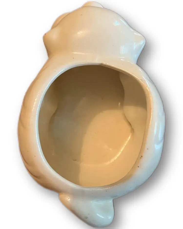 Measures 6.5x3.75” This is commonly thought to be made by Shawnee, but Shawnee did not make a sugar bowl for their ‘Puss N Boots’ line. However, it does display very nicely if you have this particular Shawnee collection. Could also be used as a planter No chips or cracks