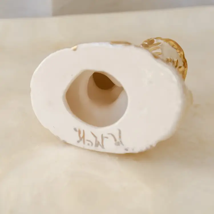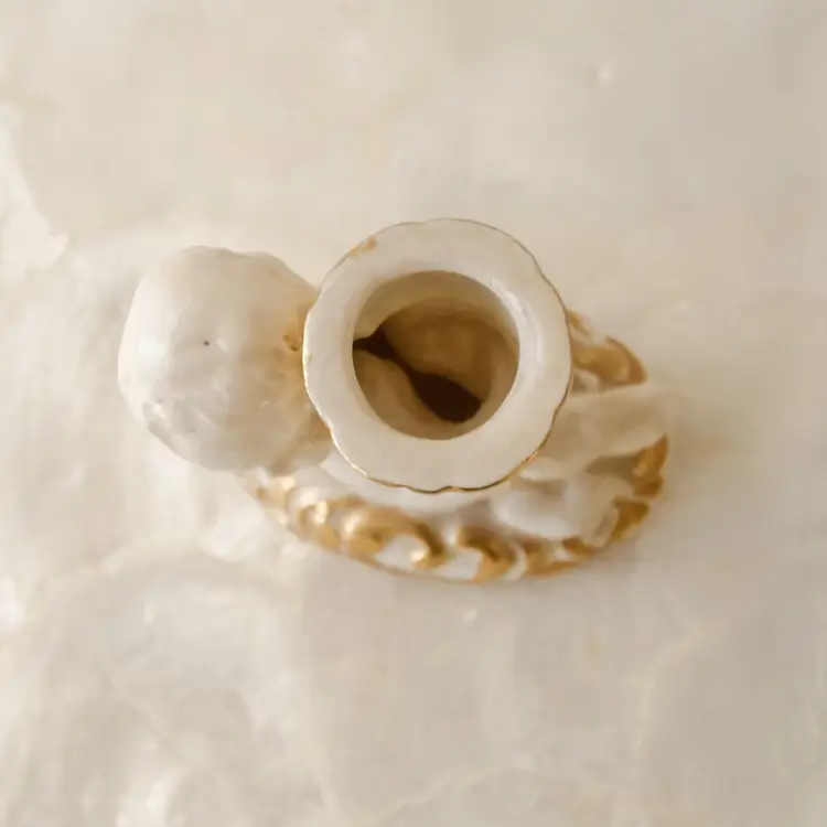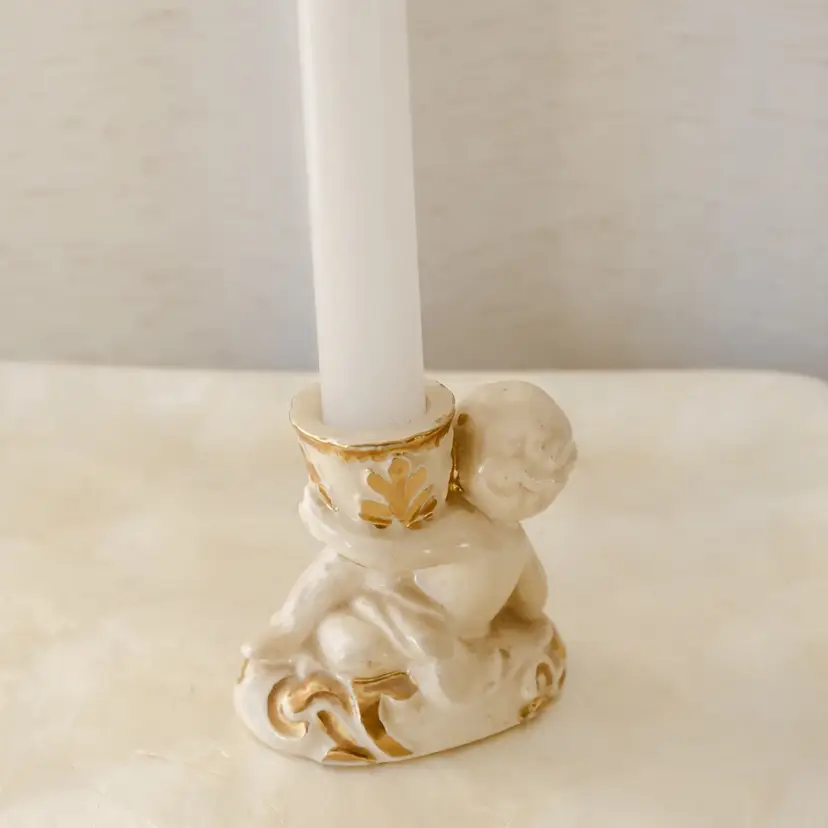 This vintage ceramic candle holder features a cute cherub baby angel design, perfect for any occasion. The small size and glossy finish make it a kitschy addition to any collection. Handmade in the United States in 1967, this original piece is a unique example of mid-20th century romanticism.