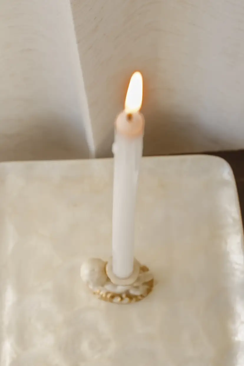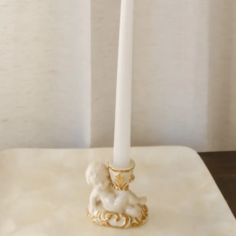 The cream color and cherub pattern make it a perfect subject for a baby-themed room or a romantic setting. This candle holder is a one-of-a-kind item that will add character to any space.