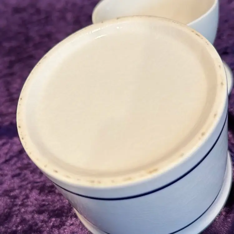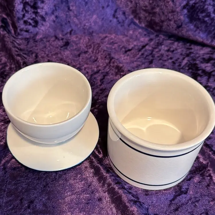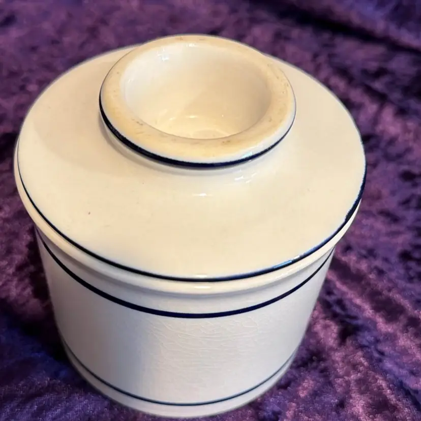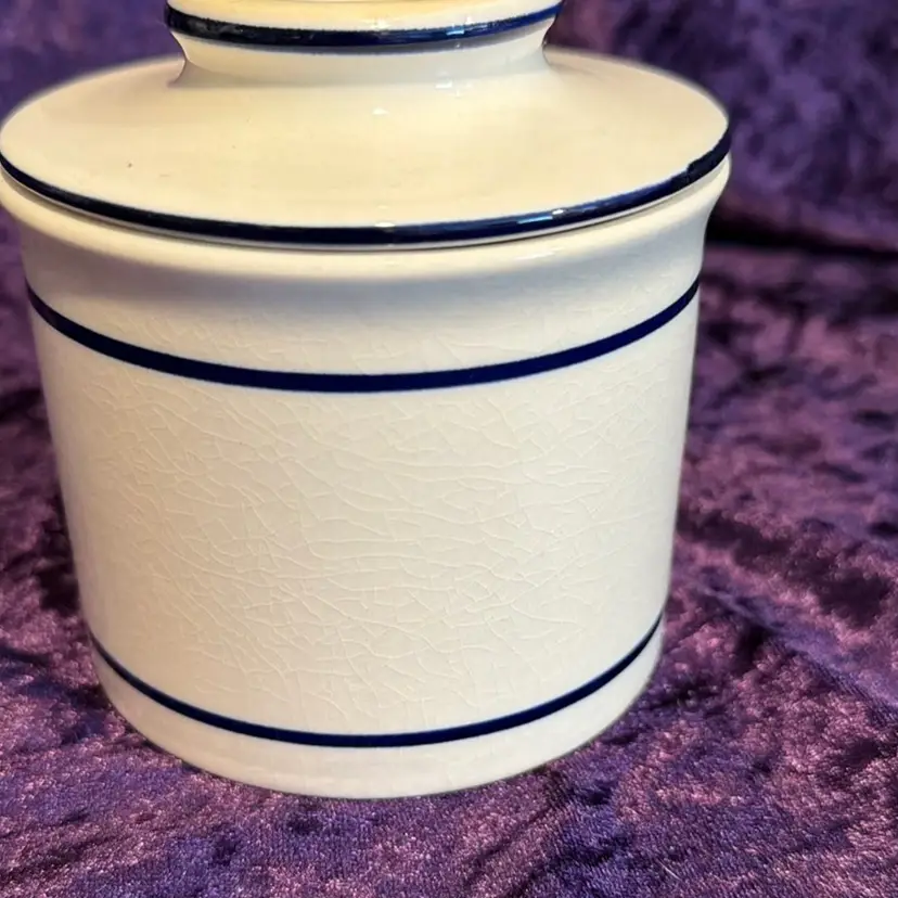 Vintage Ceramic Country Butter Keeper Crock Bell White Blue Accents. Beautiful aging and crazing. Approximately 4” tall.