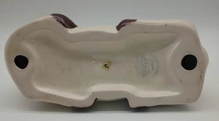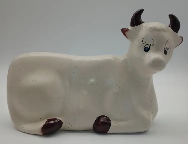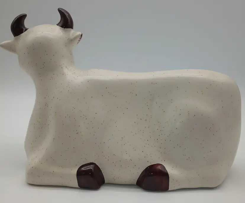 Charming vintage ceramic cow figurine with a speckled finish and adorable facial features. Perfect for adding a touch of whimsy to your decor or as a delightful collectible piece. Measures approximately 8 inches tall by 11 in wide.