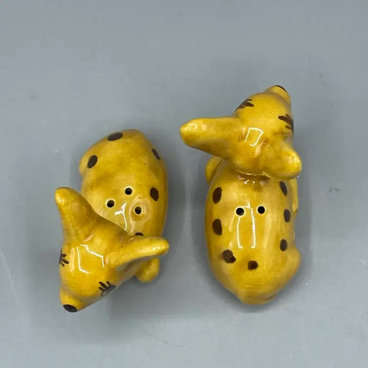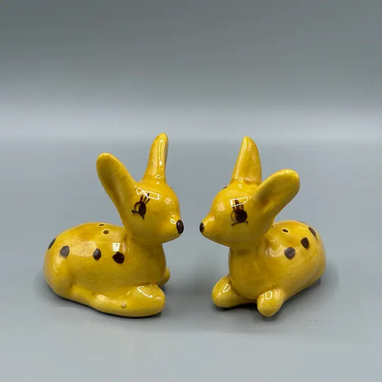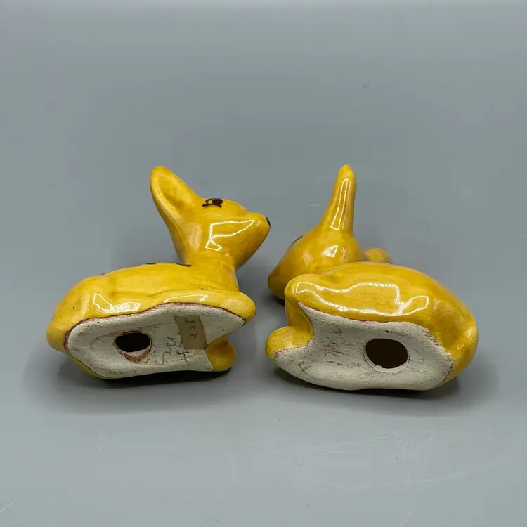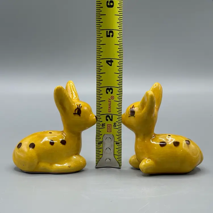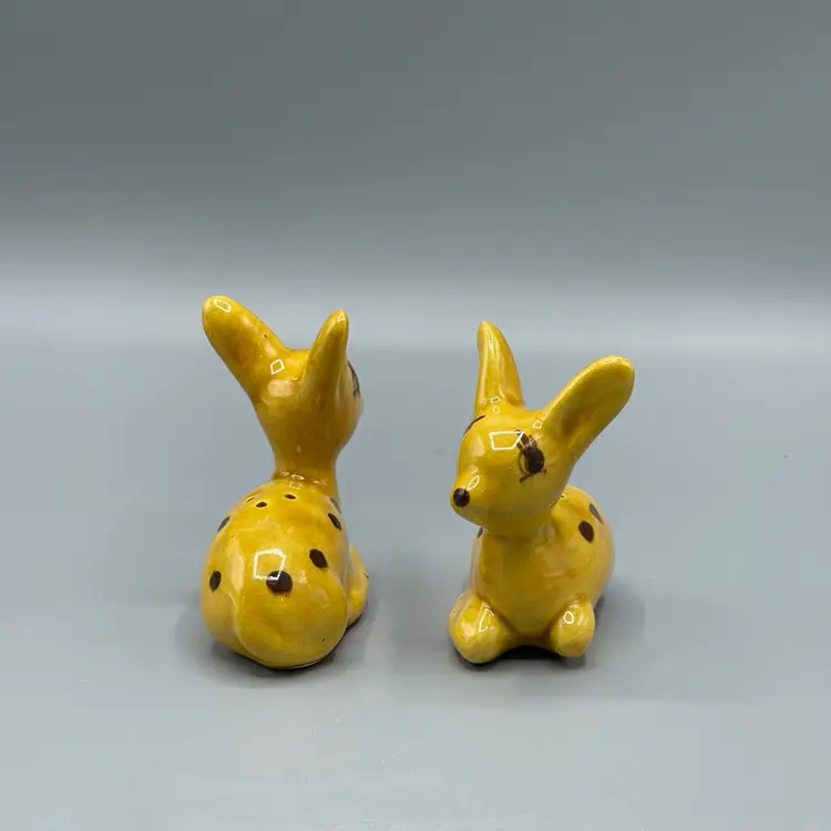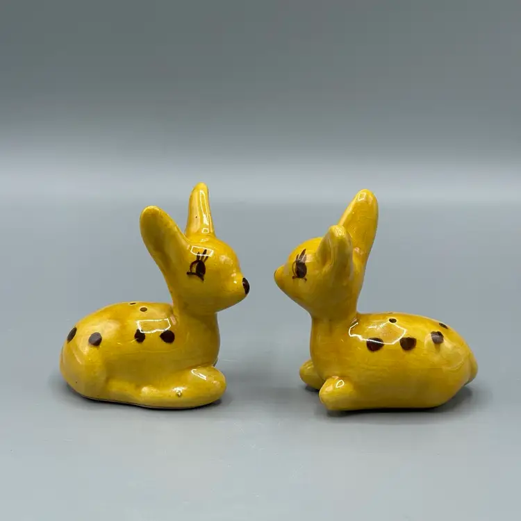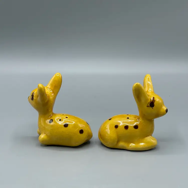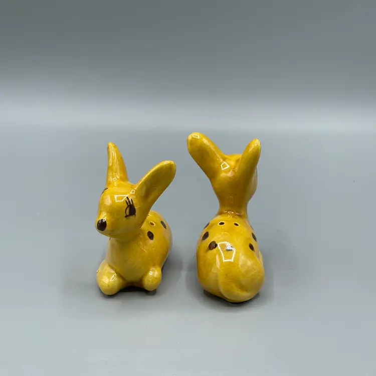 These unique yellow deer fawn shakers would make a wonderful addition to any table, holiday display or collection. There are no chips or cracks and they are about 3-1/4 inches tall at the ears.