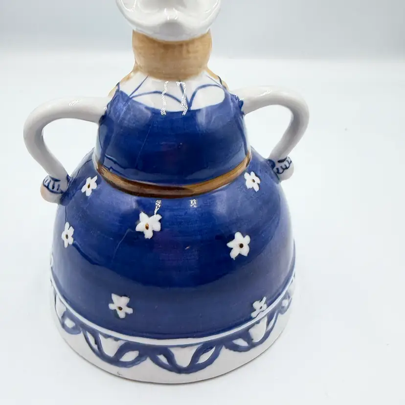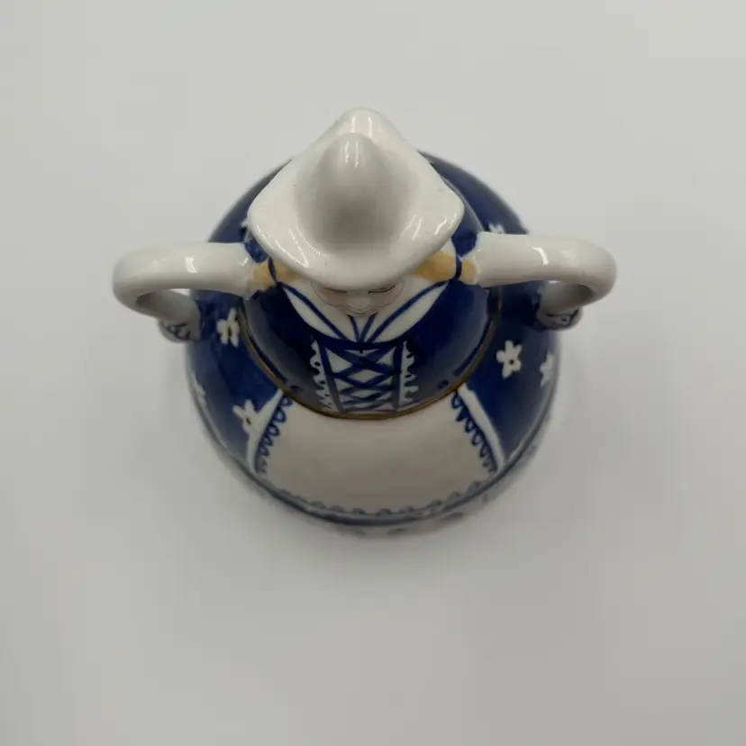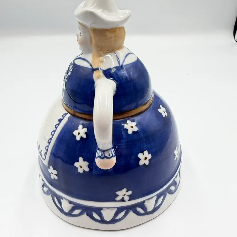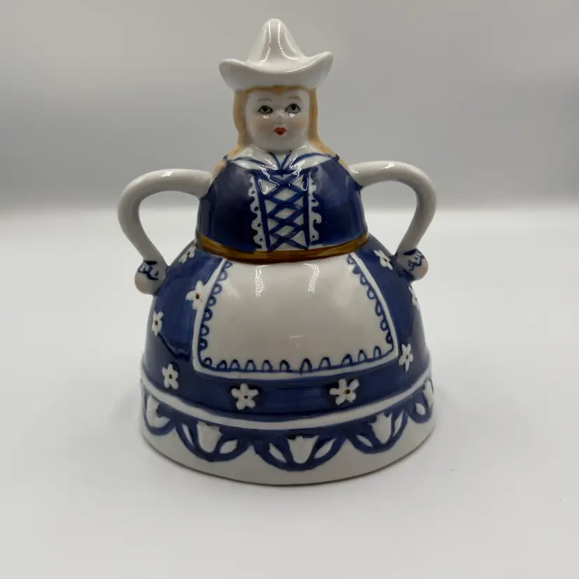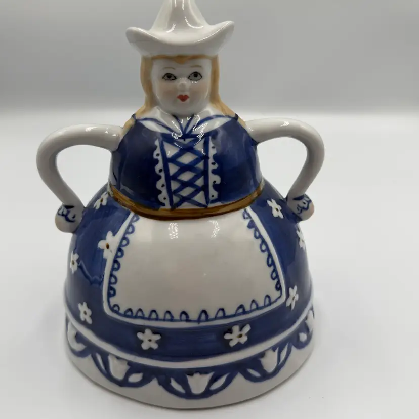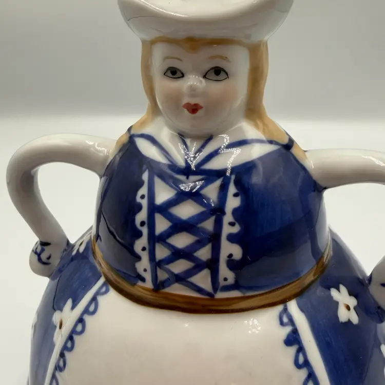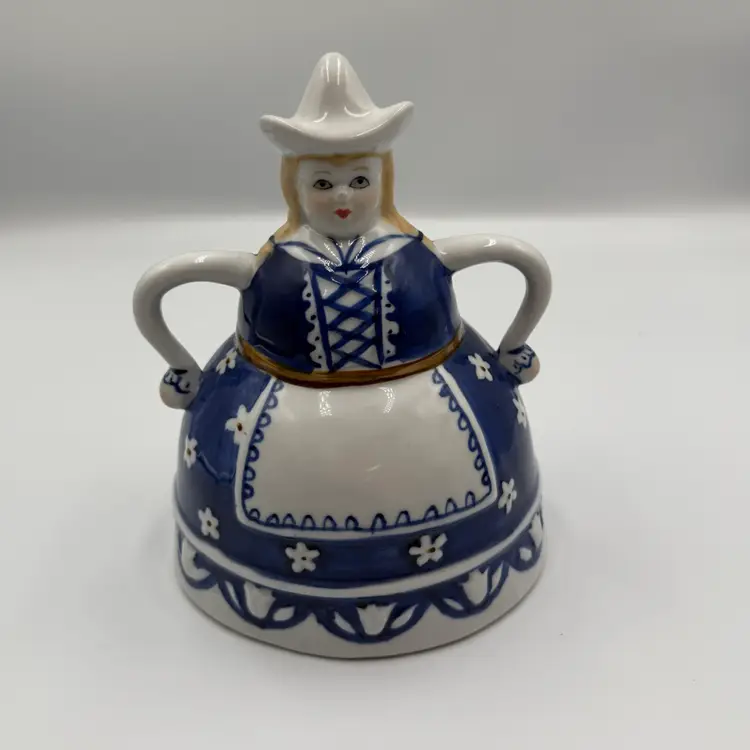 This item is a vintage blue and white ceramic figuring shaped like a women in traditional Dutch attire, styled after Delft pottery