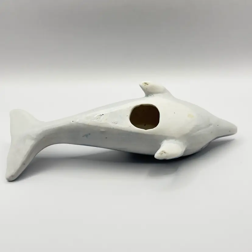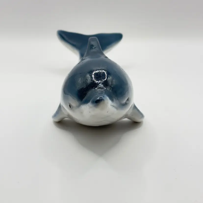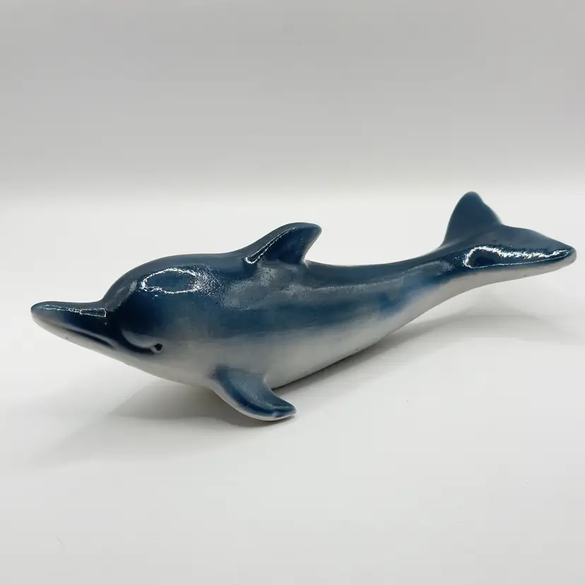 Dive into coastal charm with this vintage ceramic dolphin figurine. Featuring a sleek blue glaze, it's perfect for adding a touch of the ocean to your home decor. Ideal for collectors or as a unique gift. Excellent condition with no chips or cracks. Measures 9x3x2 inches. Weighs 12oz.