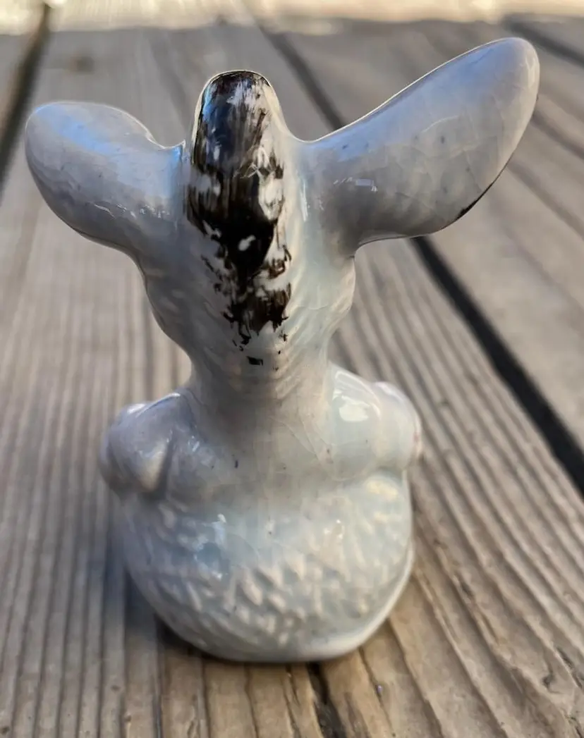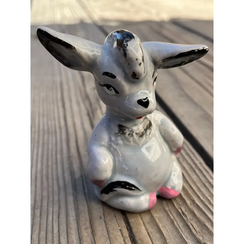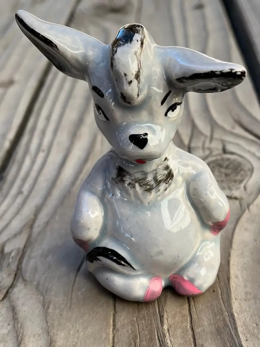 This vintage donkey figure is so cute! I think it's because of the detailed painting of his eyes and the tilt of both ears. He's special. Ceramic. Approximately 4 inches tall, 2 1/4 inches wide and 1 7/8 inches deep. The paint has rubbing as shown in the photos.