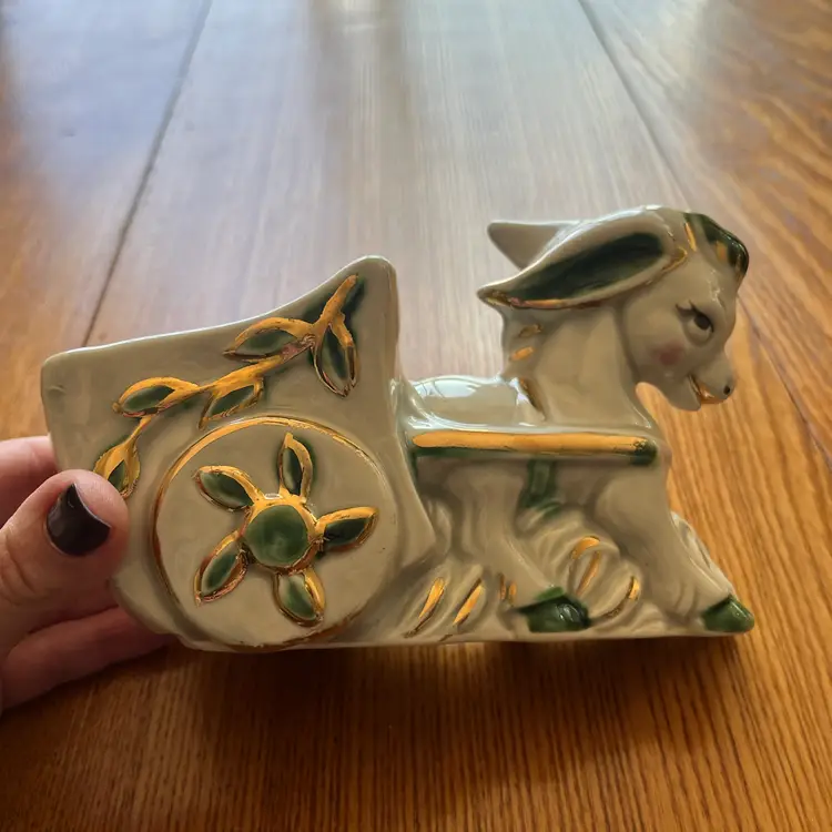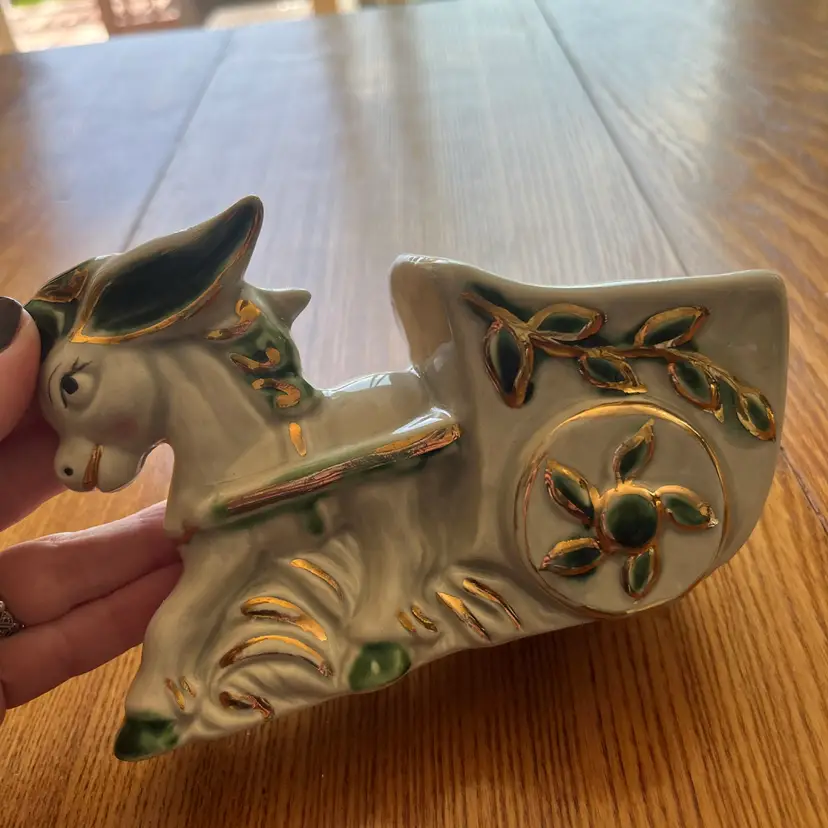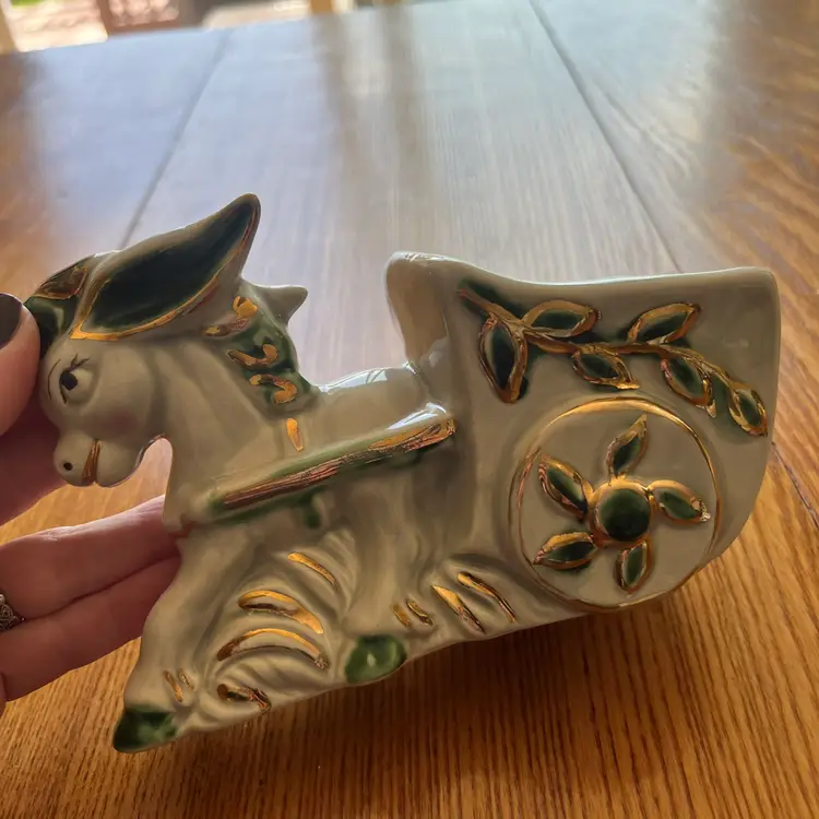 This particular planter, depicting a donkey pulling a cart, reflects a common theme of rustic or pastoral imagery found in decorative ceramics of the era. The use of gold trim and painted details adds a touch of elegance, making it suitable for display on shelves or tables, not just for holding plants. Such items are often collected for their nostalgic appeal and decorative charm.