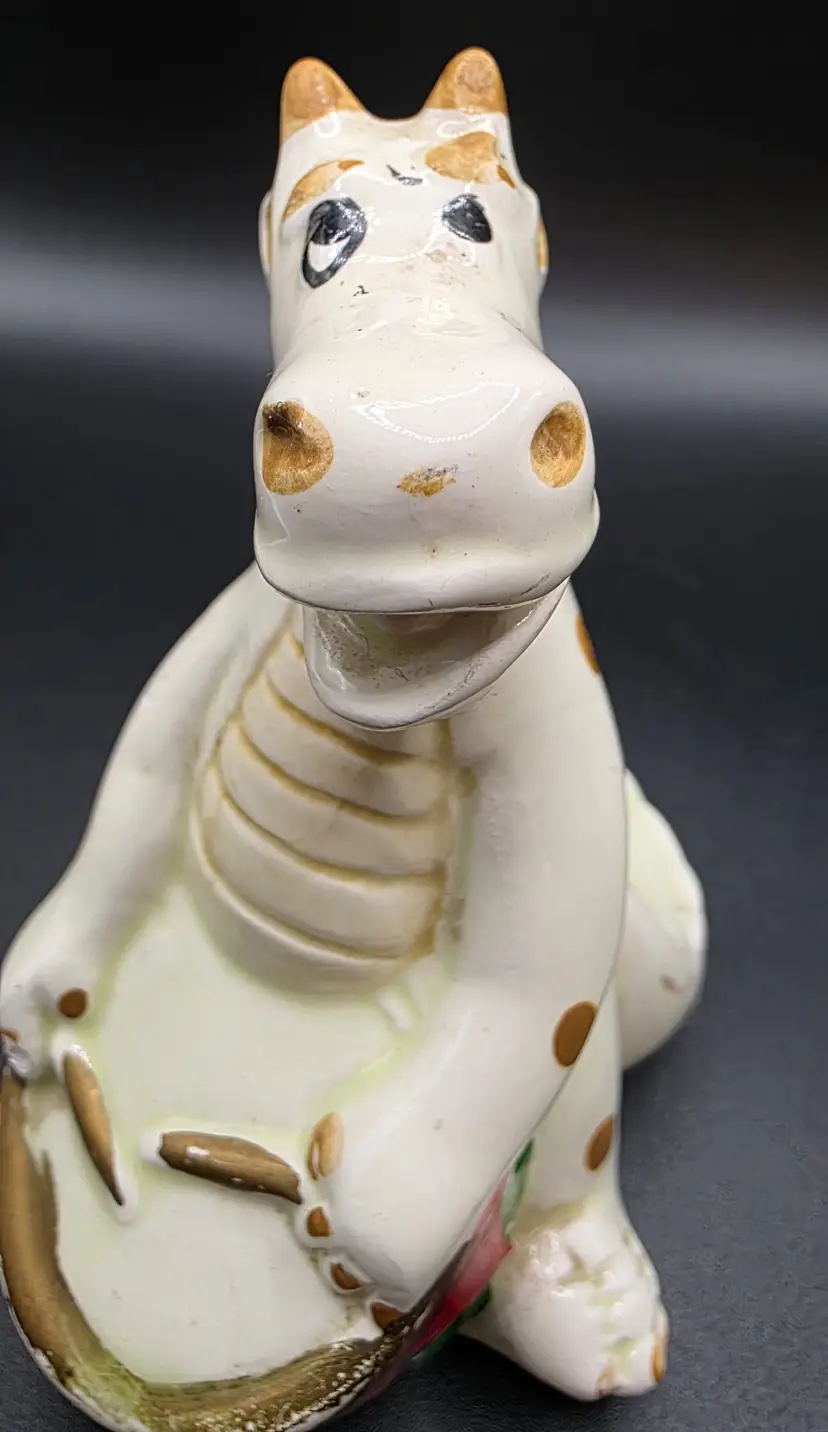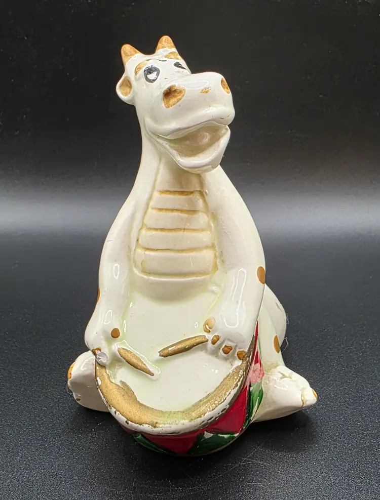 Add a playful touch to your collection with this charming vintage ceramic dragon, joyfully playing a colorful drum. With its cream-colored body, cheerful orange spots, and expressive face, this seated dragon radiates personality. The hand-painted details—wide eyes, raised eyebrows, and vibrant drum—make it a delightful conversation piece for any shelf, curio cabinet, or whimsical décor theme.