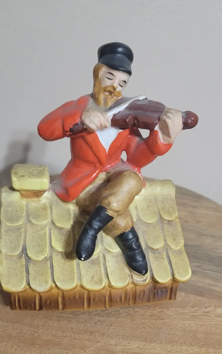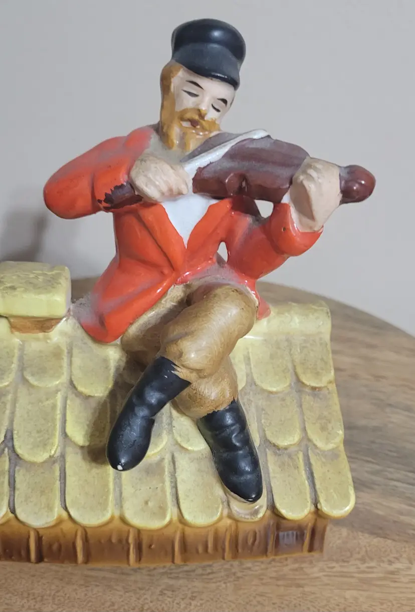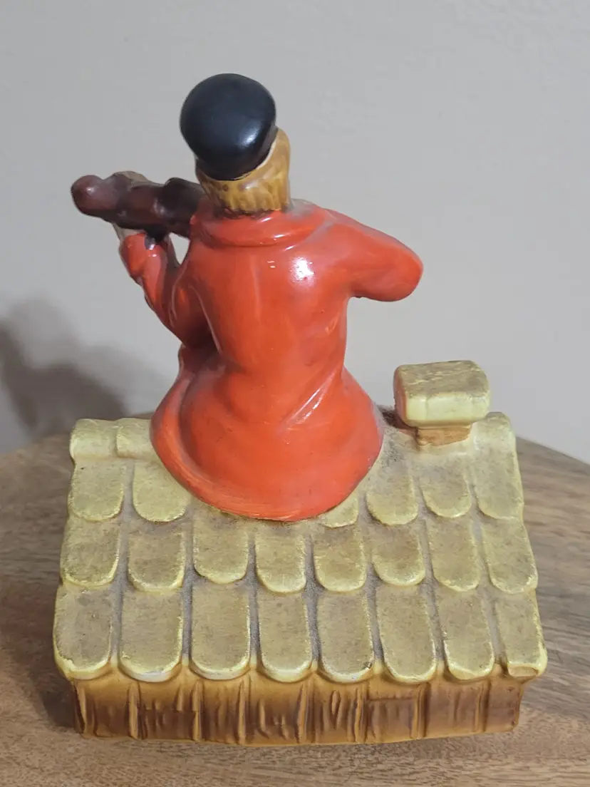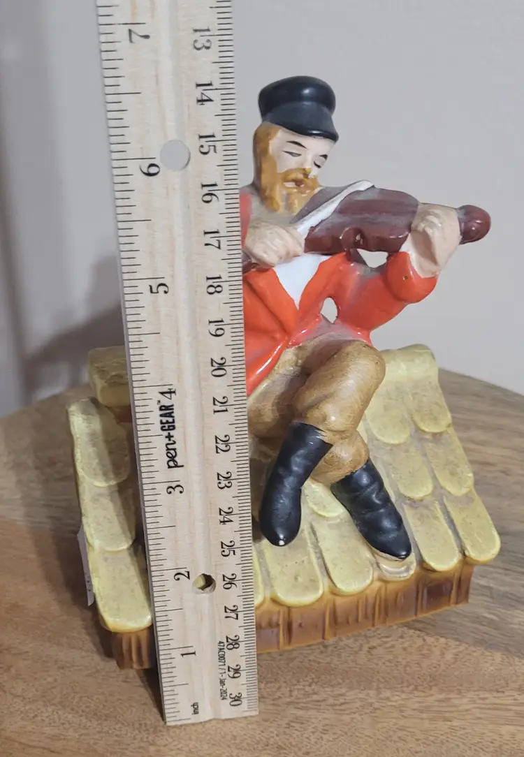 This vintage 6" high ceramic wind-up musical fiddler on the roof music box is a charming and nostalgic decorative collectible from Japan. With intricate details and a unique design, this music box plays Sunrise Sunset while the fiddler spins. Perfect for collectors or as a thoughtful gift for any music lover, this piece adds a touch of whimsy and nostalgia to any space.