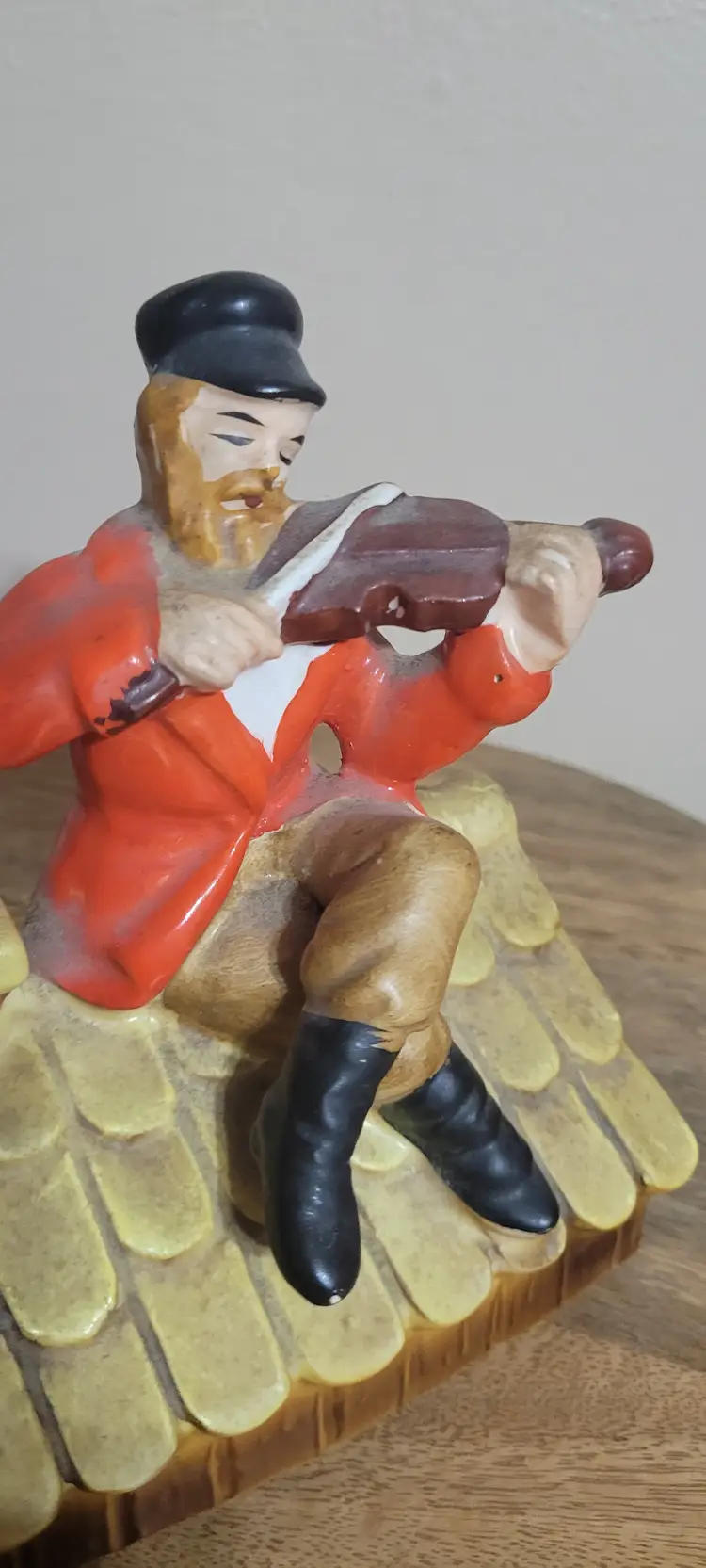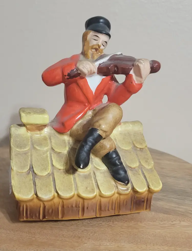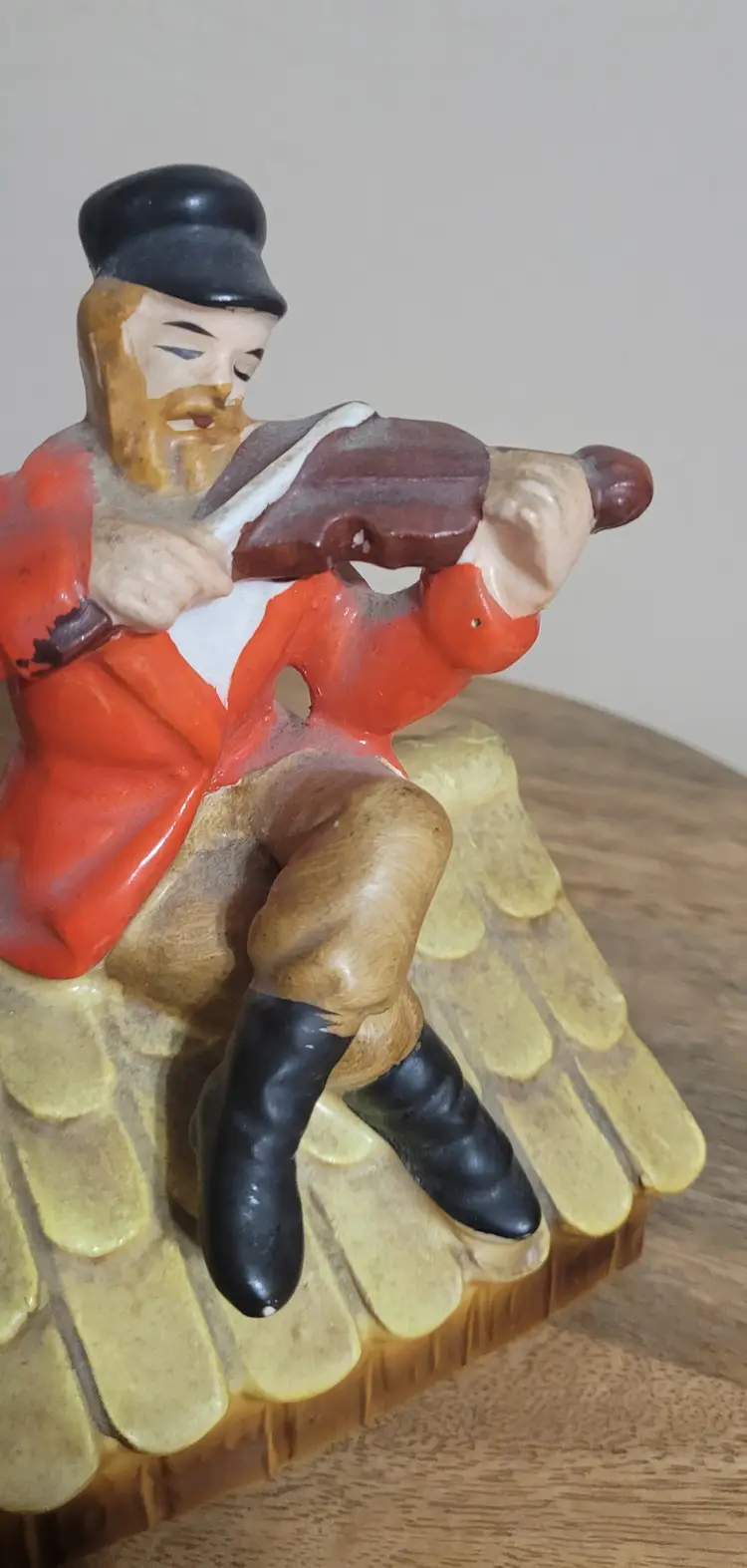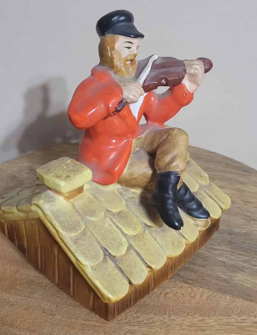 This vintage 6" high ceramic wind-up musical fiddler on the roof music box is a charming and nostalgic decorative collectible from Japan. With intricate details and a unique design, this music box plays Sunrise Sunset while the fiddler spins. Perfect for collectors or as a thoughtful gift for any music lover, this piece adds a touch of whimsy and nostalgia to any space.