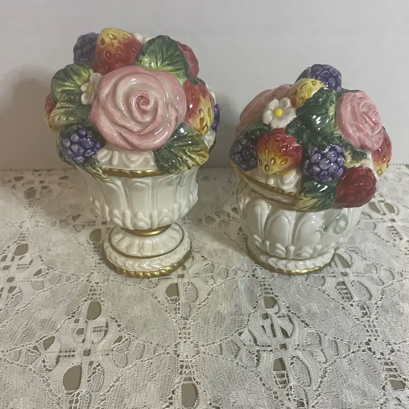 Charming vintage ceramic salt and pepper shakers featuring a colorful floral design. Perfect for adding a touch of elegance to your dining table.