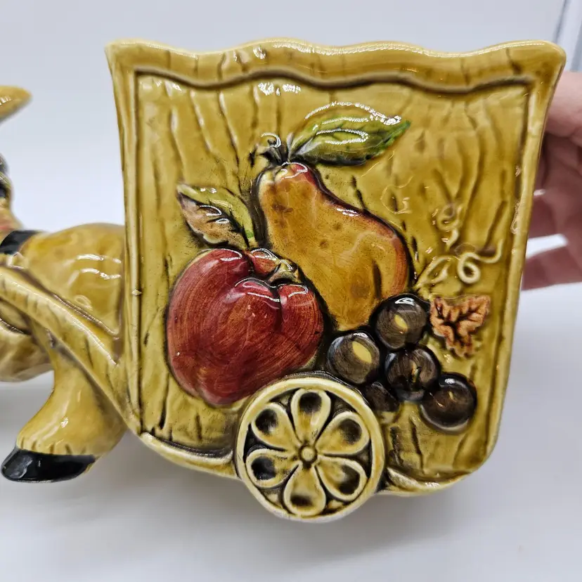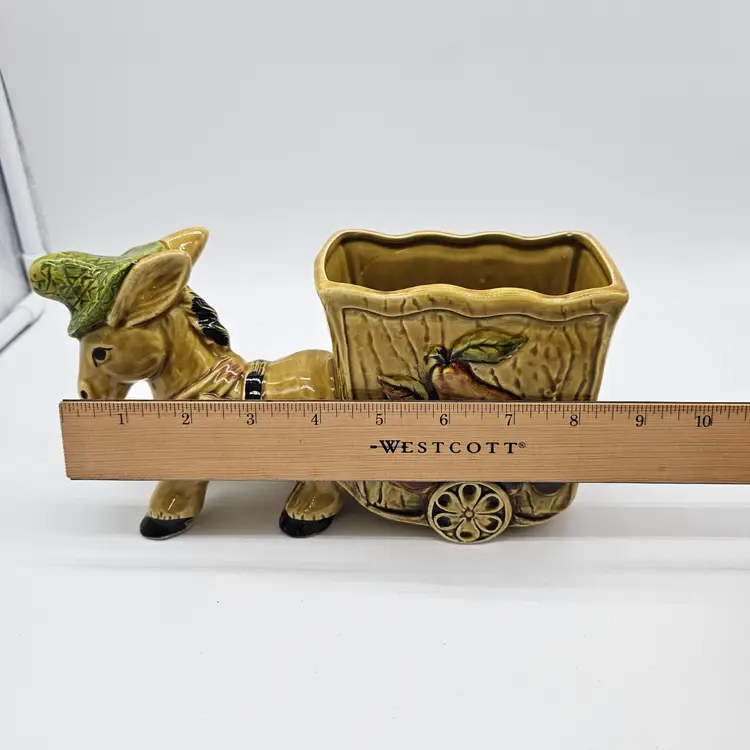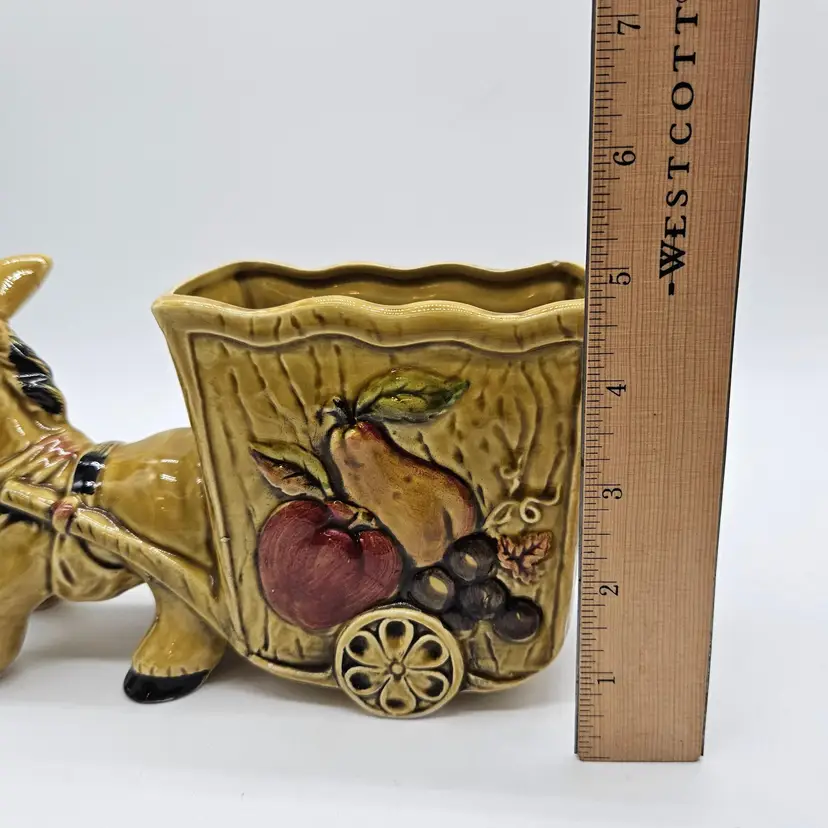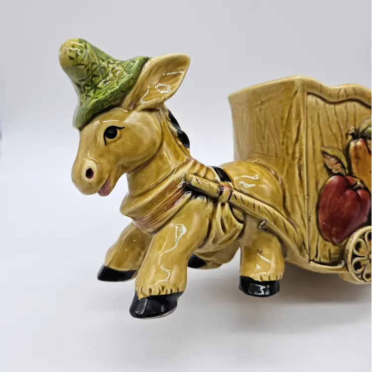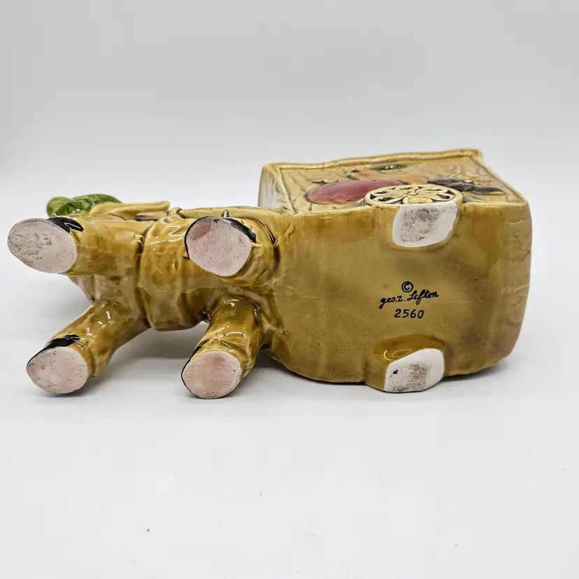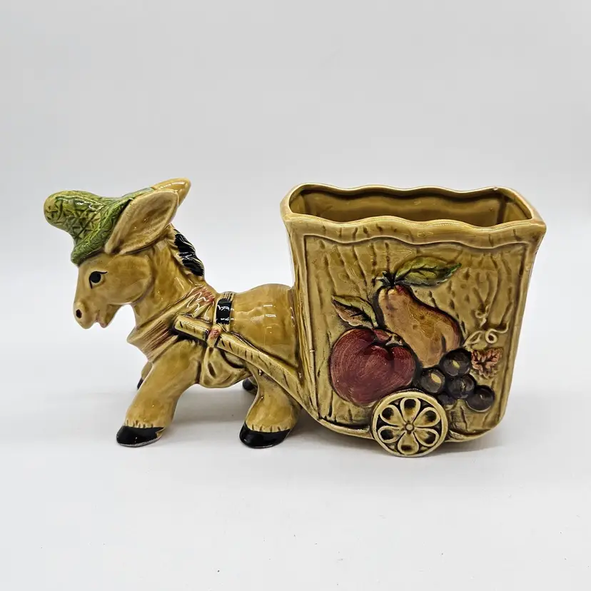 Vintage Ceramic Donkey And Cart Planter made by Geo Z Lefton, #2560 (markers mark on the bottom of the cart), with fruit pattern. This could have multipurpose use, a holder for pencils/pens, paintbrushes, eyeglasses, makeup brushes, trinkets, small utensils, etc... It is in Good, Pre-owned condition, showing minimal wear from previous use and age. There are small chips at the inner edge of the Planter and on the right hoof of the donkey (seen in photos). There are no breaks, no cracks. It is approximately 8 1/4" long and 4 3/4" tall. The opening of the Planter and is approximately 4 3/4" x 2 3/4". See all photos of description