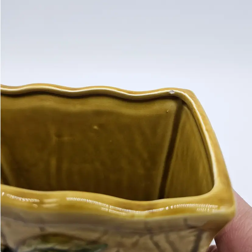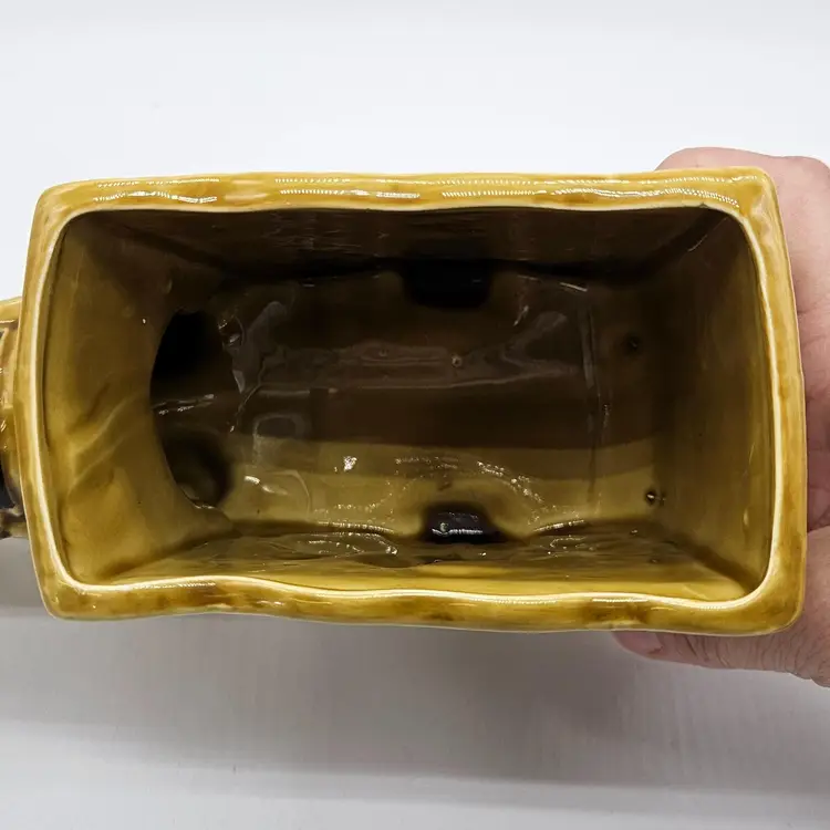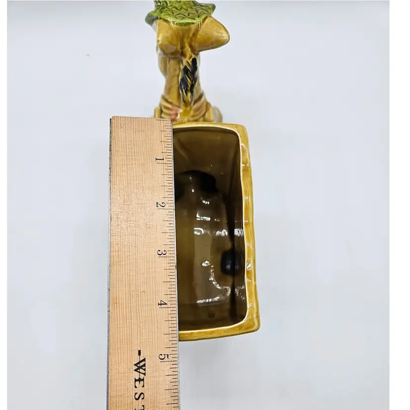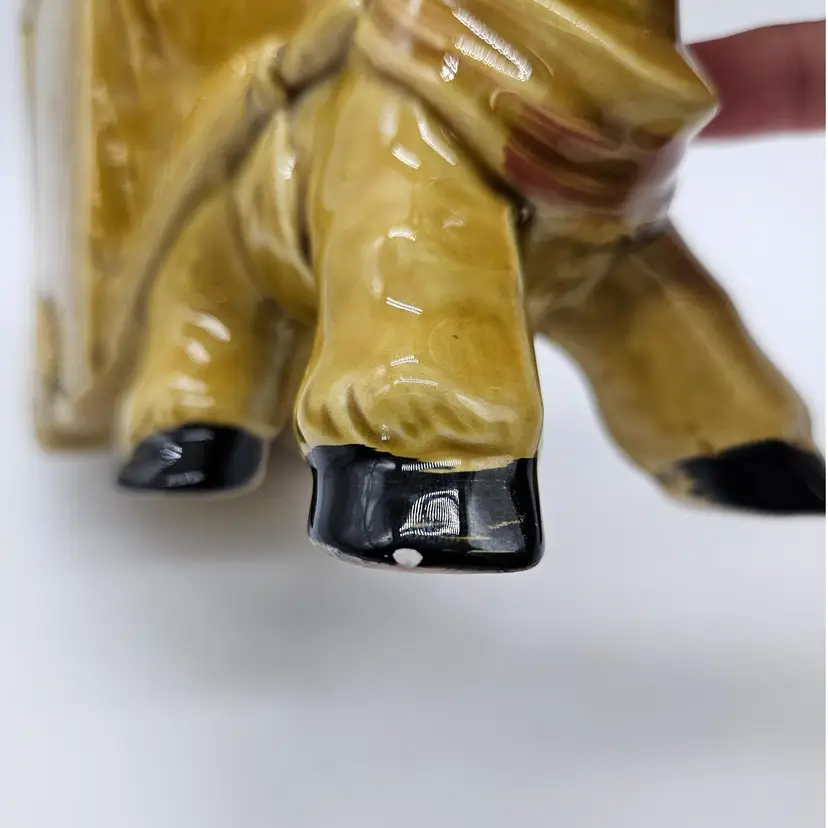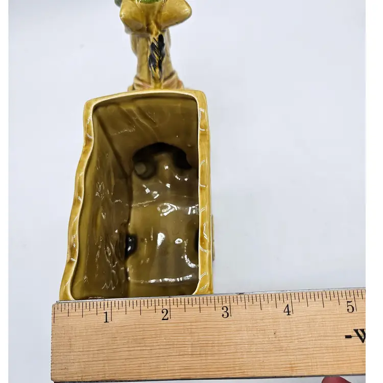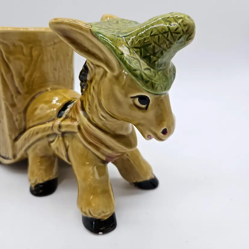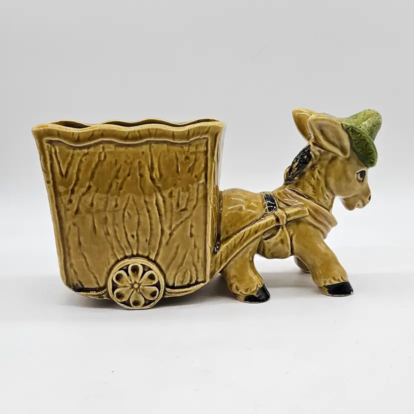 Vintage Ceramic Donkey And Cart Planter made by Geo Z Lefton, #2560 (markers mark on the bottom of the cart), with fruit pattern. This could have multipurpose use, a holder for pencils/pens, paintbrushes, eyeglasses, makeup brushes, trinkets, small utensils, etc... It is in Good, Pre-owned condition, showing minimal wear from previous use and age. There are small chips at the inner edge of the Planter and on the right hoof of the donkey (seen in photos). There are no breaks, no cracks. It is approximately 8 1/4" long and 4 3/4" tall. The opening of the Planter and is approximately 4 3/4" x 2 3/4". See all photos of description