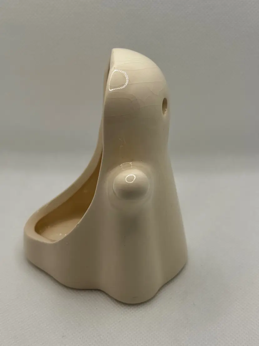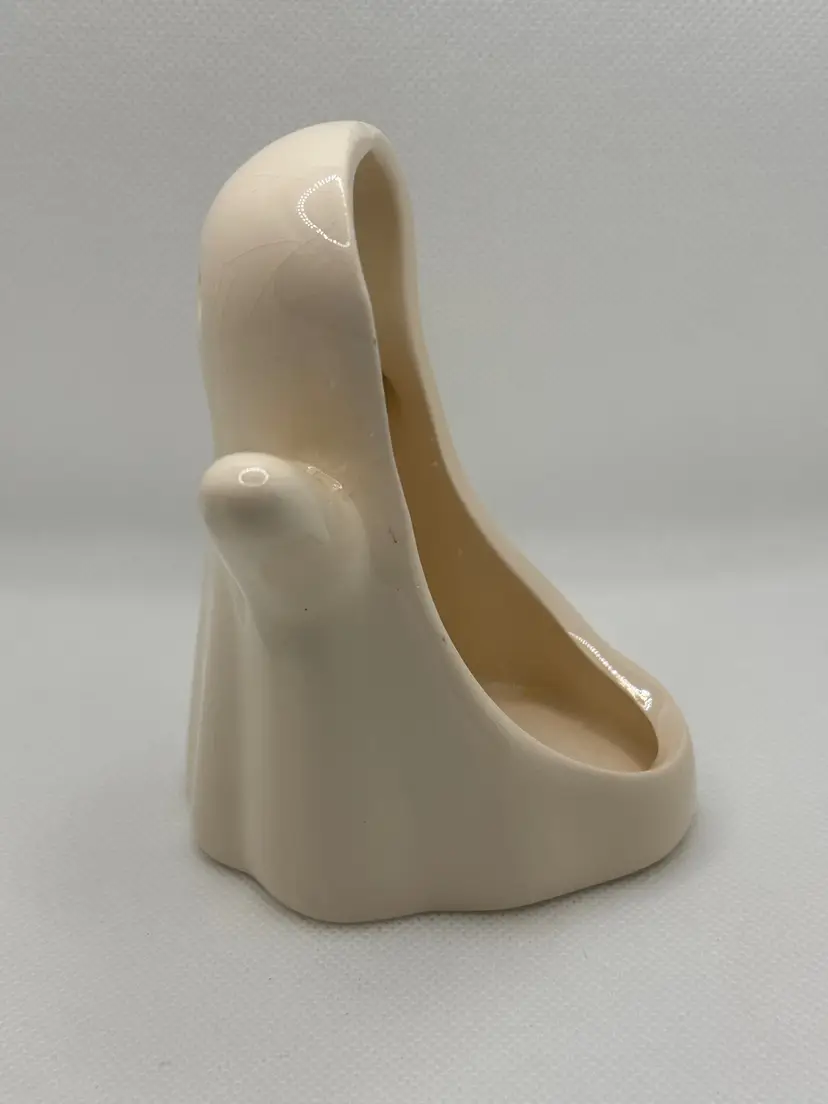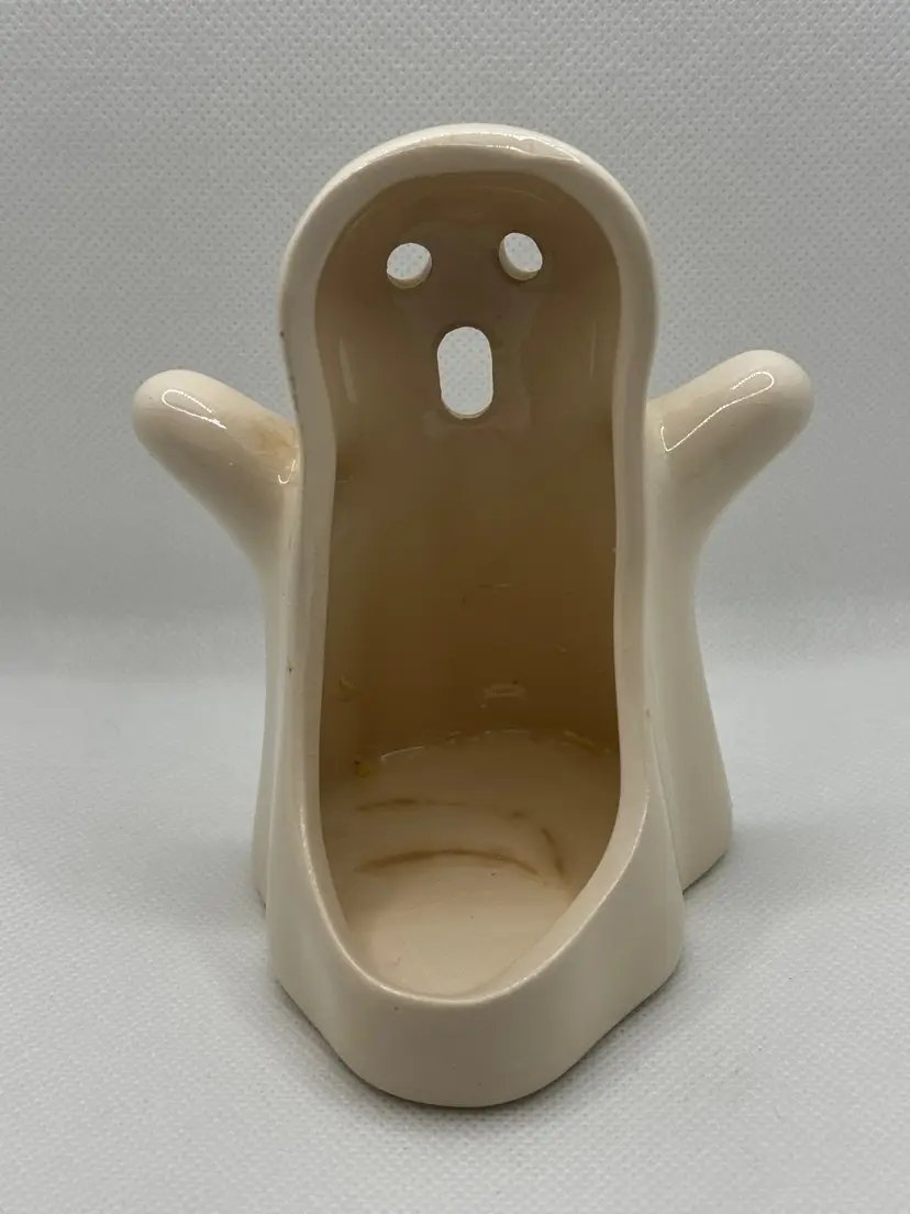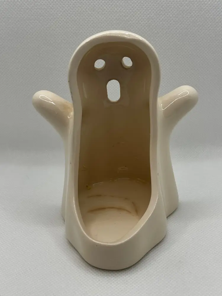 Add a touch of spooky charm to your Halloween decor with this vintage ceramic ghost tea light votive candle holder figurine. Its simple yet expressive design makes it a delightful addition to any collection or festive display. Perfect for bringing a bit of eerie fun to your home. Excellent condition with a glossy finish. Measures 3.5x4.25x3.5 inches. Weighs 6oz.
