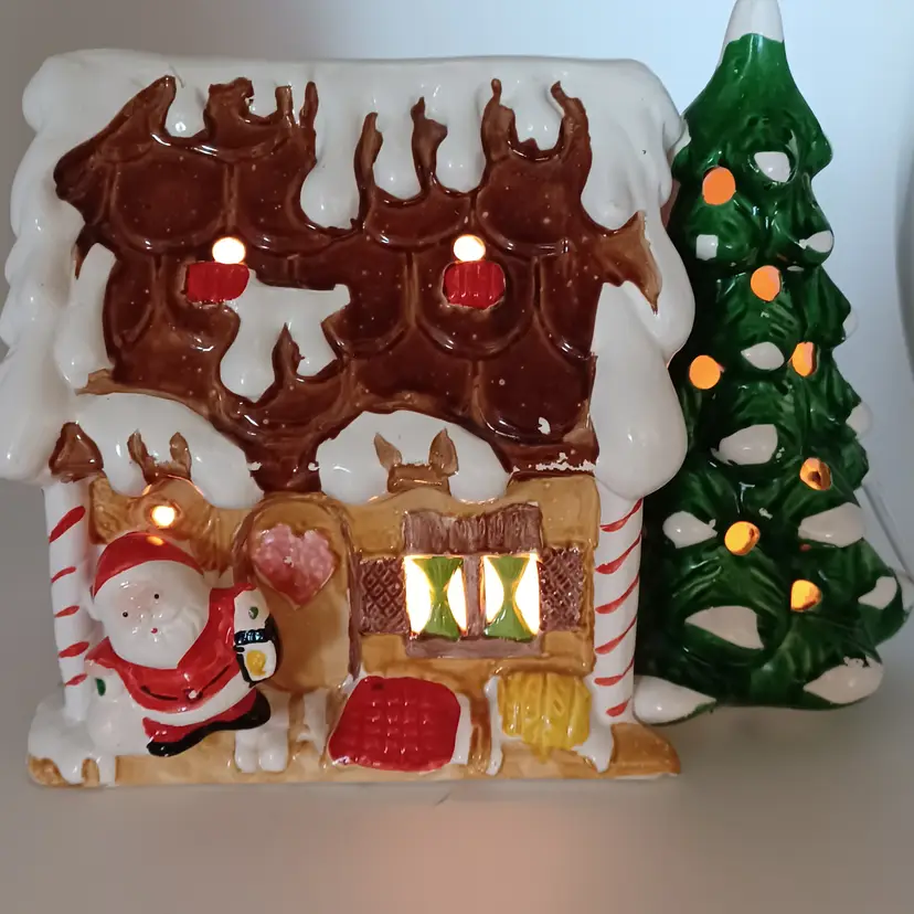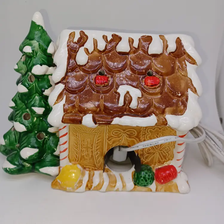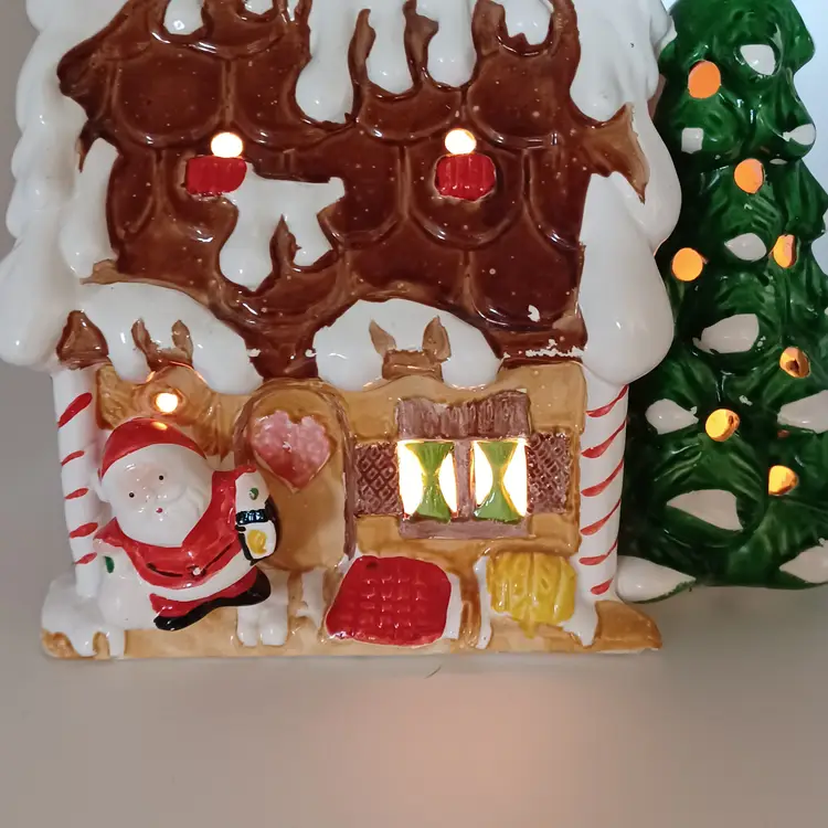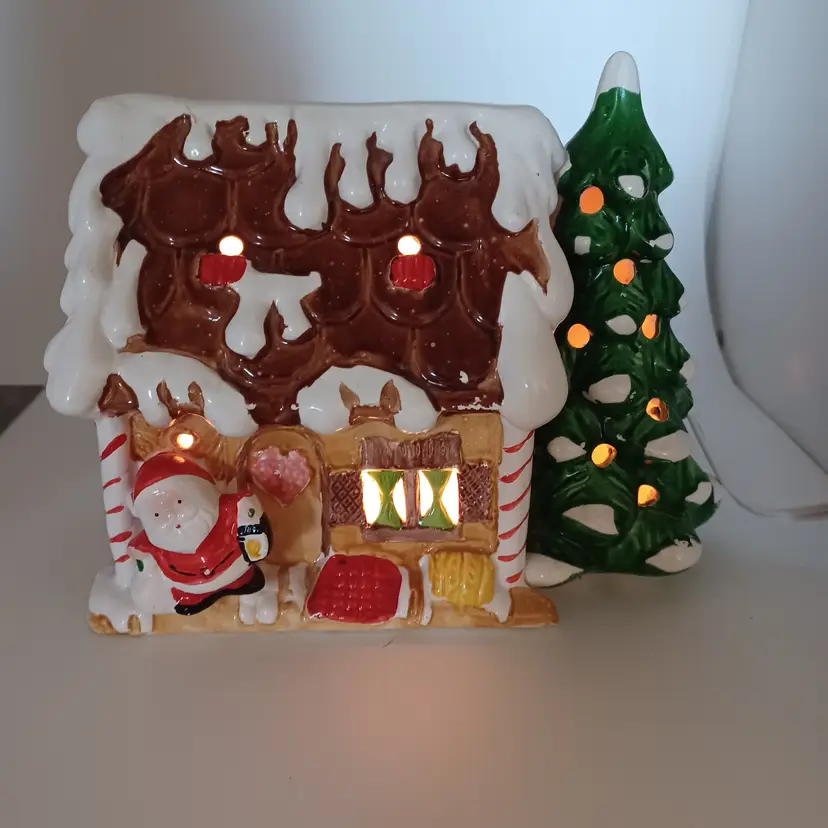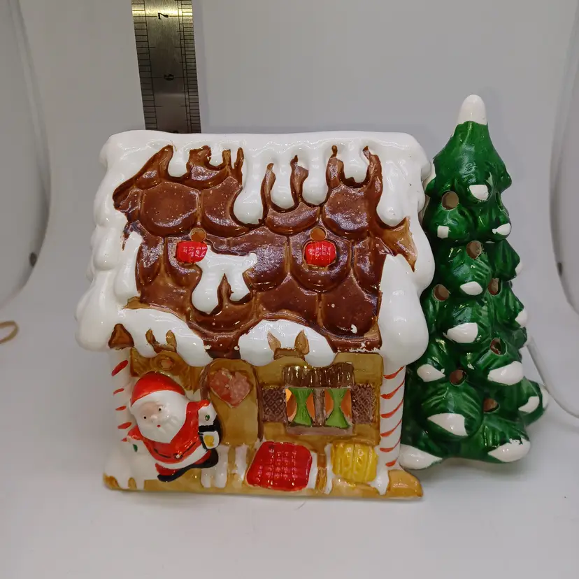 Vintage ceramic gingerbread Christmas tree I found one online with no info made in Tiawan has a cute little Santa on front the light works well measures 5 in tall by almost 8 in Long in good vintage condition does have a few missing spots of paint and a flat chip out of the Front Bottom which when displayed properly is not really self-evident please see all pictures as they're the best description all items from a smoke-free home with pets experienced fragile shipper