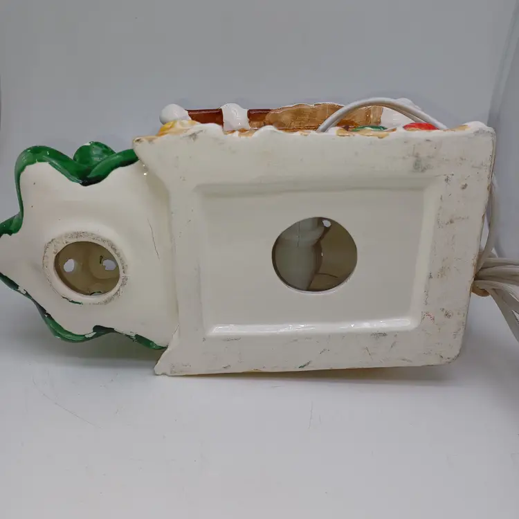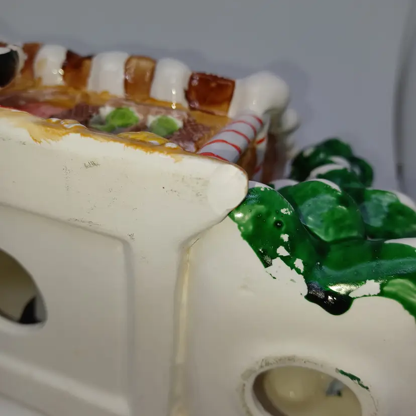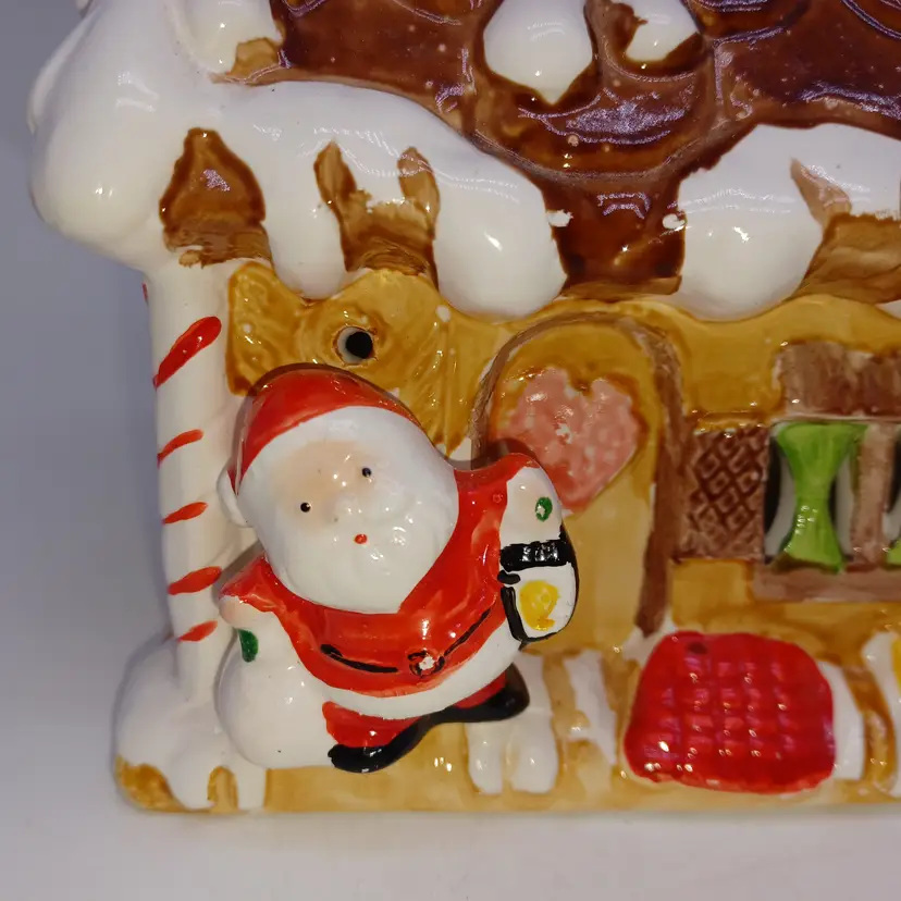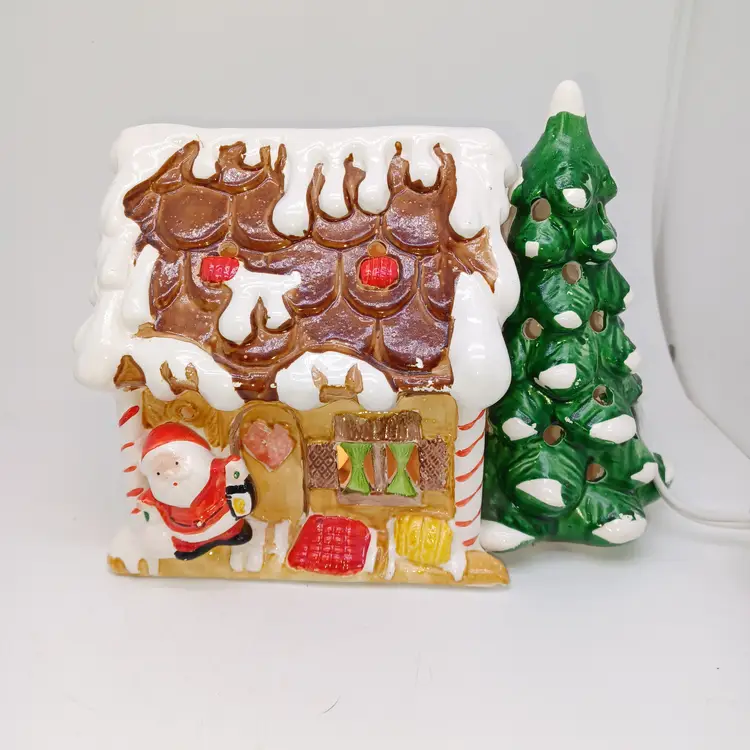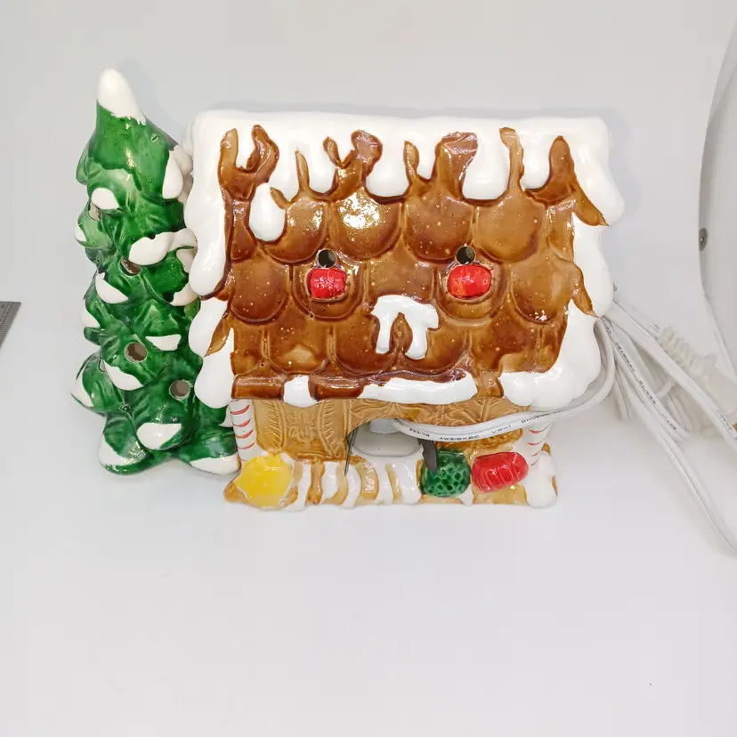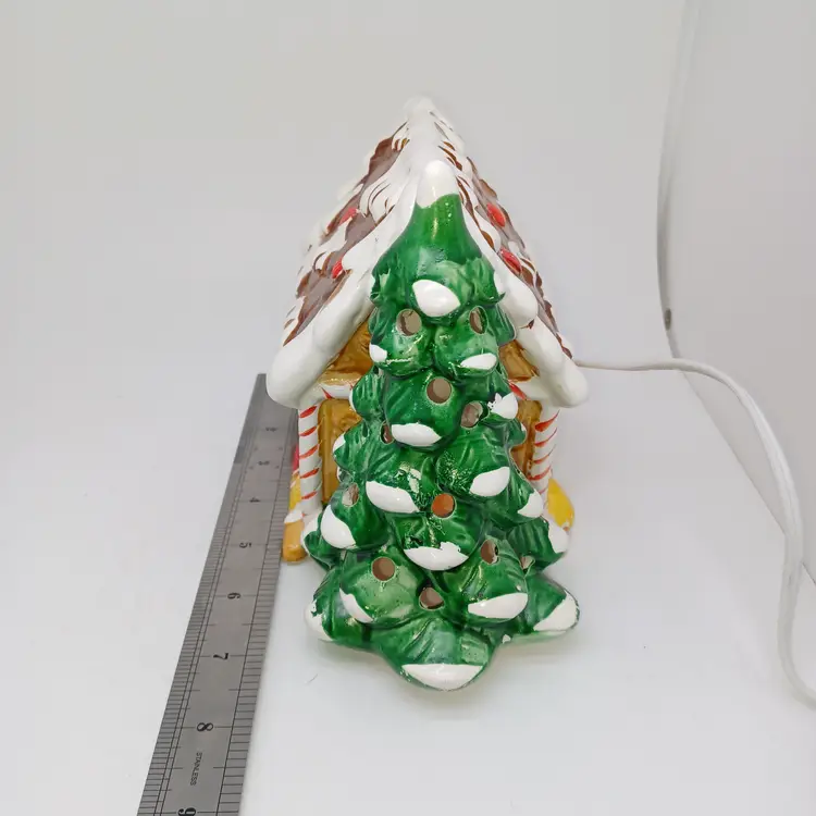 Vintage ceramic gingerbread Christmas tree I found one online with no info made in Tiawan has a cute little Santa on front the light works well measures 5 in tall by almost 8 in Long in good vintage condition does have a few missing spots of paint and a flat chip out of the Front Bottom which when displayed properly is not really self-evident please see all pictures as they're the best description all items from a smoke-free home with pets experienced fragile shipper
