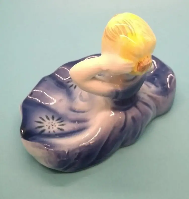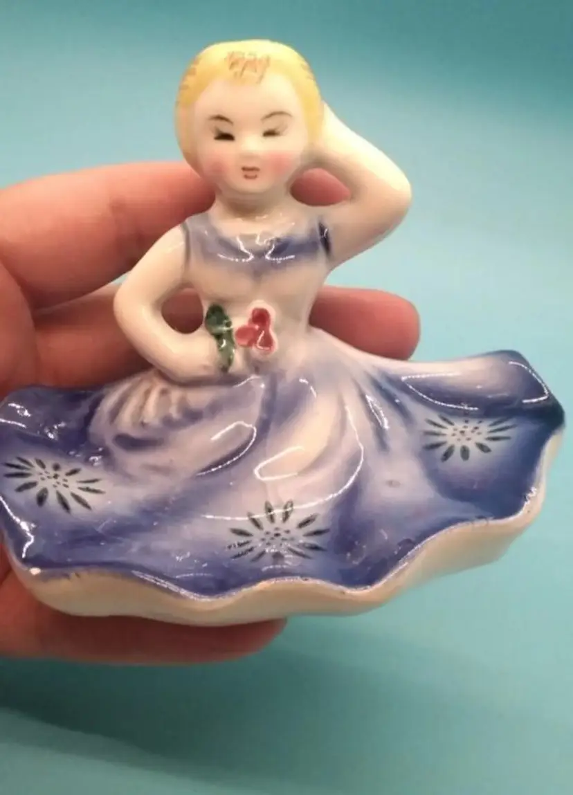 .in a blue dress holding a flower. Perfect for adding a touch of nostalgia to your collection. In good used condition with no visible issues.