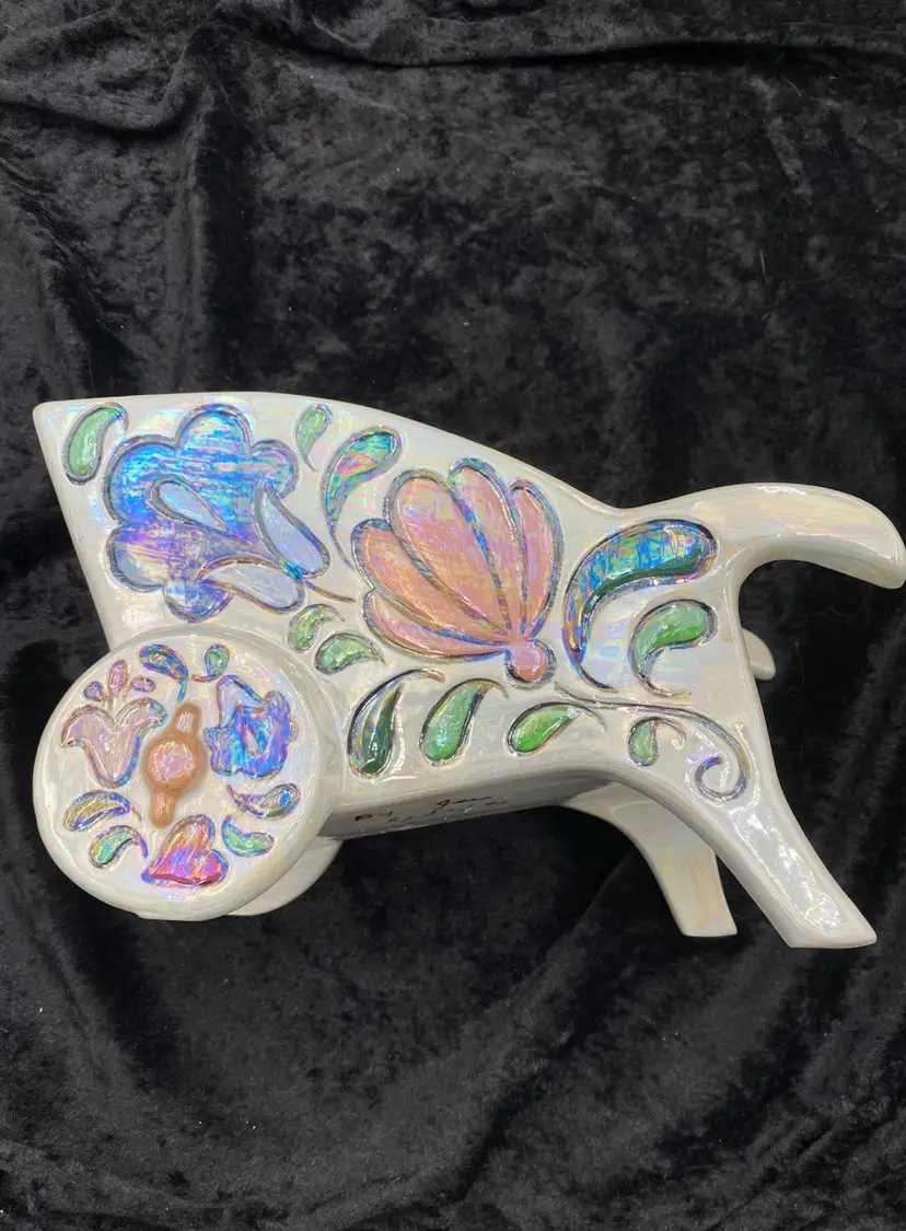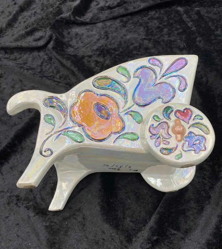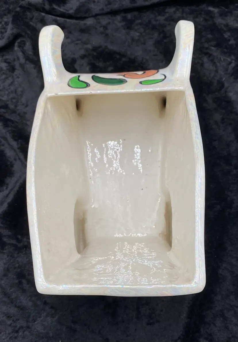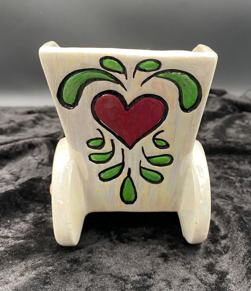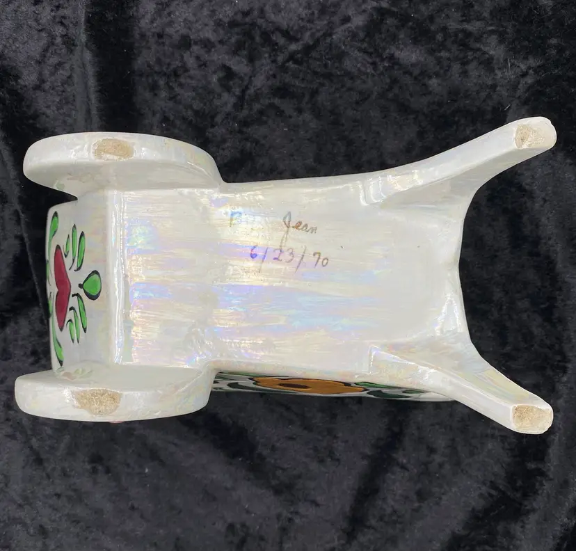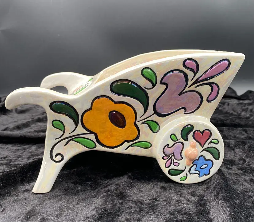 This vintage ceramic planter embodies the charm of retro florals and the whimsy of hand-painted artistry. The wheelbarrow, adorned with an iridescent finish and vibrant multicolor florals, brings a touch of the late 20th century to any space. Despite its age, the planter remains a delightful piece, suitable for displaying flowers or plants in any room. The planter measures 9 inches in length, 5 inches in height, and 4.75 inches in width, making it a medium-sized, versatile decor piece. Signed by the artist "Jean," this handcrafted item is an original from the 1970s, weighing 1 pound, 3.2 ounces.