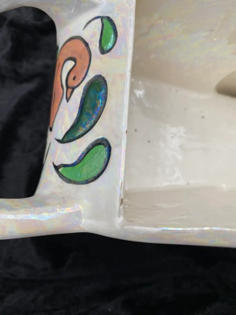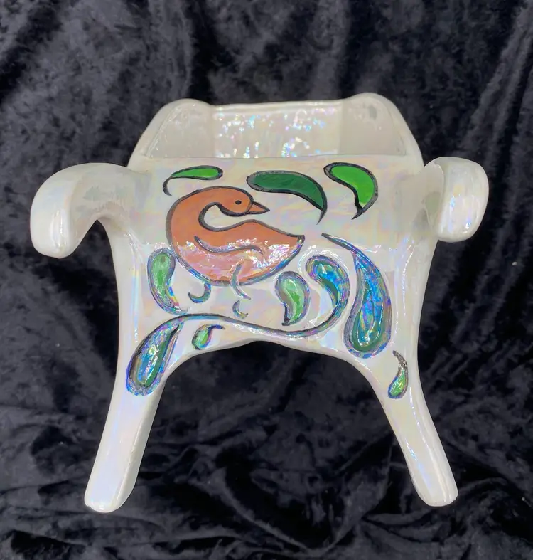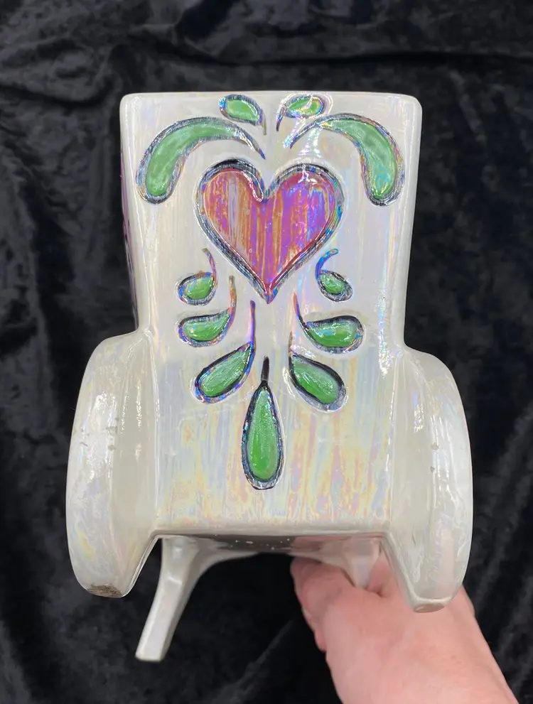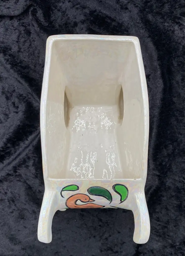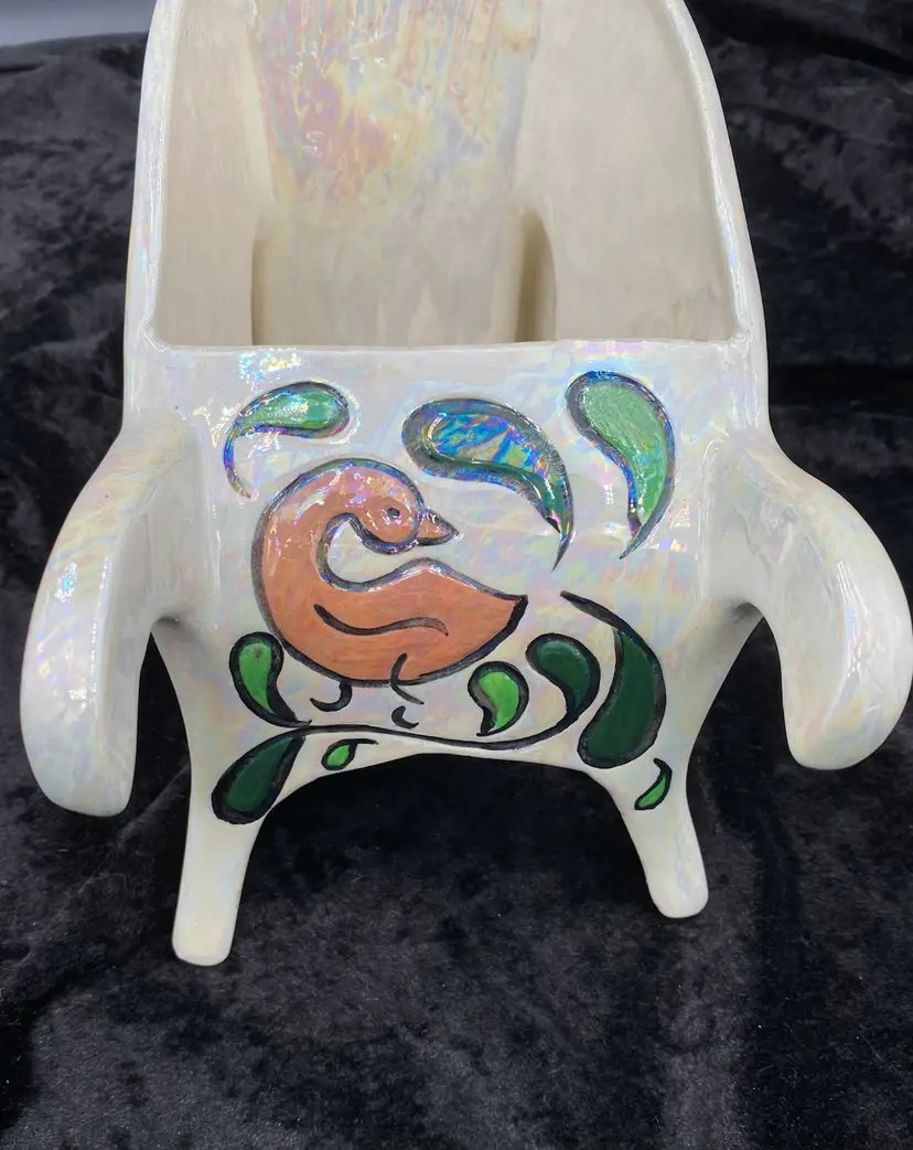 This vintage ceramic planter embodies the charm of retro florals and the whimsy of hand-painted artistry. The wheelbarrow, adorned with an iridescent finish and vibrant multicolor florals, brings a touch of the late 20th century to any space. Despite its age, the planter remains a delightful piece, suitable for displaying flowers or plants in any room. The planter measures 9 inches in length, 5 inches in height, and 4.75 inches in width, making it a medium-sized, versatile decor piece. Signed by the artist "Jean," this handcrafted item is an original from the 1970s, weighing 1 pound, 3.2 ounces.