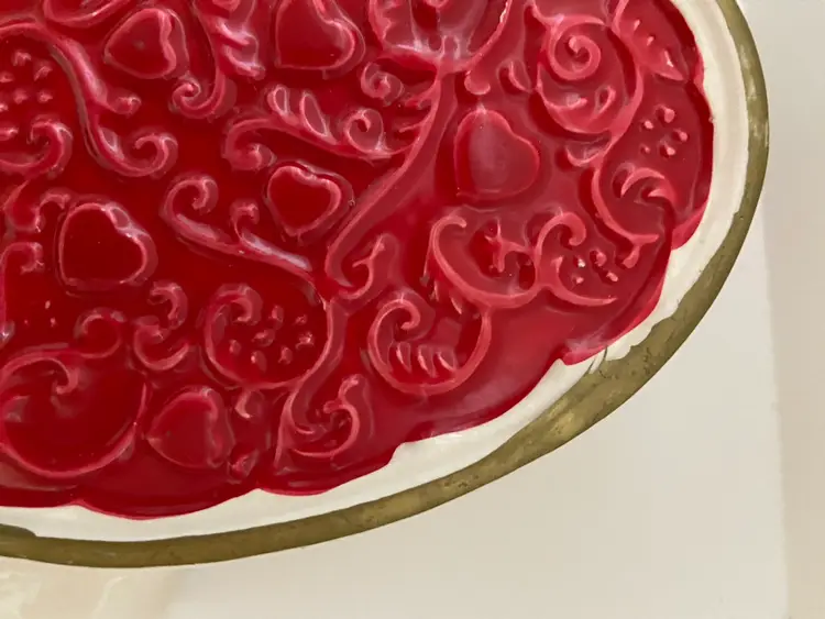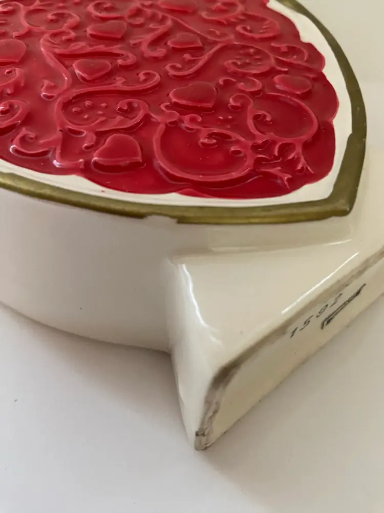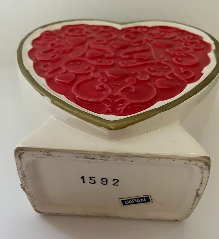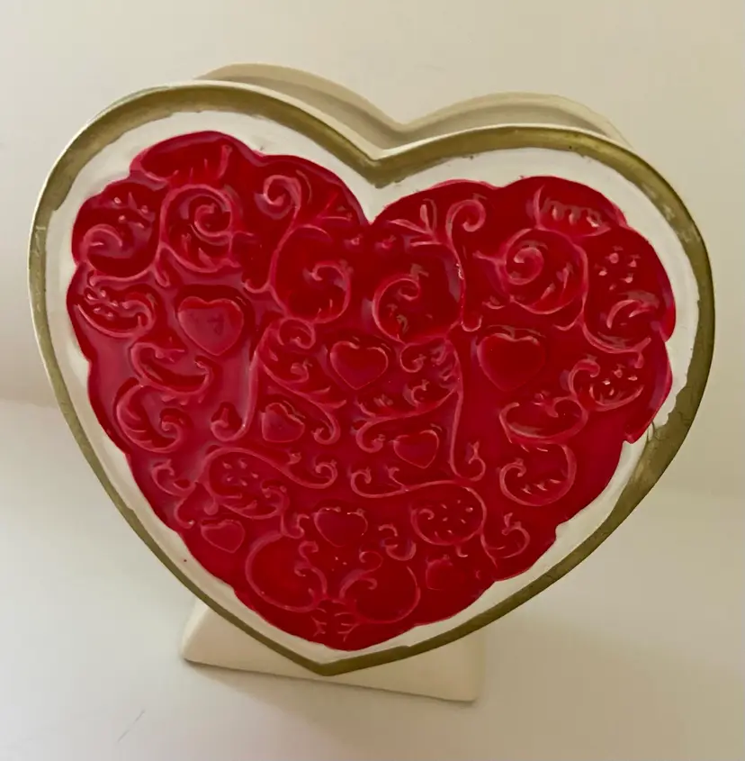 Cute vintage, ceramic heart shaped vase With a red colored heart outlined in gold. This would be perfect for celebrating Valentine’s Day. The paint might not be all original, but the piece displays wonderfully. Please see photos for details.