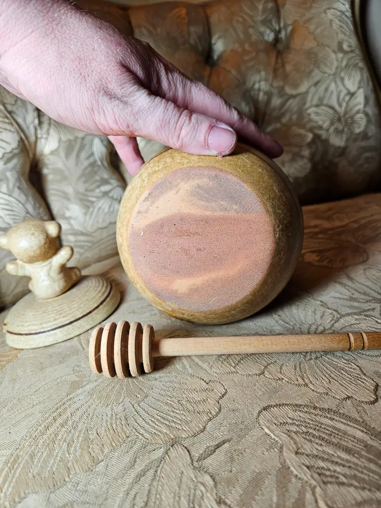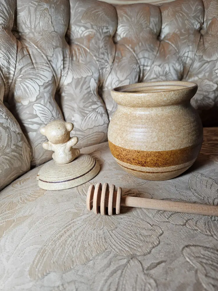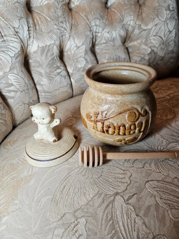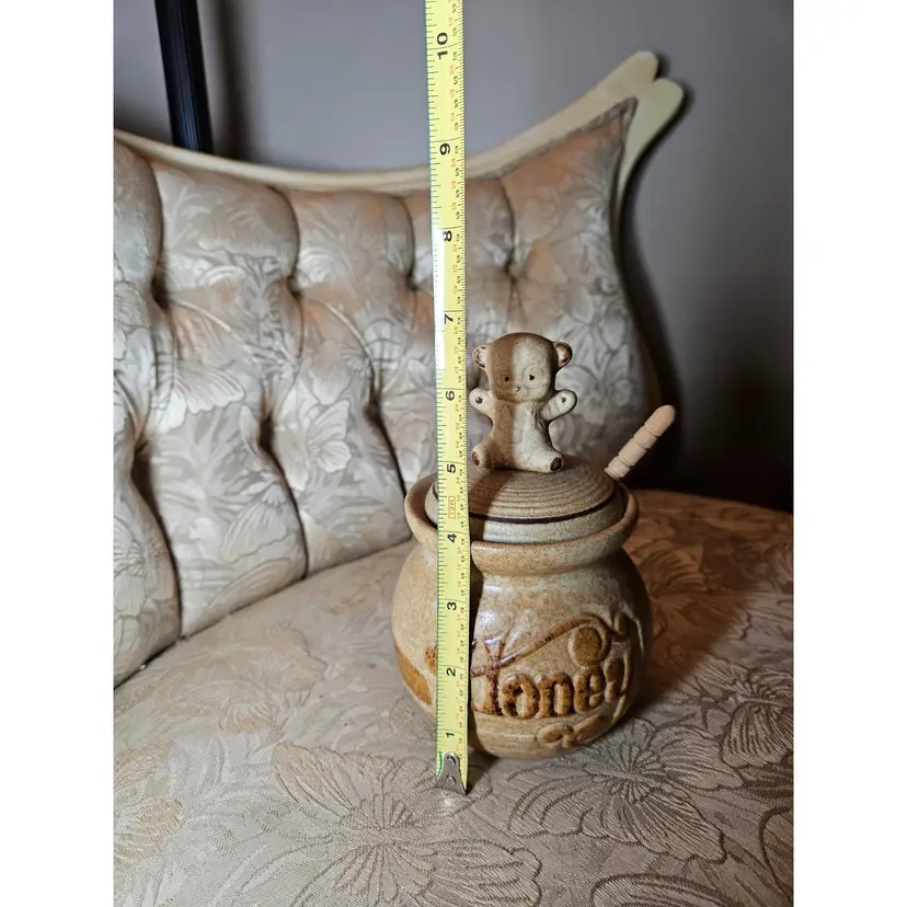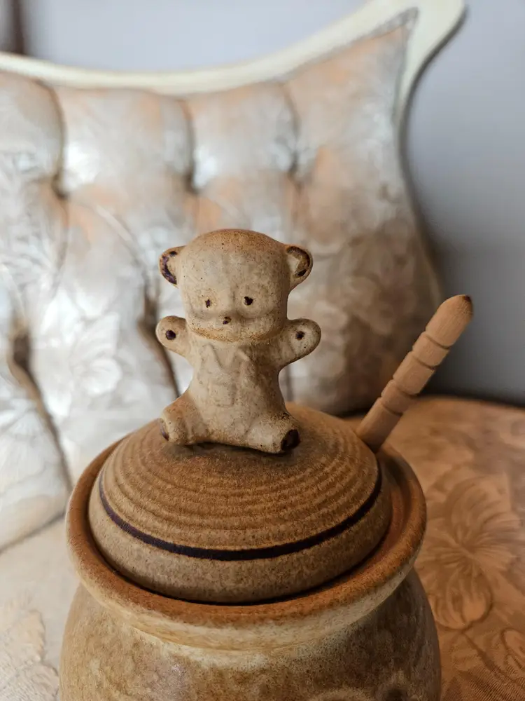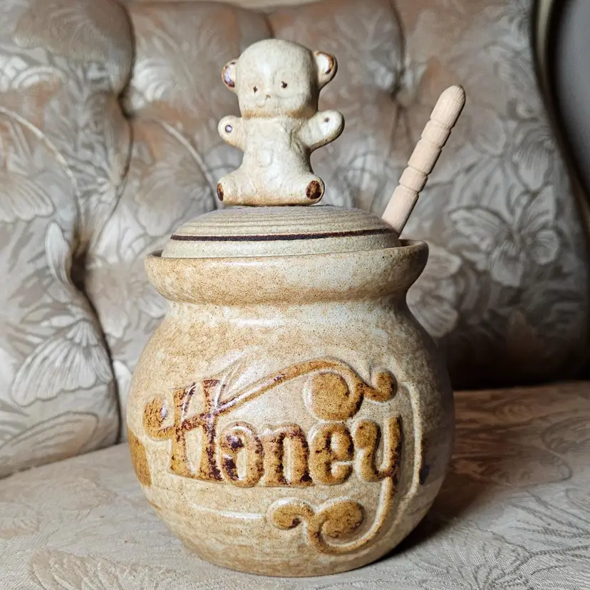 Adorable vintage honey jar with a cute bear on the lid. Comes with a wooden dipper. Perfect for adding a touch of charm to your kitchen. No chips or cracks.