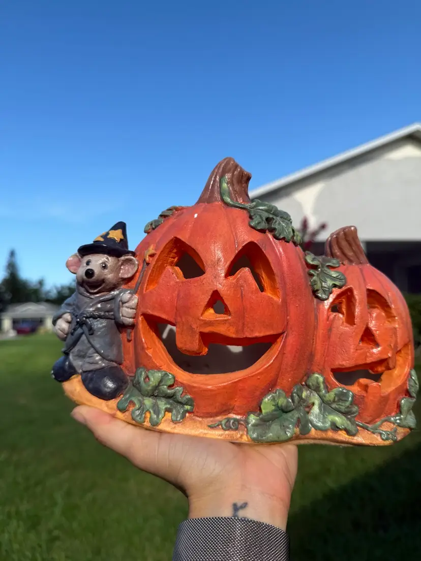 This one is super cool, super heavy too. It does not come with bulb/cord so it will need one. Otherwise in good shape with only a couple flea bites on it.! Mouse is dressed in celestial wear with his little magic wand.
