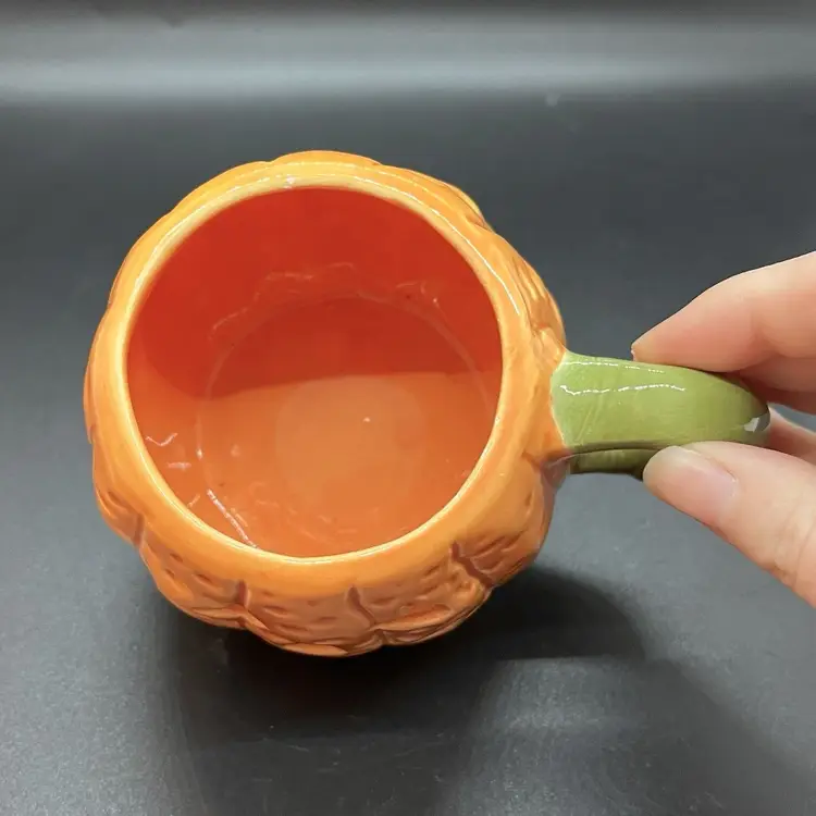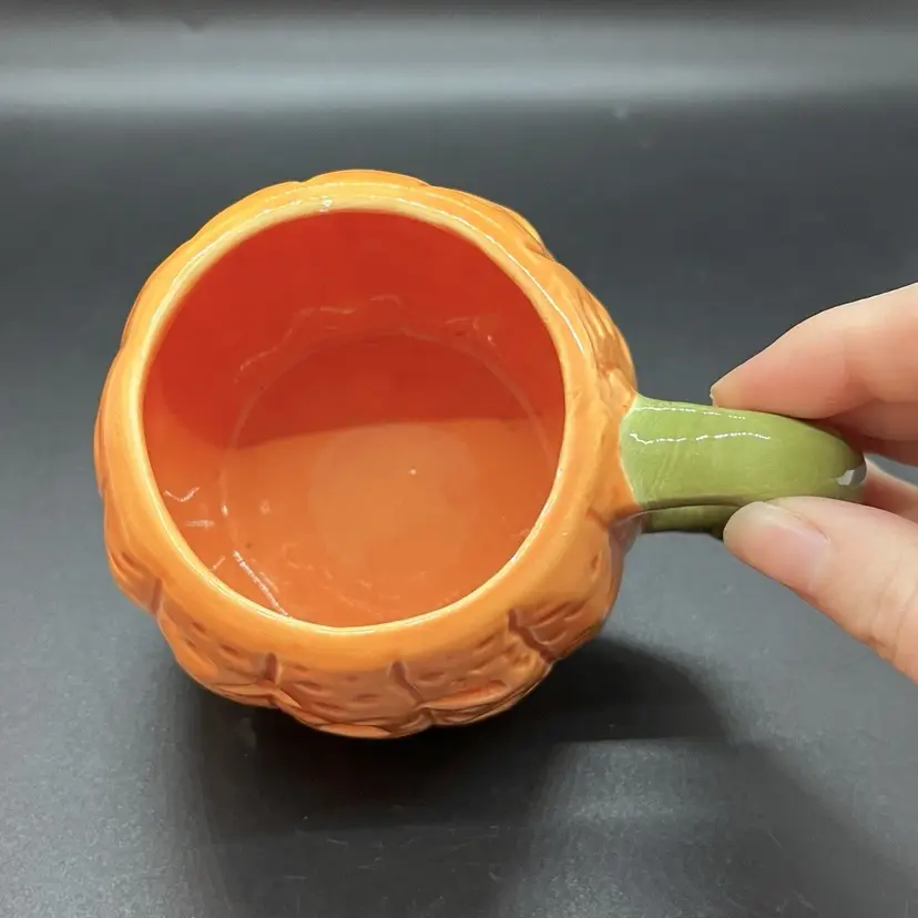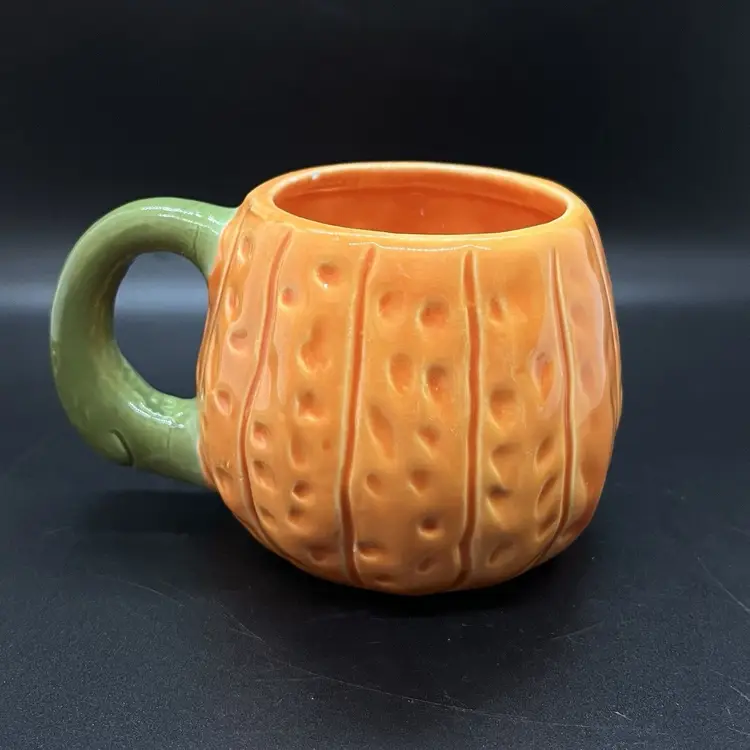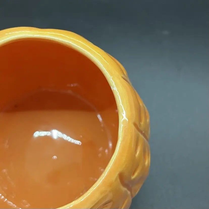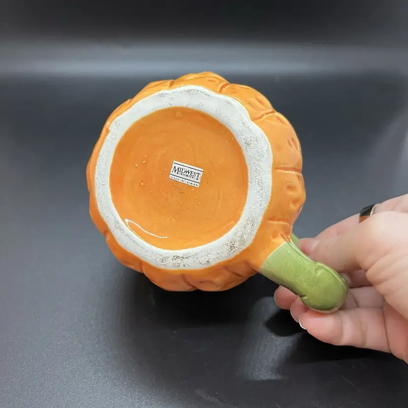 This is a cute little pumpkin mug made by Midwest Imports. Could also easily house a votive candle. Has a very small paint chip on the rim as pictured, measures about 3" tall.