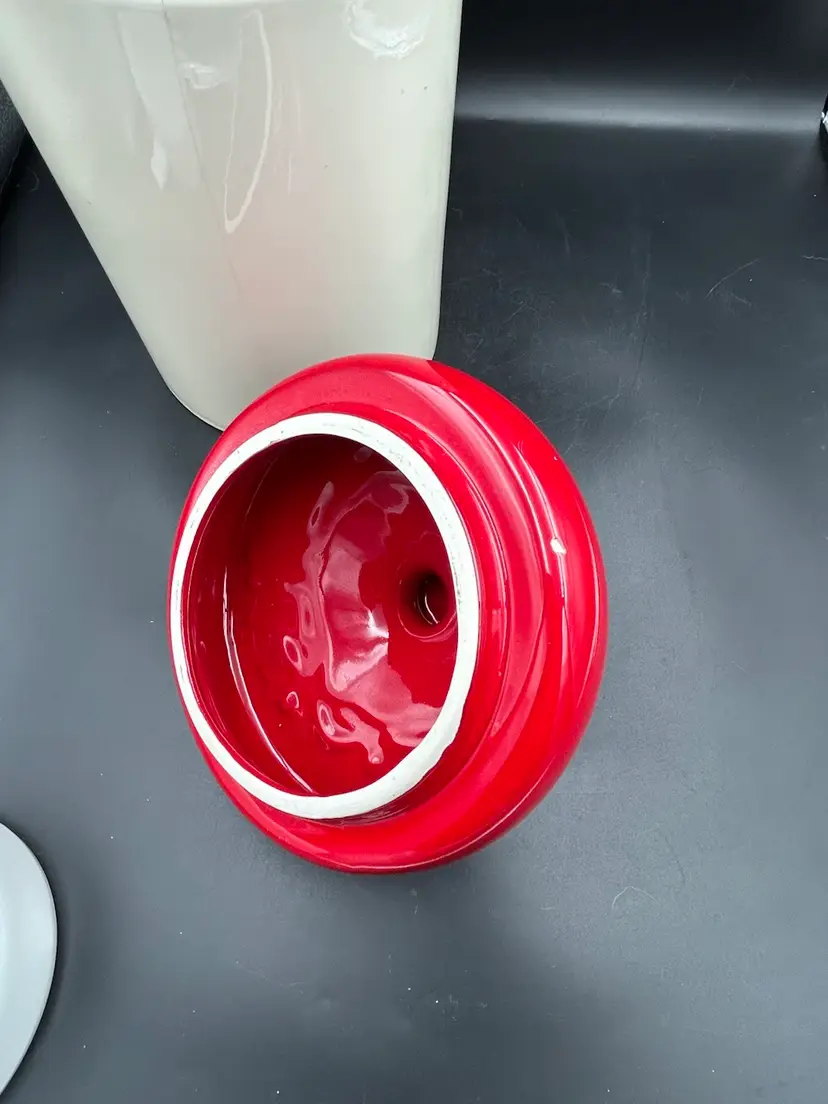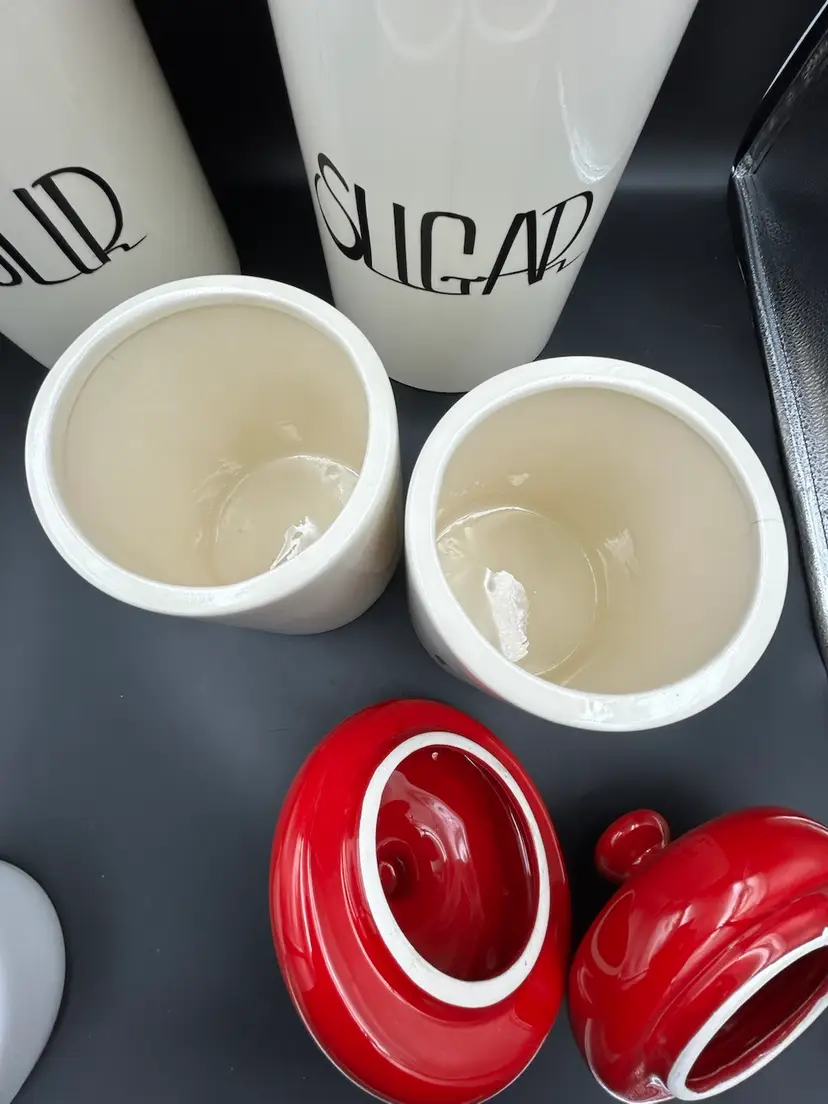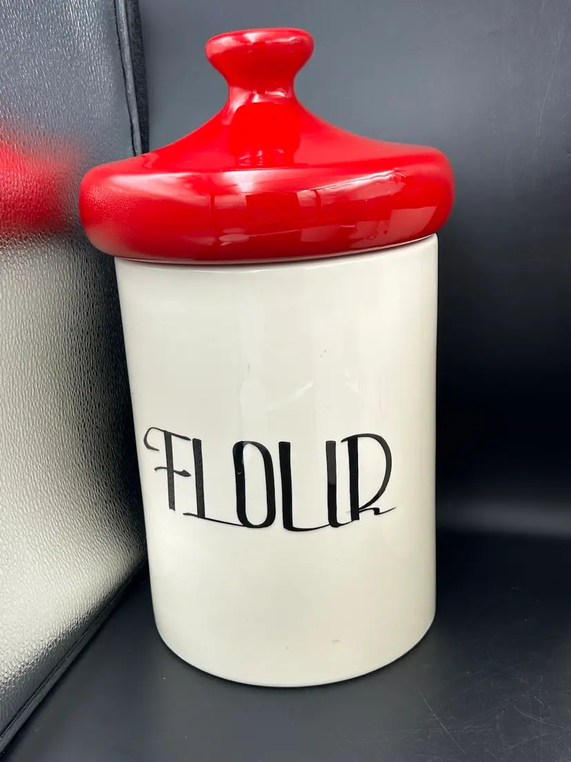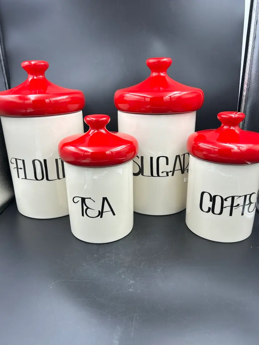 Flower canister has crack in back and small paint glaze chip on lid, see pictures. All other pieces perfect condition. Large – 13 H.x 7.5 W. Smaller – 9.5 H.x 6W