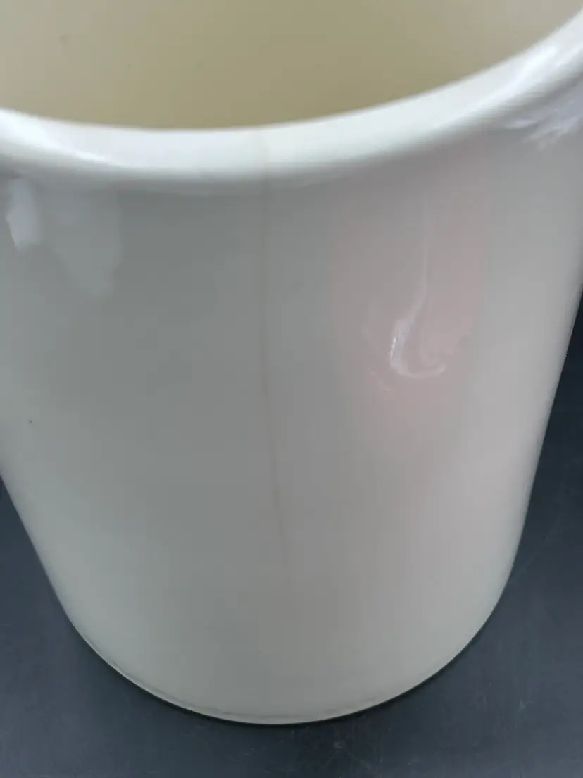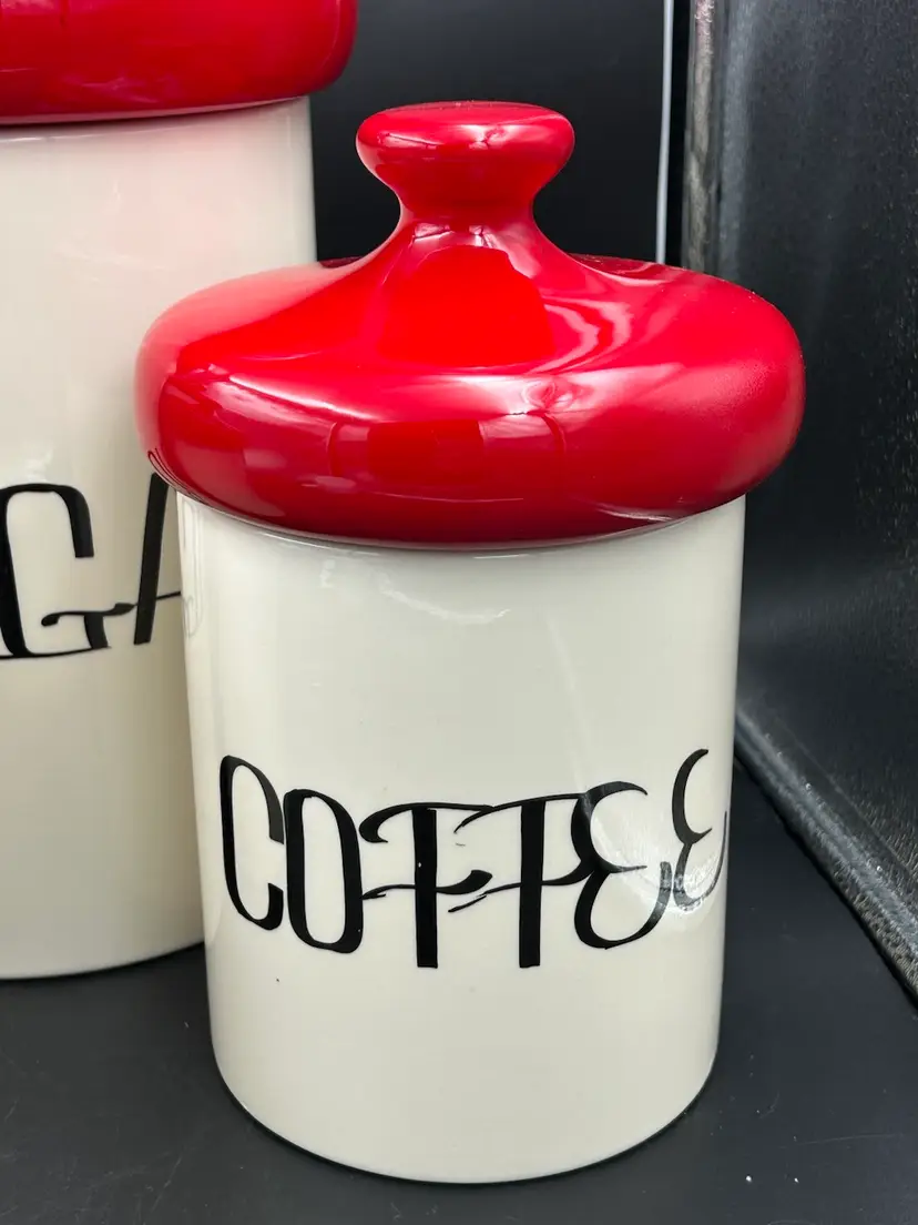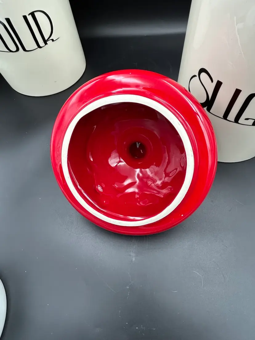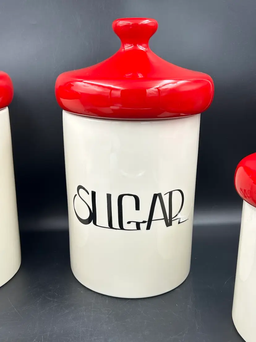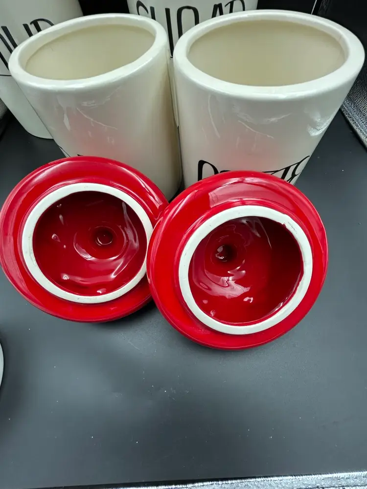 Flower canister has crack in back and small paint glaze chip on lid, see pictures. All other pieces perfect condition. Large – 13 H.x 7.5 W. Smaller – 9.5 H.x 6W