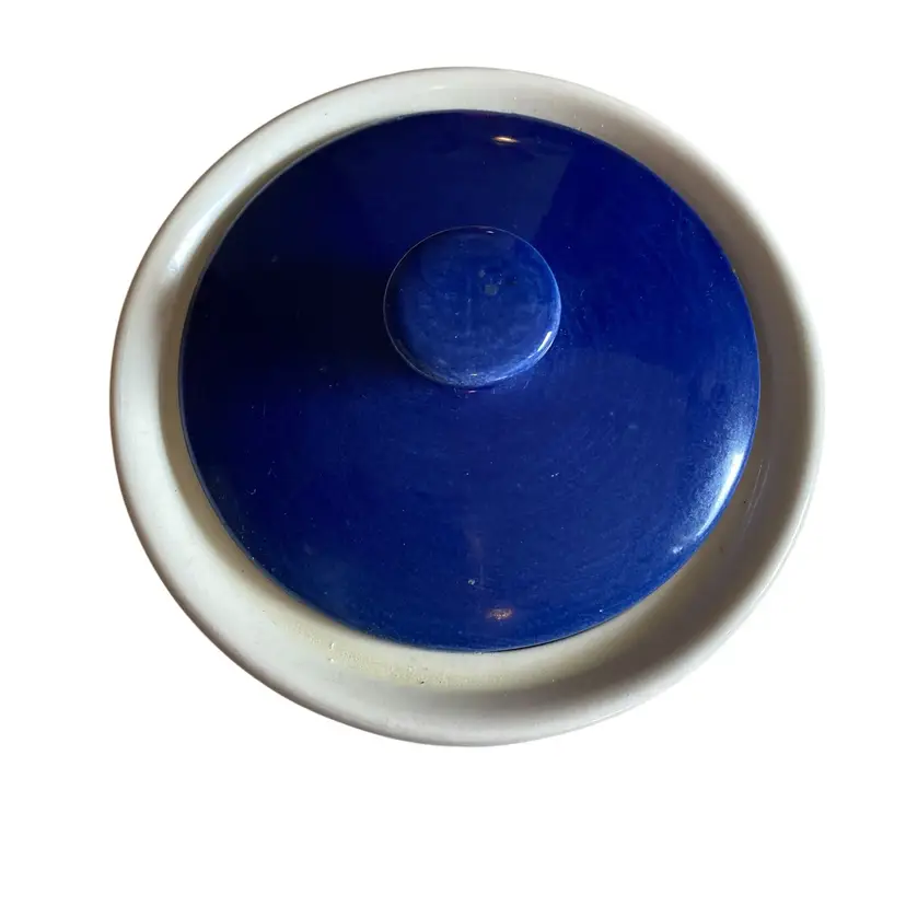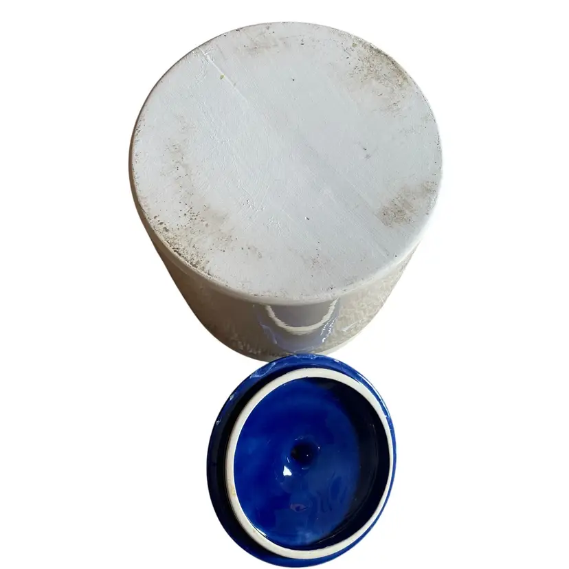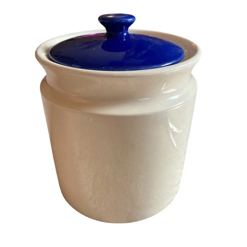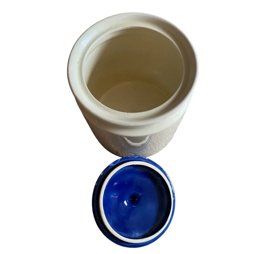 vintage ceramic kitchen canister featuring a blue and white floral pattern, commonly known as a blue onion style crock with lids. Under lid a few chips see pics. 6x5.5