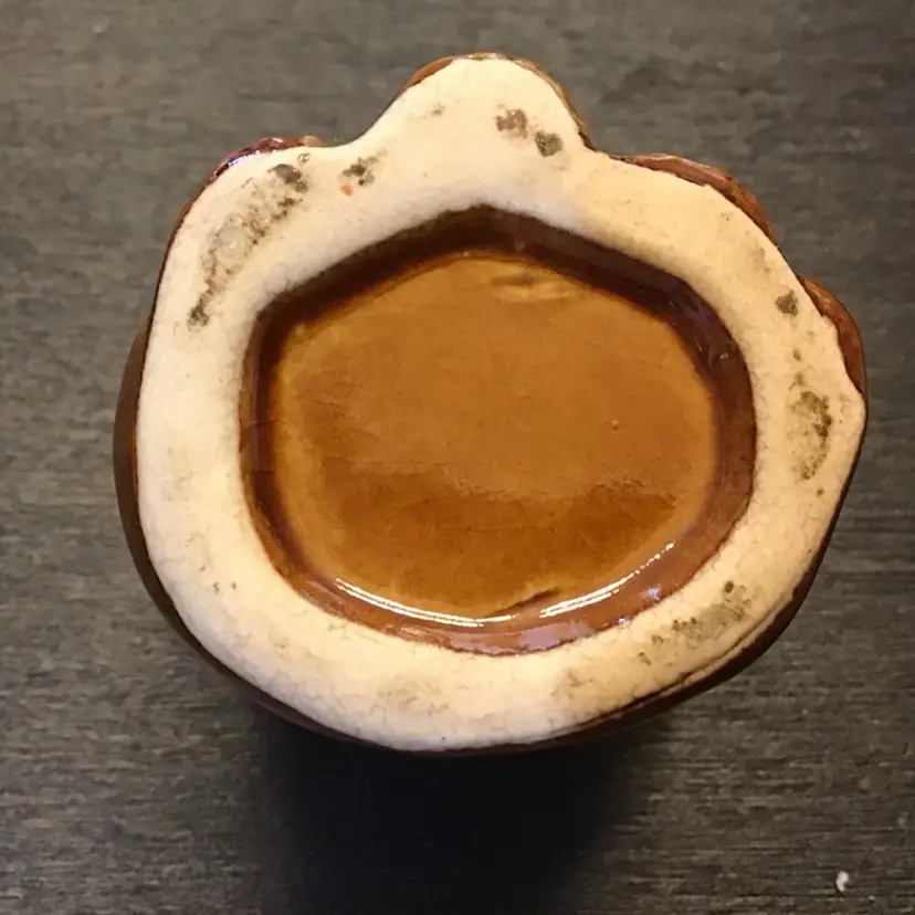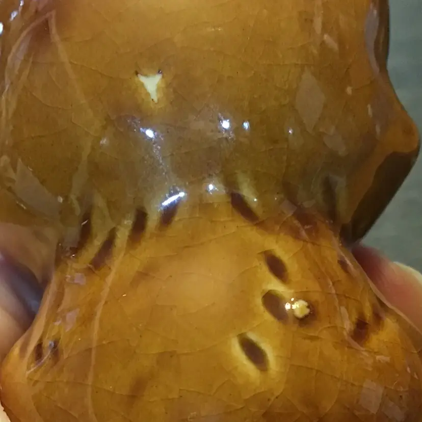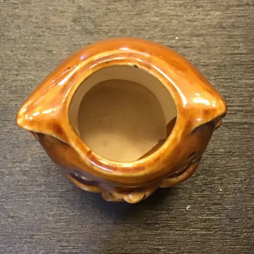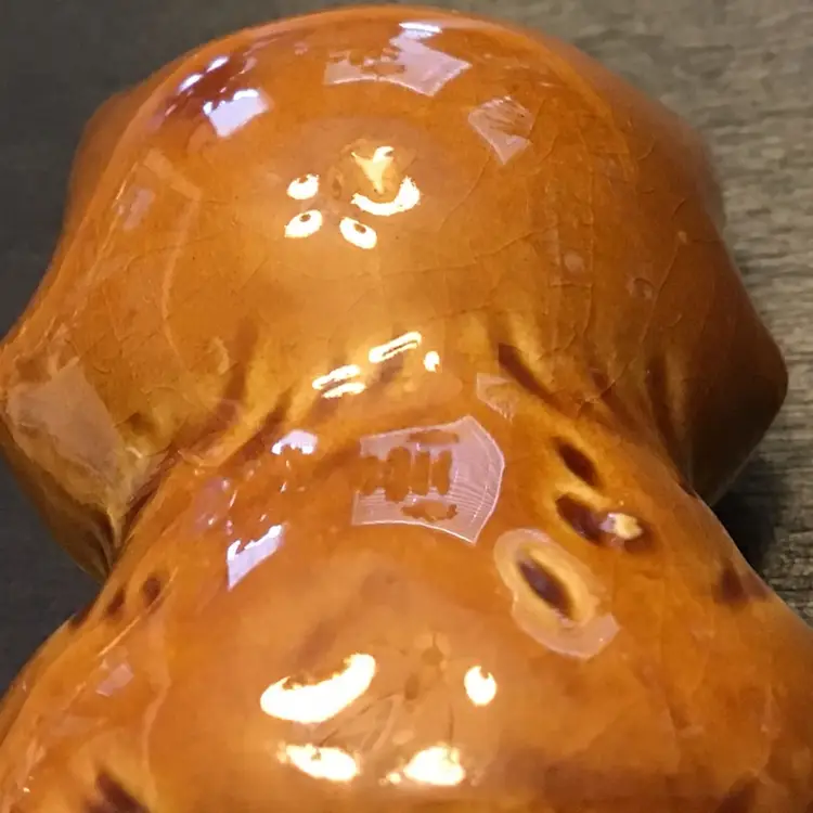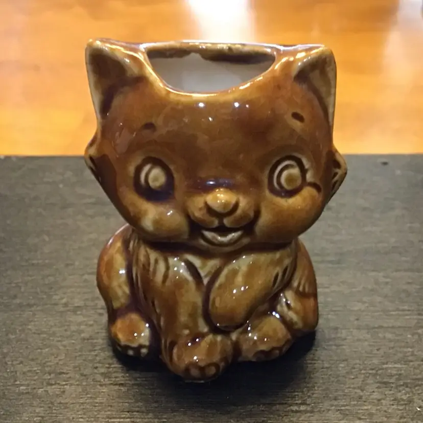 Super cute cat toothpick holder is in great condition. It is small standing at only 2 inches tall. It does show its age with some crazing. There are also two small manufacturers mistakes on the back. One is a missing brown glaze but the clear glaze covers over it. There is also a small bump that shouldn’t be there. The rest of the kitten is great.