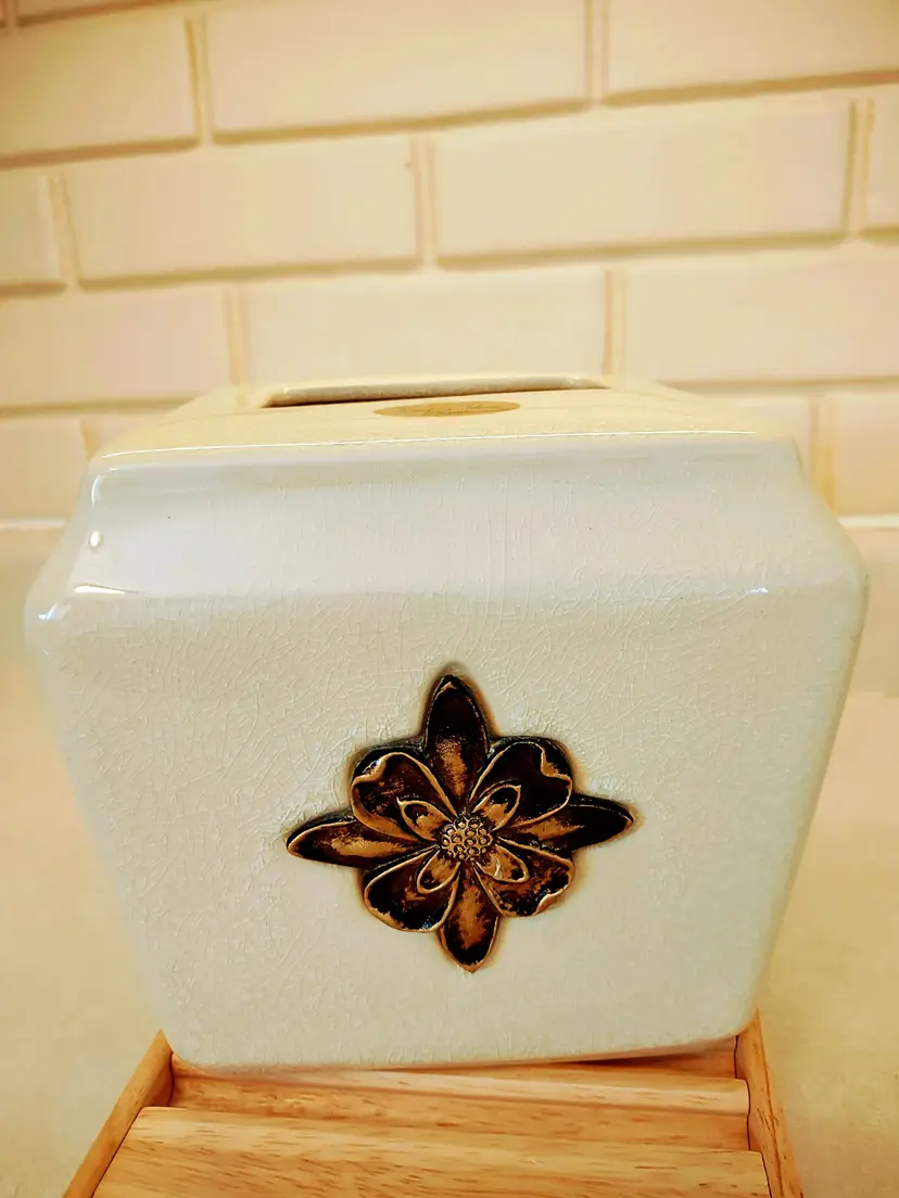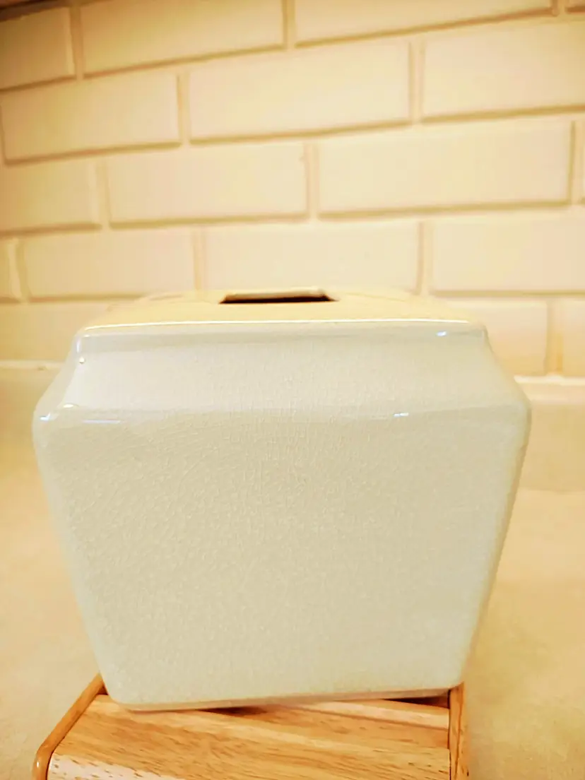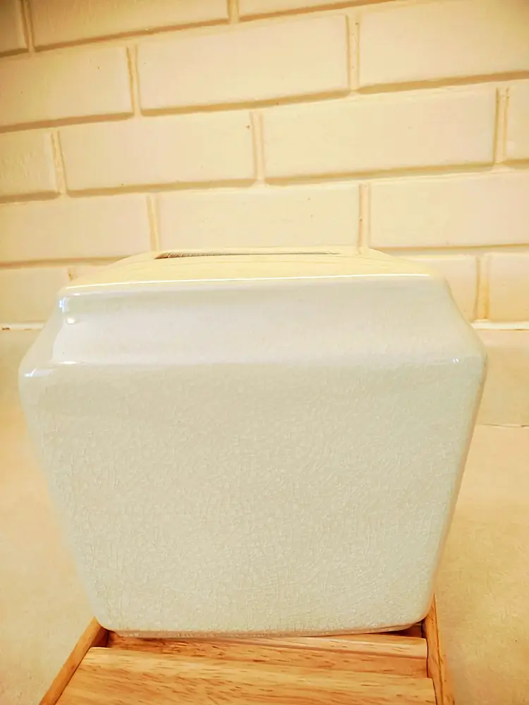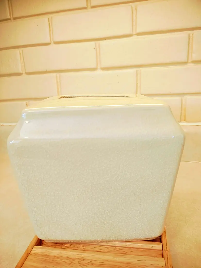 The vintage ceramic Mid Century Tissue box cover by Noni Cohen is a large square-shaped tissue box cover, perfect for the bathroom. Made with a glazed cream ceramic finish, this French Country style piece adds a touch of retro elegance to any space. The unboxed cover is suitable for all occasions and is easy to clean with warm water. This original piece from the mid-20th century is a unique and stylish addition to any bathroom decor.