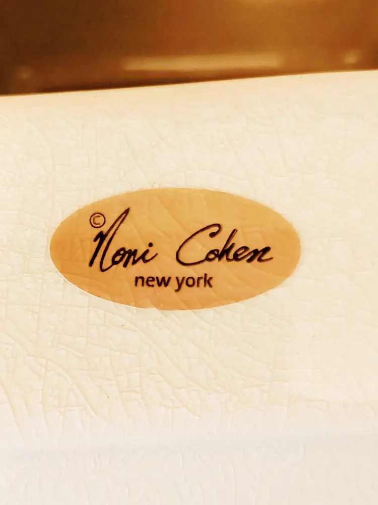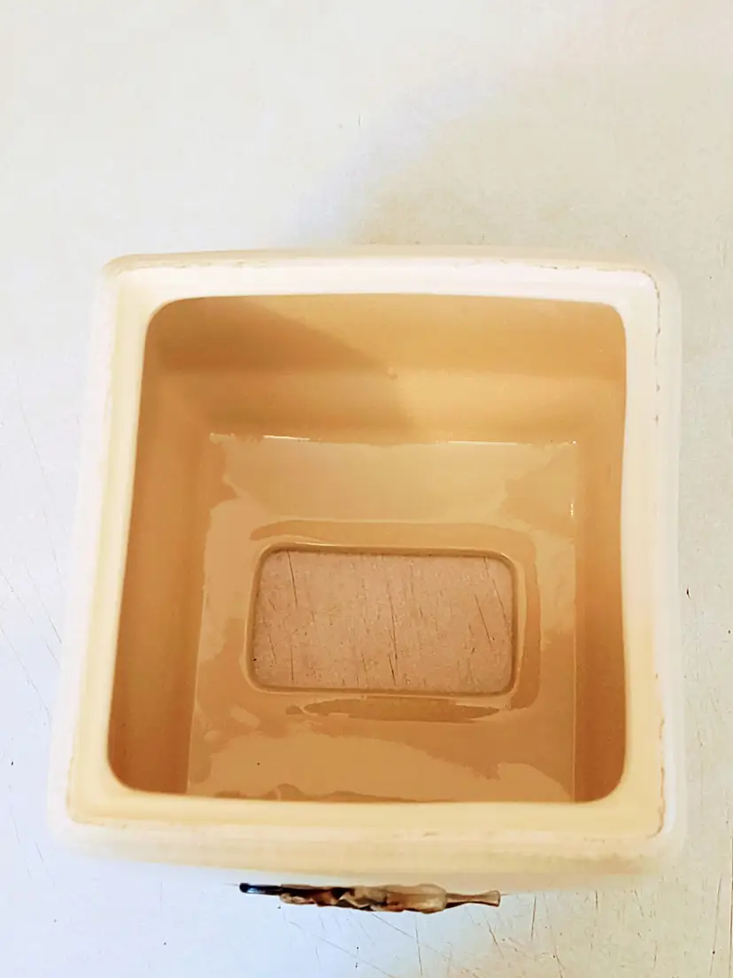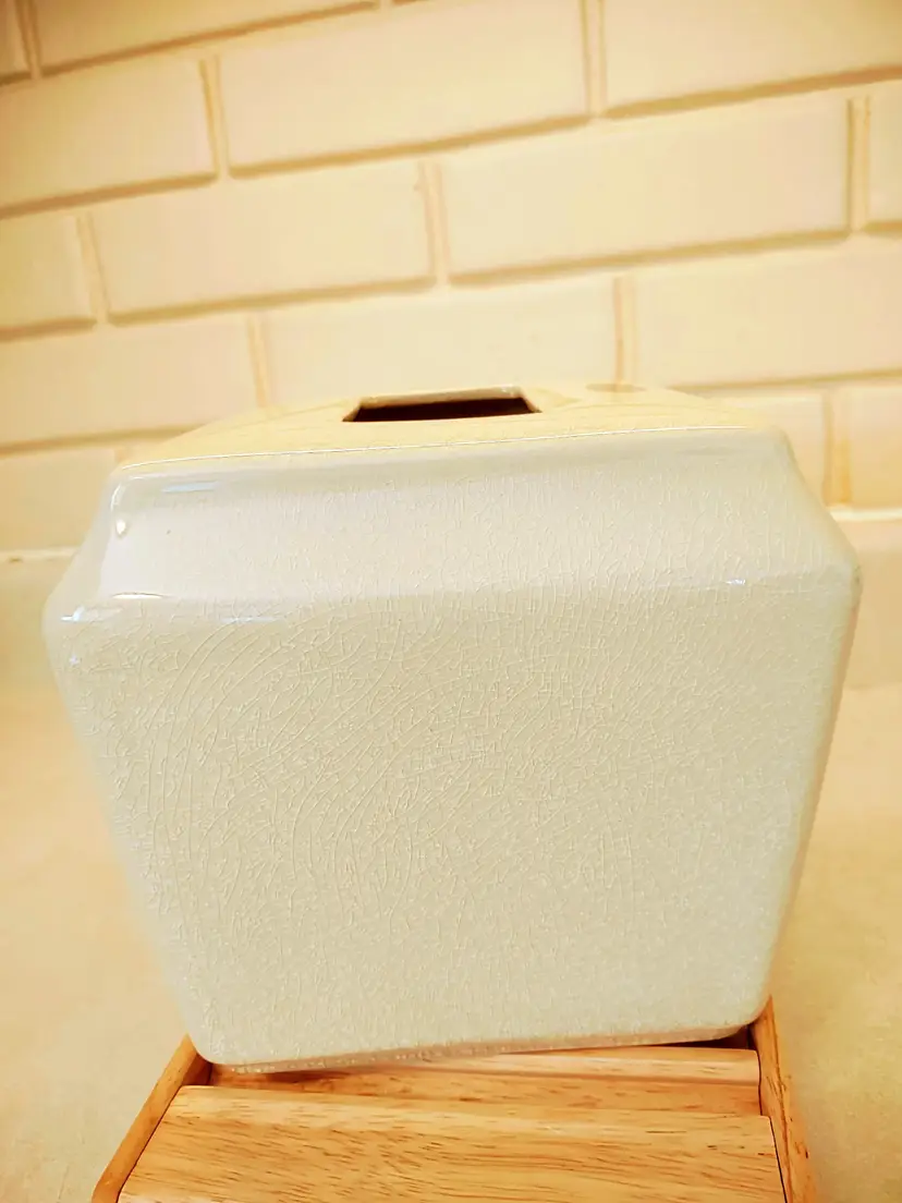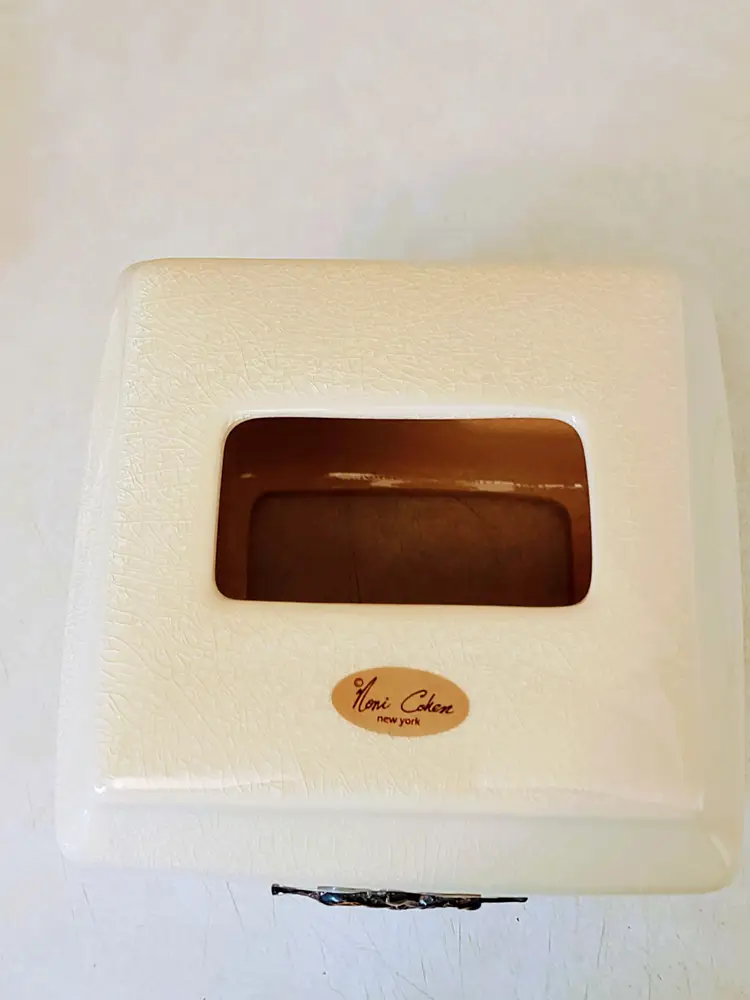 The vintage ceramic Mid Century Tissue box cover by Noni Cohen is a large square-shaped tissue box cover, perfect for the bathroom. Made with a glazed cream ceramic finish, this French Country style piece adds a touch of retro elegance to any space. The unboxed cover is suitable for all occasions and is easy to clean with warm water. This original piece from the mid-20th century is a unique and stylish addition to any bathroom decor.