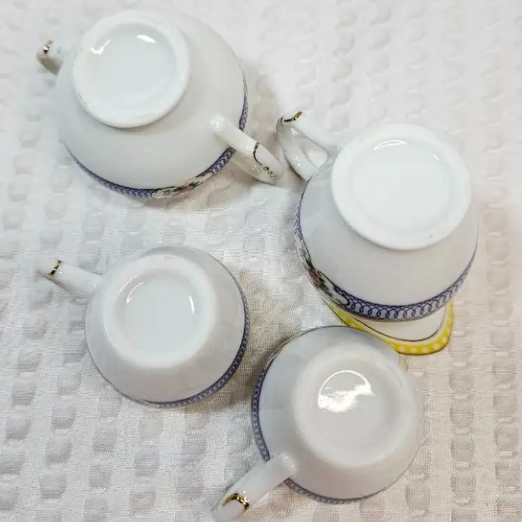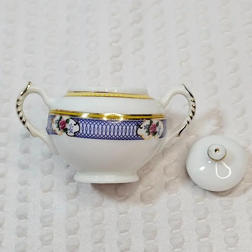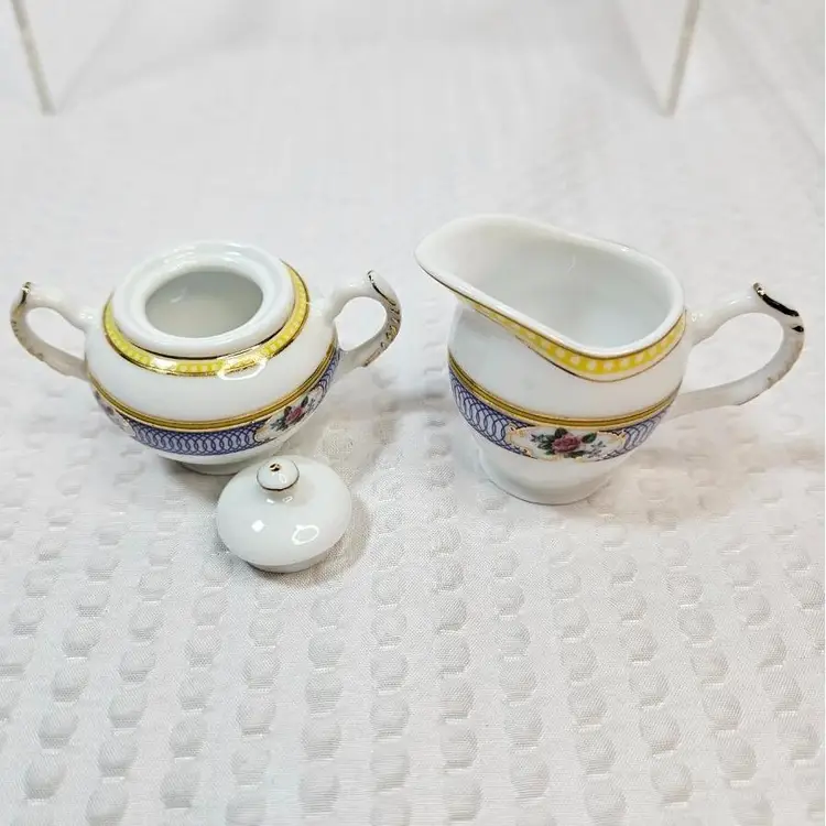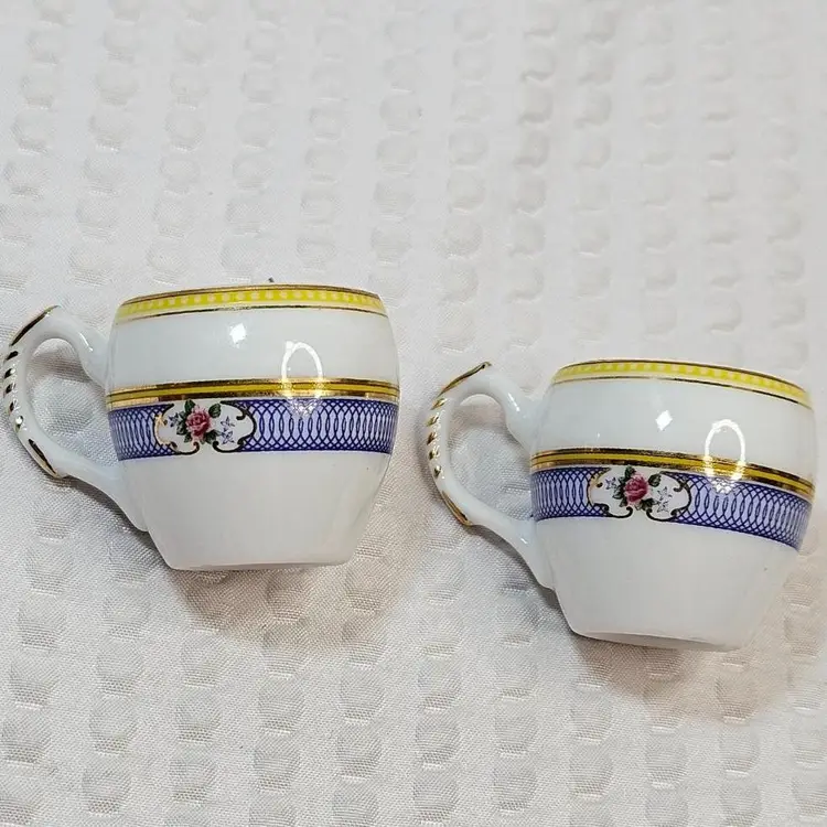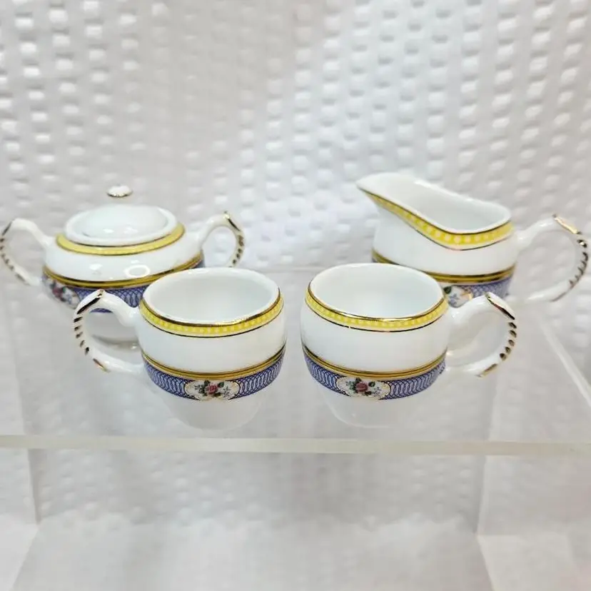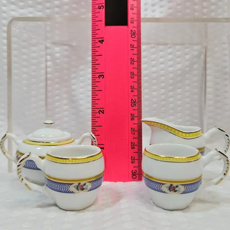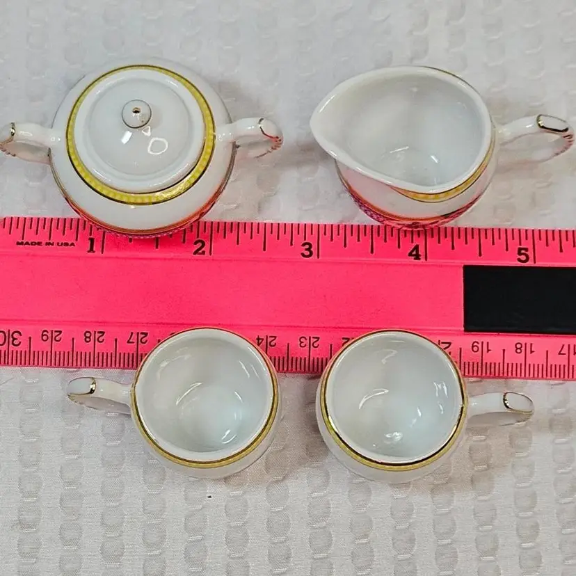 Item in very good condition with little to no signs of wear. Includes 5 pieces pictured. (sugar bowl with lid, creamer and 2 cups) All pieces are unmarked. Creamer measures approximately 1.75 inches tall. Sugar with lid measures approximately 1.75 inches tall. Cups measure approximately 1.25 inches tall. Please examine all photos. Thank you.
