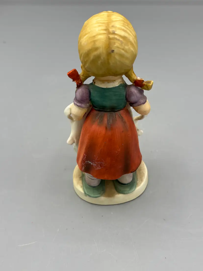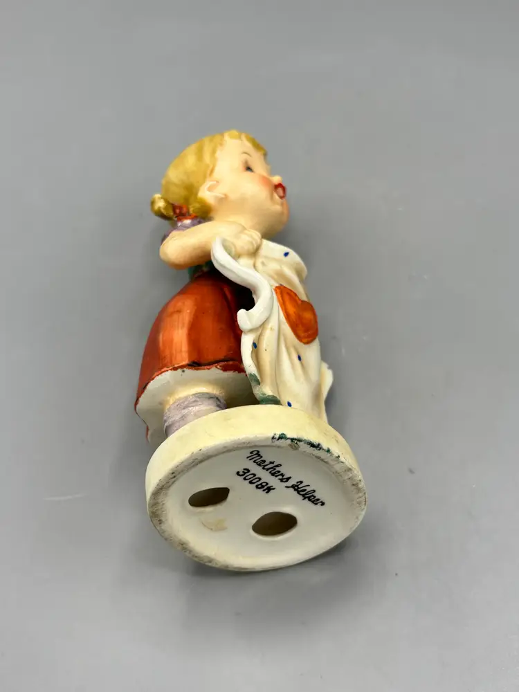 Charming vintage ceramic Mother's Helper figurine with authentic character and patina. This collectible piece shows its age beautifully, with visible wear, flaws, and missing bow and pigtail elements that add to its vintage appeal. Ideal for collectors who appreciate genuine antique charm and historical character.