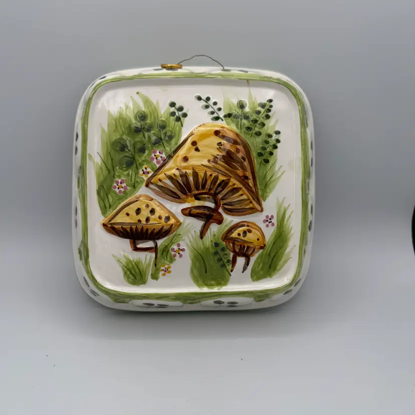 Vintage Mushroom Wall Plaque. Handpainted With Embossed Mushrooms and Flowers. Has Wire For Hanging. No Chips/Cracks. 8.25" X 8.25".