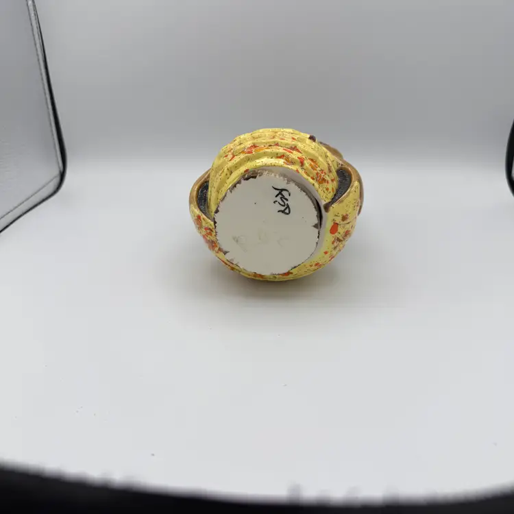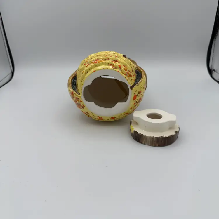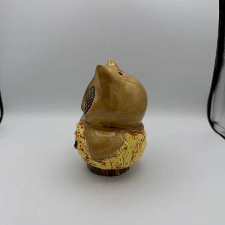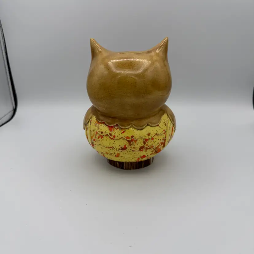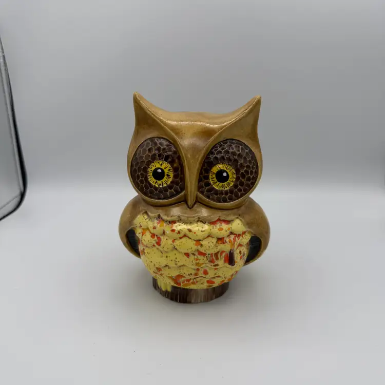 Vintage Ceramic Owl Bank. Has brown, yellow, orange glaze. 1970's. Includes stopper that can be removed to take out money. 6 1/4" Tall. No Chips/Cracks.