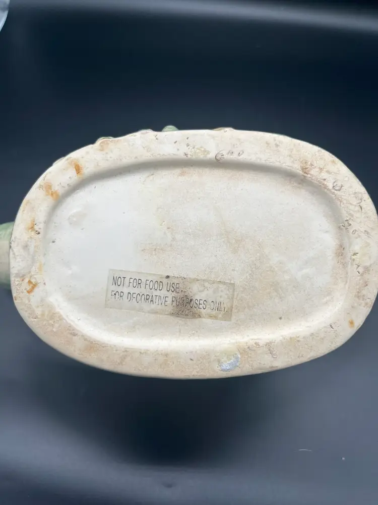 Whimsical ceramic watering call and planter. Sculpted parrot, leaves and blossoms. 8" tall, 12" wide Few missed glaze spots - minor and typical of hand-finished ceramics. No chips or cracks.