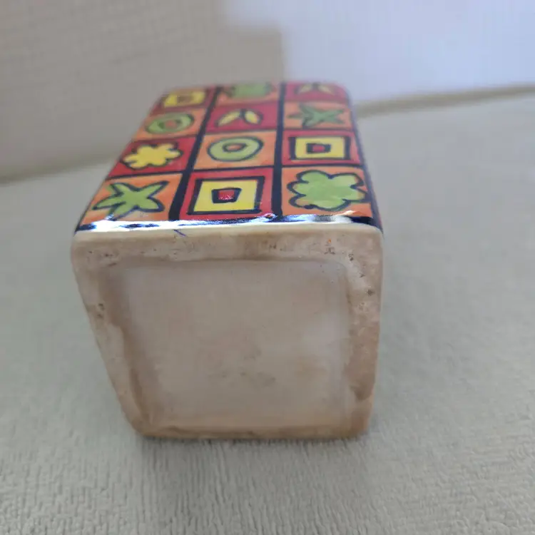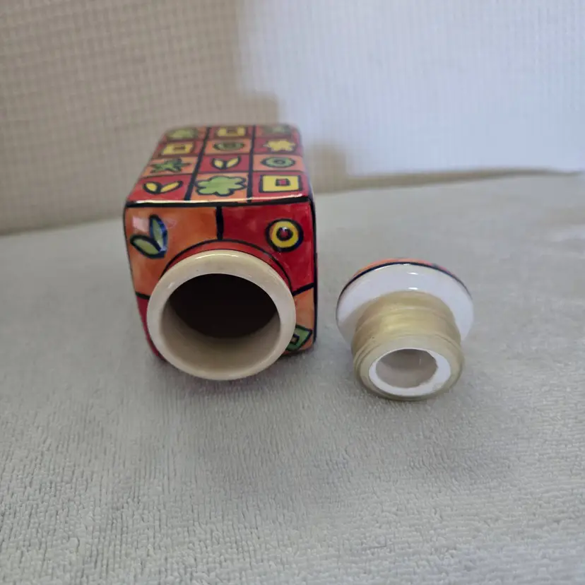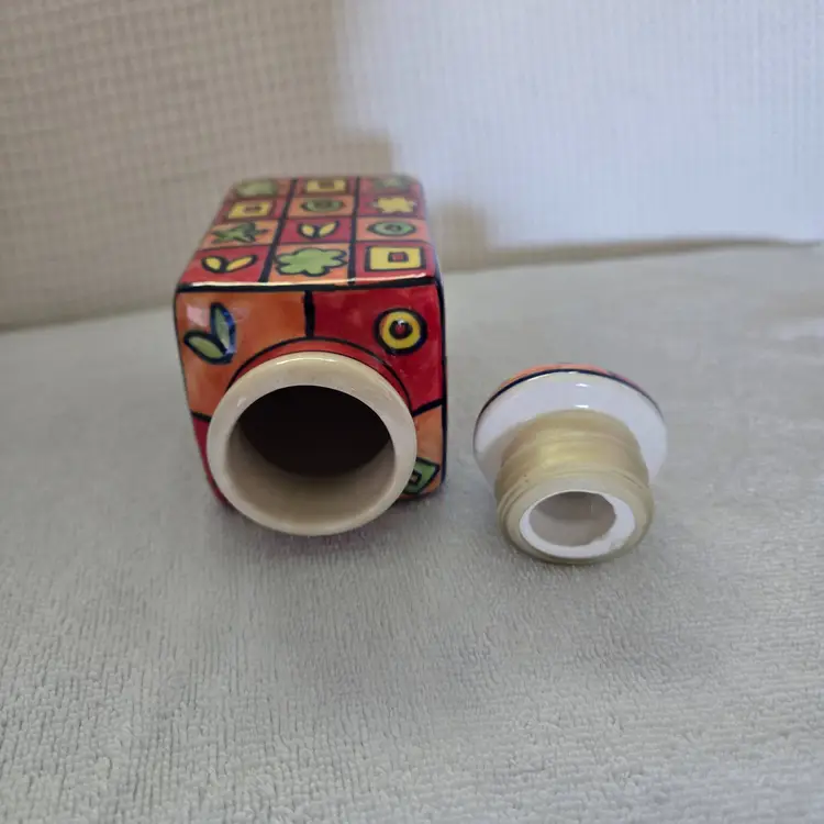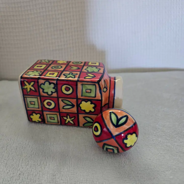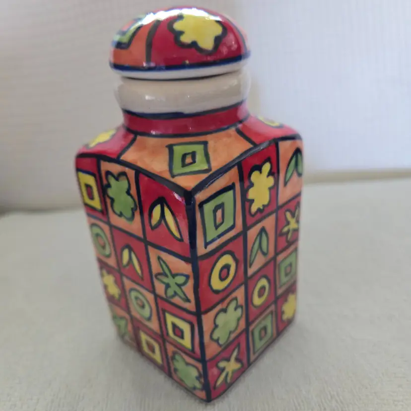 Originally used as a pickle or sauce jar. It is hand made and hand painted. Beautiful reds, orange, green and yellow colors. It measures 5" tall with the lid and 2 1/2" square across the bottom. It would make a great spice jar or condiment container. In excellent condition. Has some craving across the bottom. No chips, cracks, or repairs.
