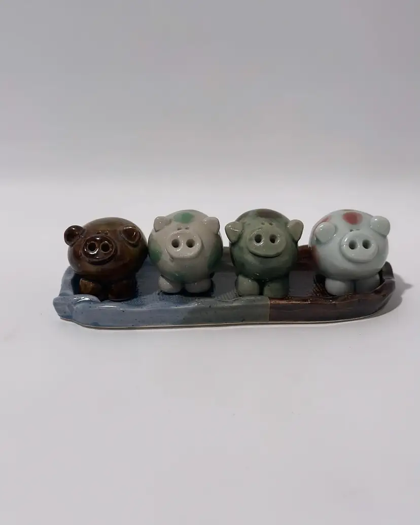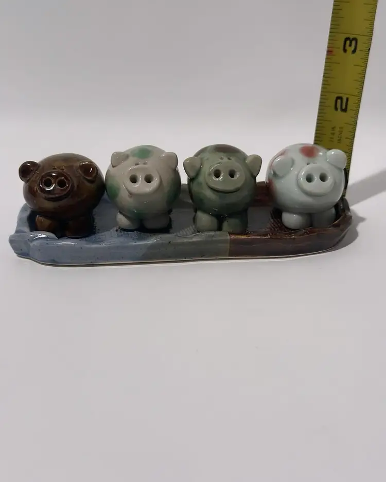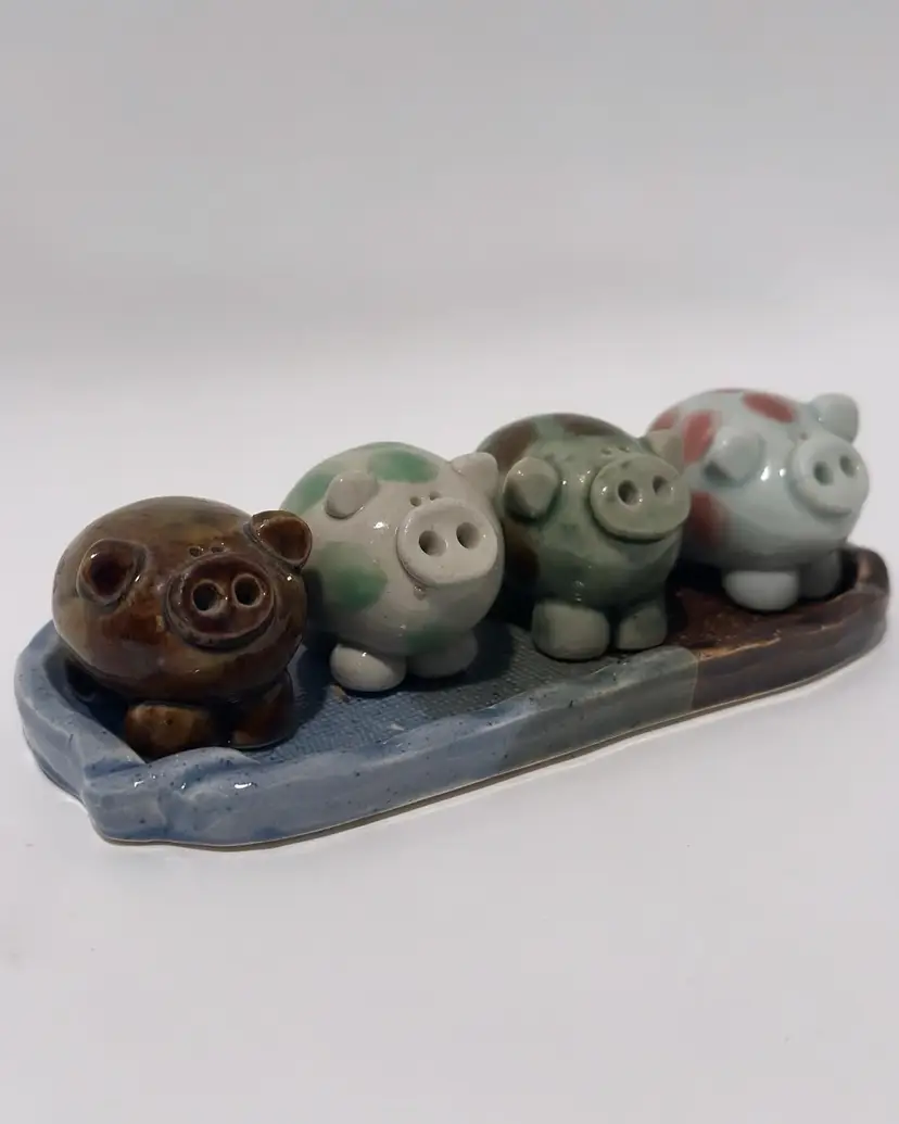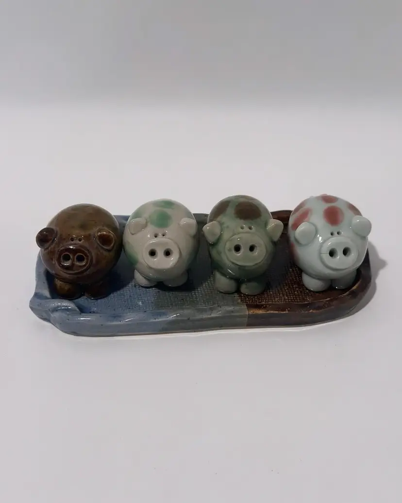 This vintage ceramic pig family of 4 on a tray is a charming addition to any collection or decor. The multicolored spotted pigs are handmade with a glossy finish, and each one is unique.