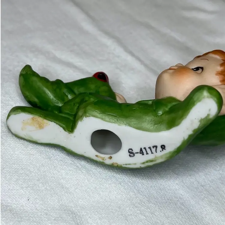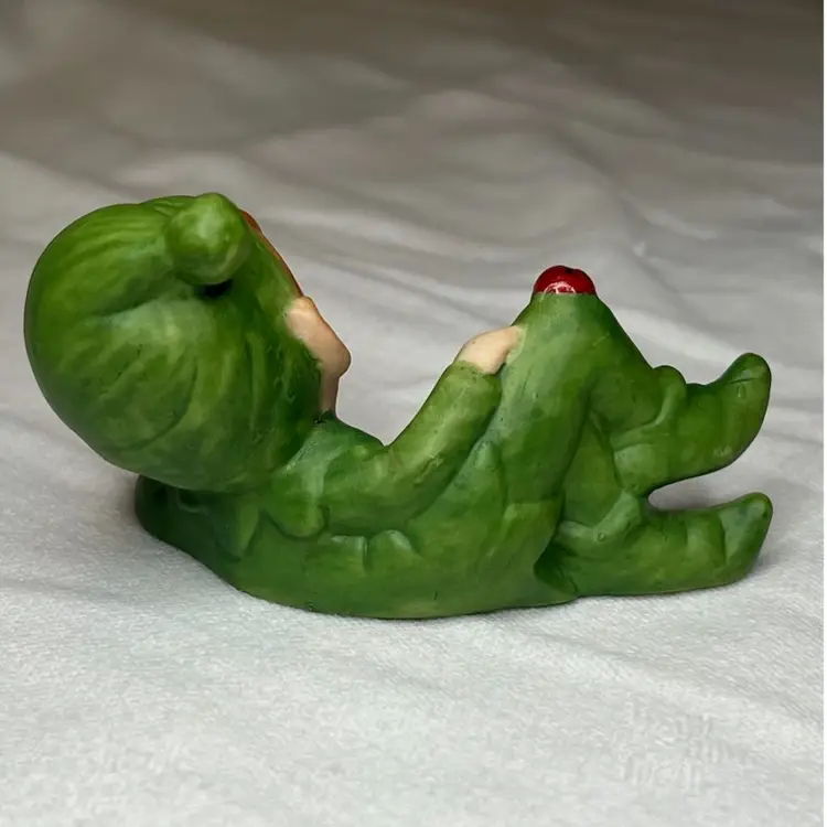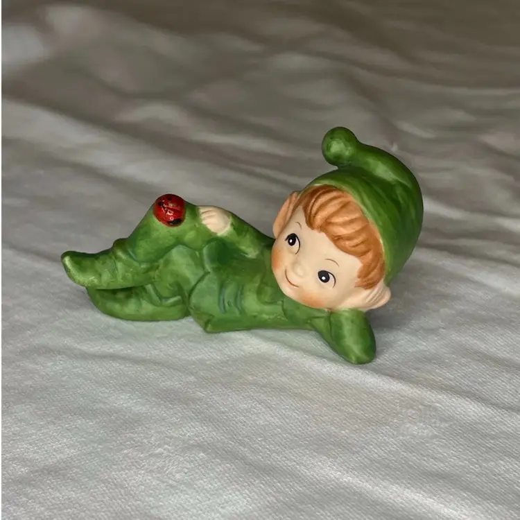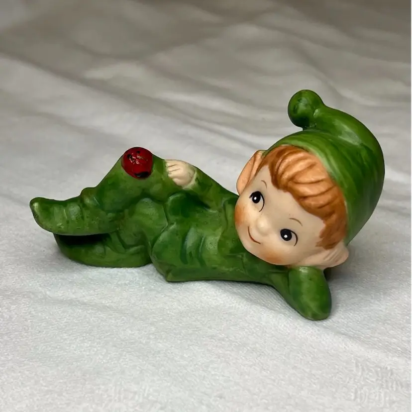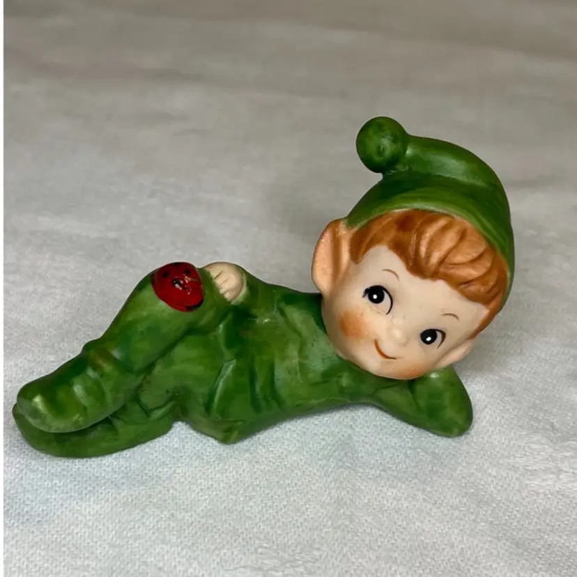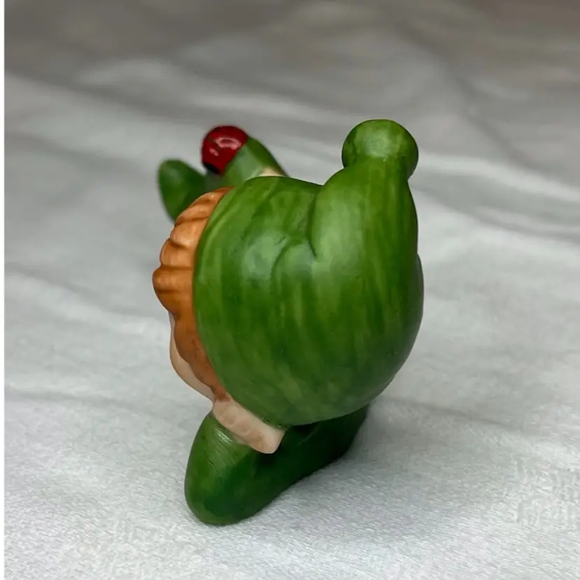 Adorable lounging pixie dressed in green with a lady bug on the knee. Numbered but no maker. Likely Japan. Small 4” x 2.6”.