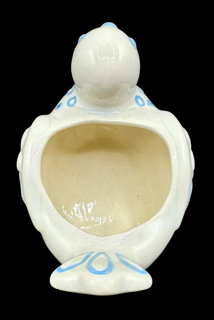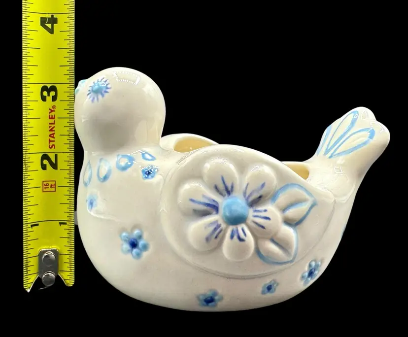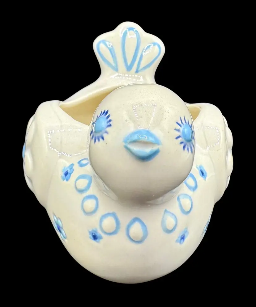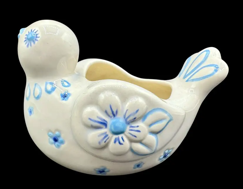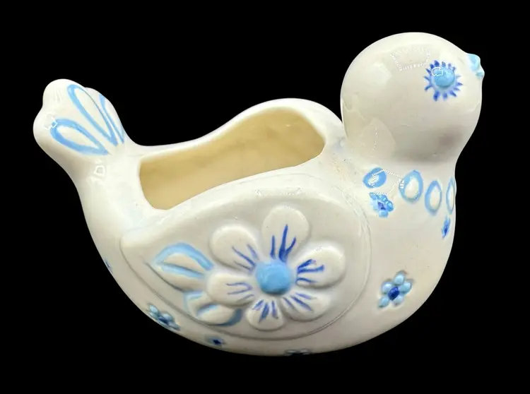 Small ceramic bird planter with blue floral designs. It is marked ‘JJ 84’.