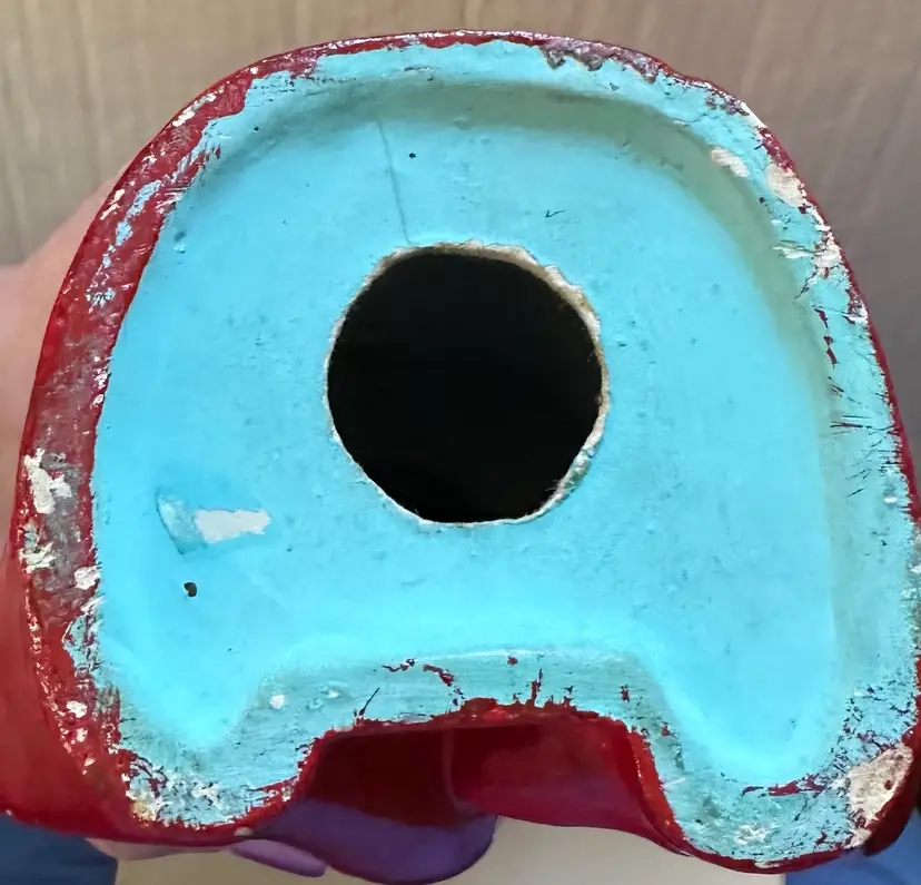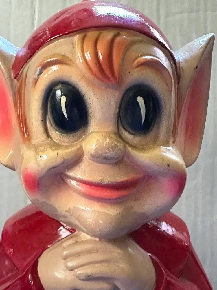 Vintage ceramic elf bank c.1950. He is 10”. His face has paint wear. The plug is missing.