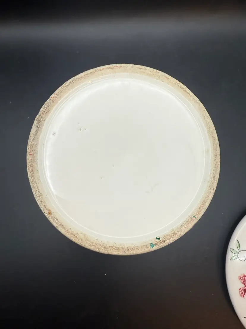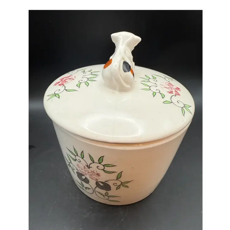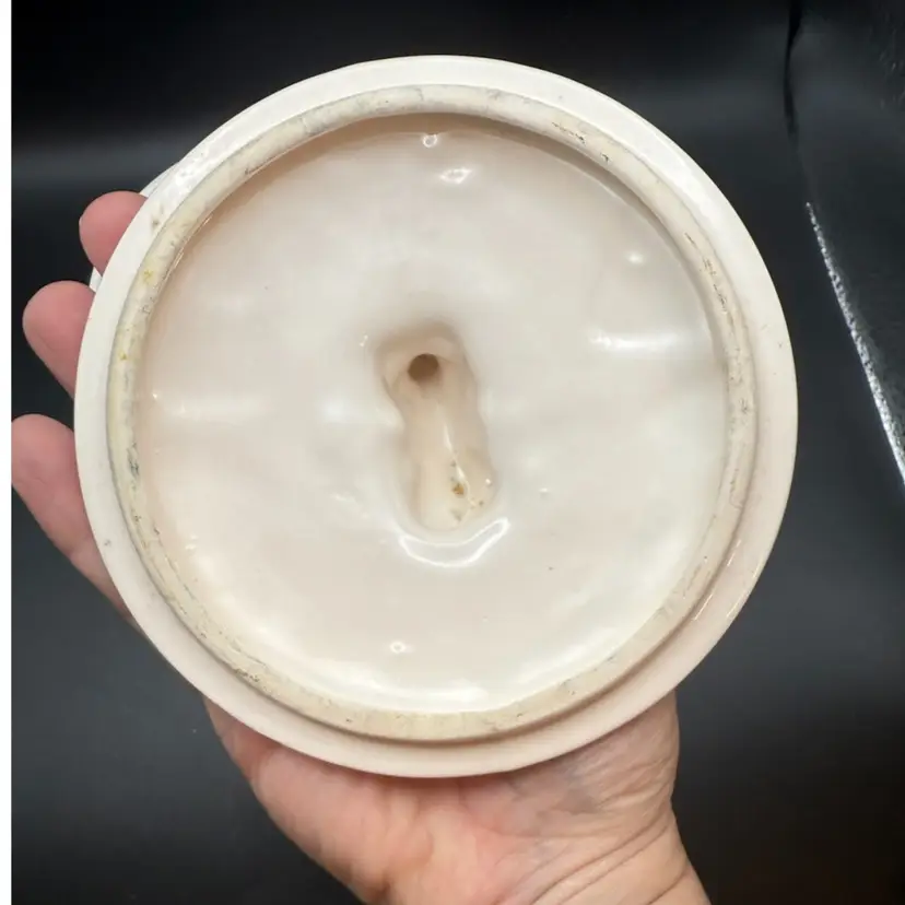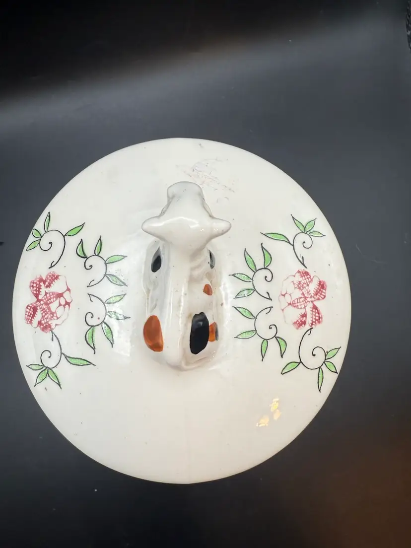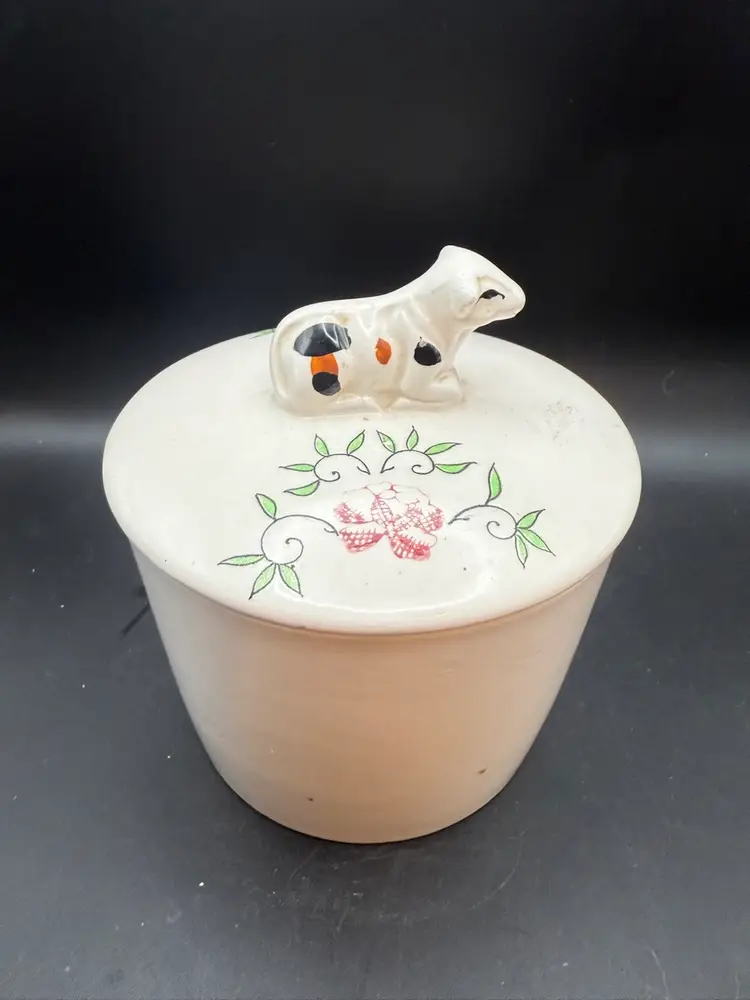 This cute grease jar from about the 1950s has a rooster prominently on the front. A cow sits on top. It was made in Japan and stands 5 1/2 in high to the top of the cows ear.
