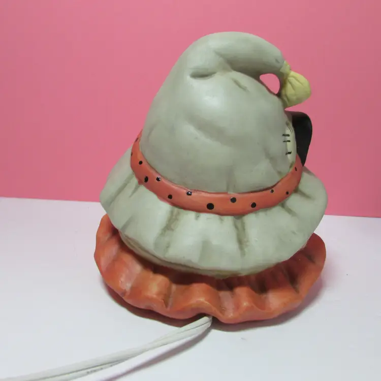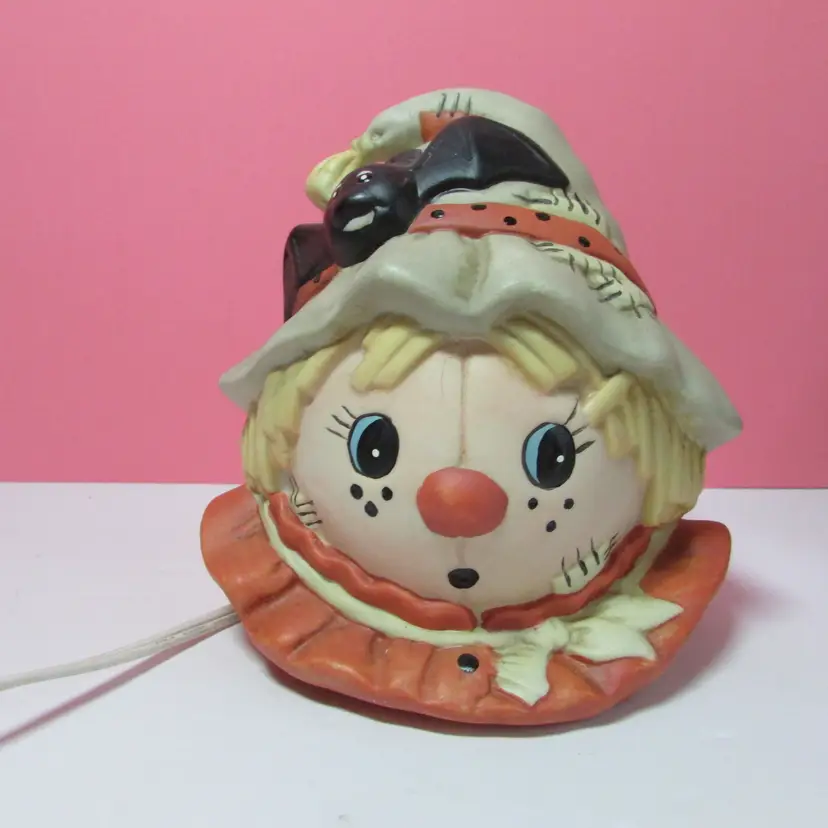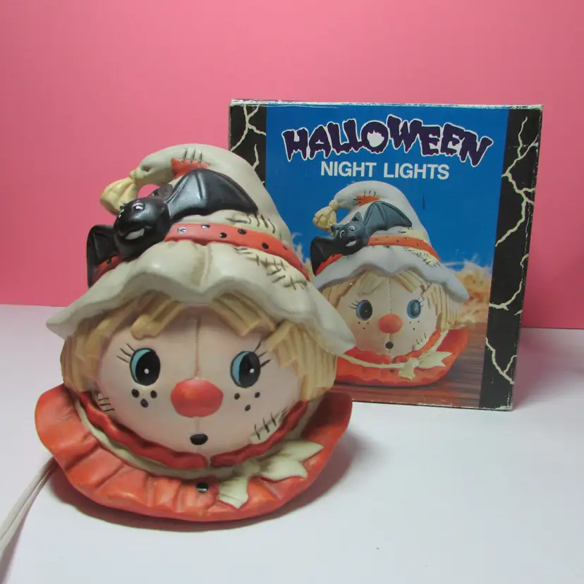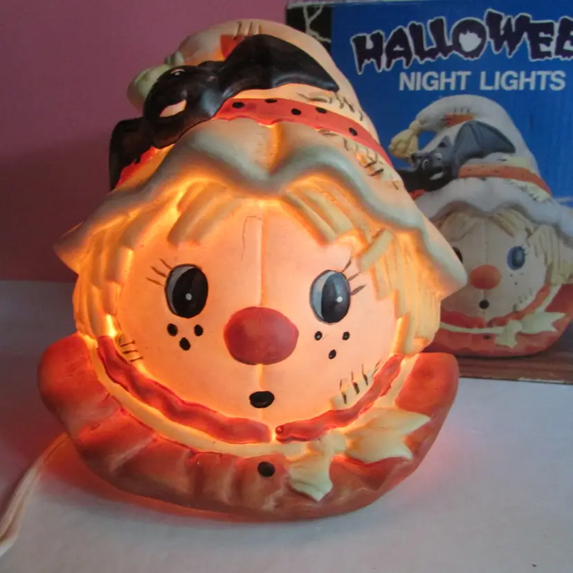 This adorable scarecrow light is in good condition, the box has some wear. The light is about 5 1/2" x 6" x 5". This is shipped from a smoke free home. Thanks for looking!