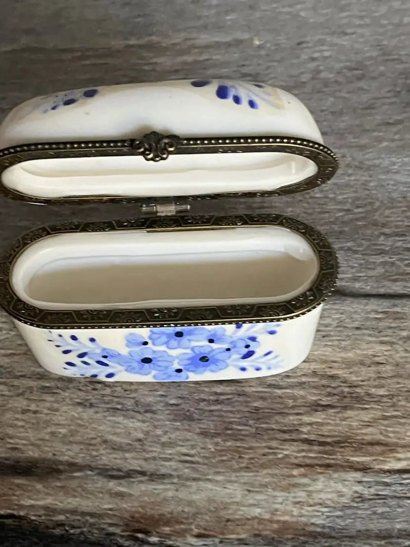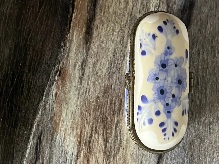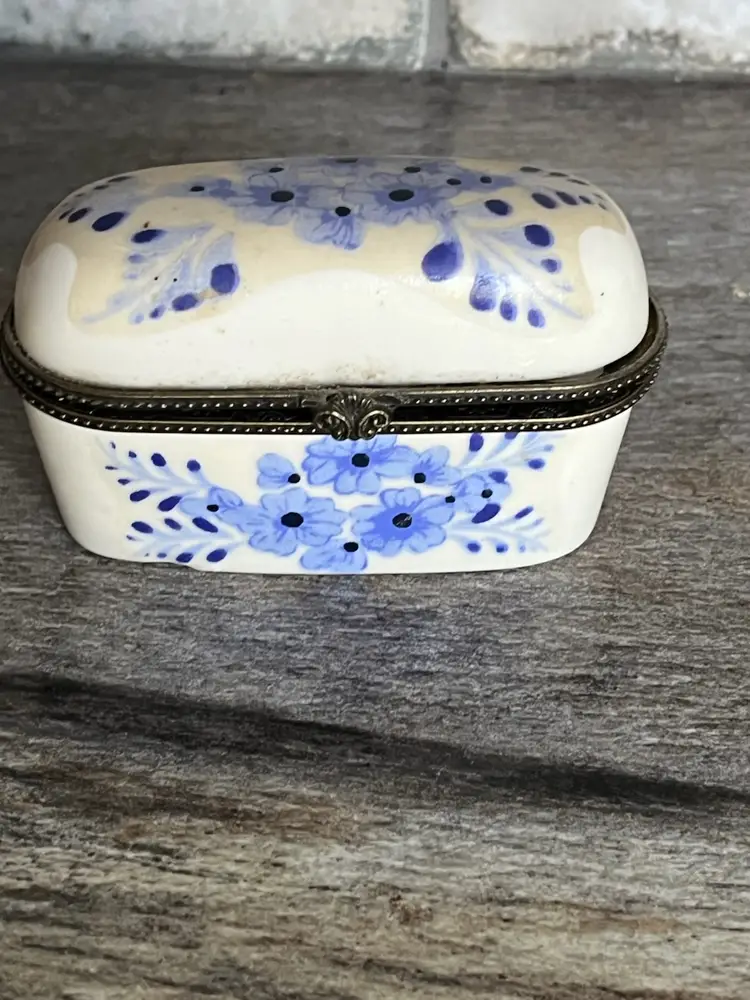 A vintage ceramic sewing needle holder or case. It is off white with blue flower decor. Approximately 3 inches wide and 2 inches deep. No damage.